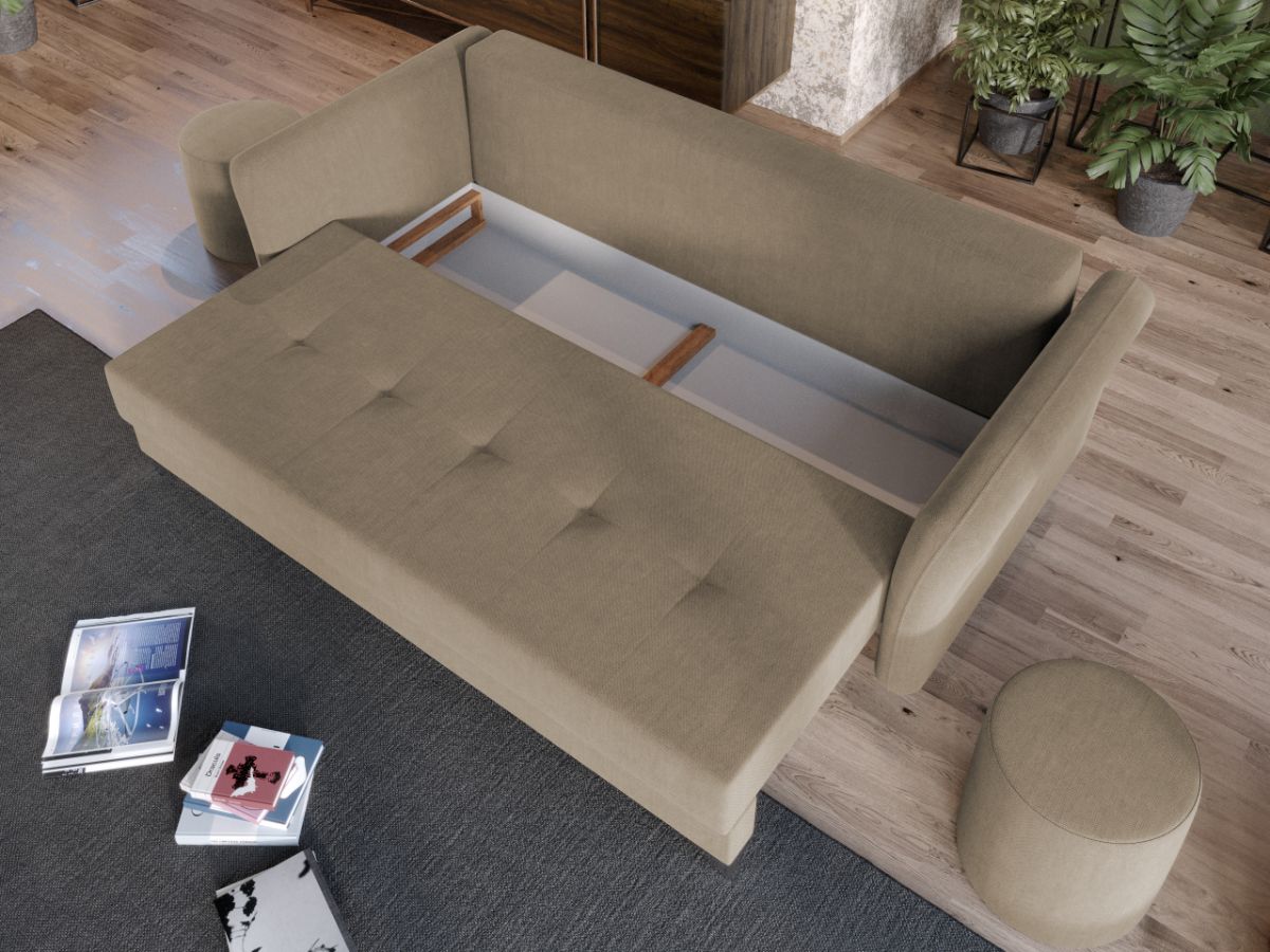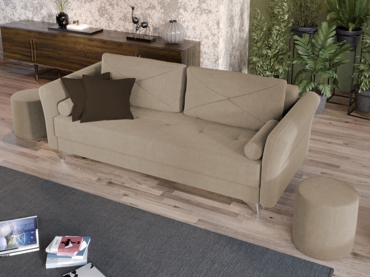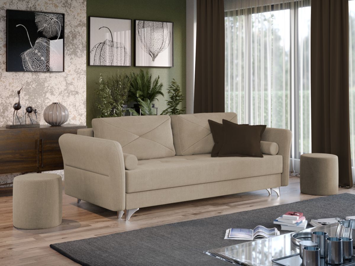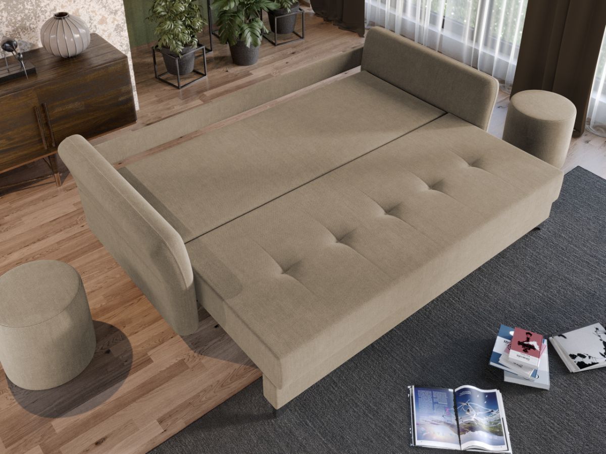 Canapea Bali Crem Canapea Bali Crem are un design modern, contemporan, cu un aspect aparte dat de pernele tip rulou si bratele rotunjite. Picioarele argintii lucioase completeaza eleganta acestei canapele. Pe langa aspect, ofera confort prin cele 4 perne detasabile cat si prin faptul ca se poate transforma rapid intr-un pat ce are lada de depozitare dedesubt. Bratele, sezutul si pernele de la spatar au cusaturi ce dau un design armonios in orice camera. Este recomandata atat pentru incaperi mici sau mari si are dimensiunea de: 230 cm lungime, 100 cm latime, 90 cm inaltime totala . Dupa extindere, obtineti un spatiu pentru odihna si relaxare, cu suprafata utila 193 x 145 cm . Este tapitata cu o stofa de calitate uni pe diverse culori. Atentie:  Pretul afisat nu include alte accesorii sau obiecte de decor. Taburetele, pernele deco si draperiile se pot achizitiona optional. Livrare gratuita si rapida, 4-10 zile lucratoare prin flota proprie Suntem producatori de tapiterii, fara intermediari Toate piesele de tapiterii au o garantie de 2 ani Sezutul si extensia canapelei sunt pe relaxa (arcuri elicoidale si poliuretan) . Lada incorporata este ideala pentru depozitarea lenjeriei sau a altor obiecte. Scheletul este rezistent, realizat pe structura solida de fag si pal. Extensia este de tip Doppelliege ce prezinta un sistem actionat prin role, astfel ca partea de sezut se trage si permite partii de spatar sa gliseze spre partea din fata si sa se pozitioneze orizontal. Canapea Bali Crem se incadreaza cu usurinta in majoritatea locuintelor indiferent de stilul acestora. Puteti alege din mai multe culori pentru stofa. Produsele disponibile le puteti vedea aici Modele Bali . Dimensiuni Canapea Bali Crem Lungime: 230 cm Latime: 100 cm Lungime intre brate: 193 cm Inaltime sezut: 45 cm Adancime sezut: 78 cm (fara perne) Adancime sezut: 57 cm (pana in perne) Inaltime cu perne: 90 cm Inaltime fara perne: 74 cm Dimensiuni extinsa Lungime extinsa: 193 cm Adancime extinsa: 145 cm Dimensiuni brate Inaltime brate: 70 cm Lungime brate: 100 cm Tapiterie Canapea Bali Crem Tapiteria produsului este din stofa Crem . Nuanta acestui produs nu este pretentioasa, mascheaza eventualele evenimente neplacute prin care se poate murdari sau pata si se integreaza perfect in majoritatea locuintelor. Intretinere: se recomanda ca praful sa se stearga cu un material textil moale (finet) umed si sa nu se curete cu agenti chimici (diluant, acetona). Imaginile sunt cu titlu de prezentare si pot avea mici diferente de nuante in functie de display. Dimensiunile sunt exprimate în centimetri si pot oscila între ± 50 mm.