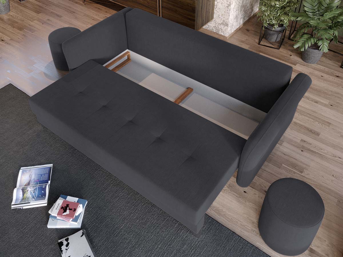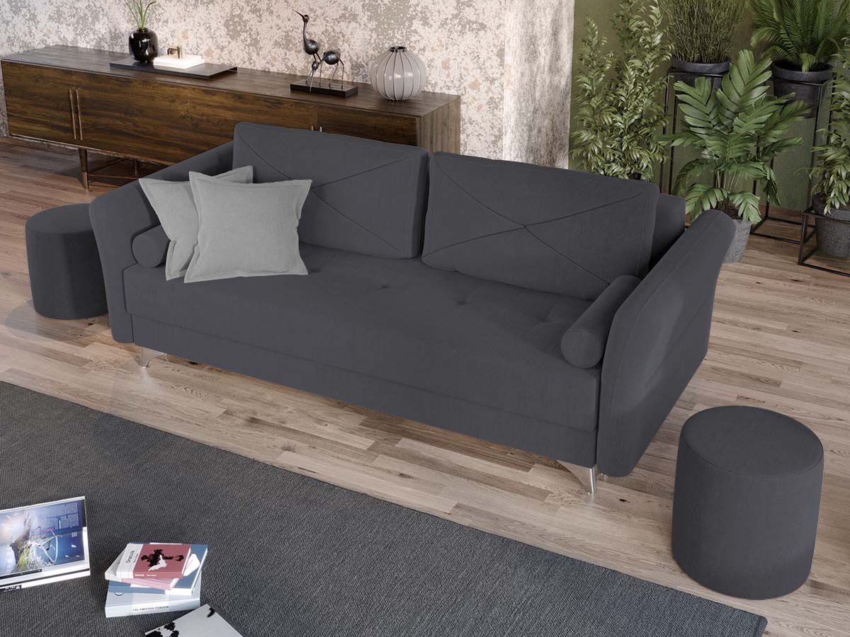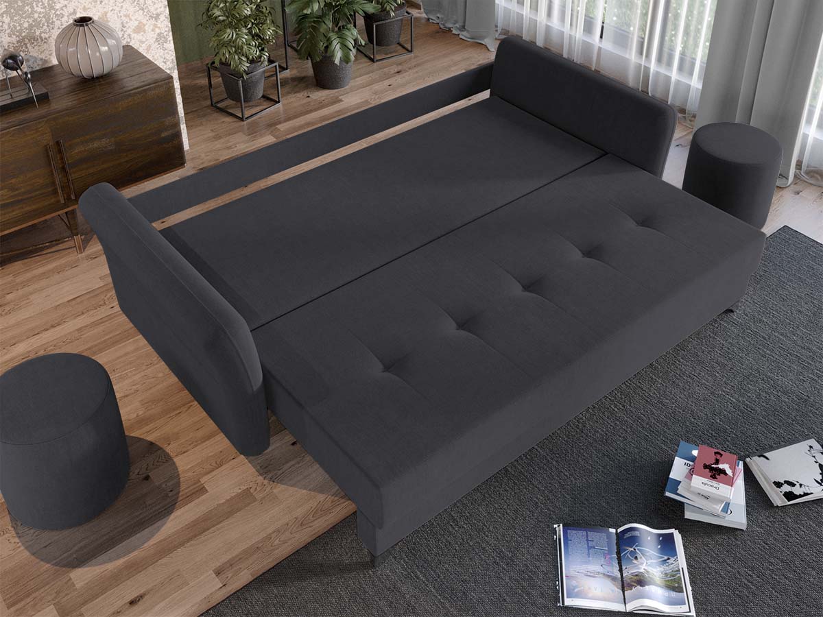 Canapea Bali Gri Canapea Bali Gri are un design modern, contemporan, cu un aspect aparte dat de pernele tip rulou si bratele rotunjite. Picioarele argintii lucioase completeaza eleganta acestei canapele. Pe langa aspect, ofera confort prin cele 4 perne detasabile cat si prin faptul ca se poate transforma rapid intr-un pat ce are lada de depozitare dedesubt. Bratele, sezutul si pernele de la spatar au cusaturi ce dau un design armonios in orice camera. Este recomandata atat pentru incaperi mici sau mari si are dimensiunea de: 230 cm lungime, 100 cm latime, 90 cm inaltime totala . Dupa extindere, obtineti un spatiu pentru odihna si relaxare, cu suprafata utila 193 x 145 cm . Este tapitata cu o stofa de calitate uni pe diverse culori. Atentie:  Pretul afisat nu include alte accesorii sau obiecte de decor. Taburetele, pernele deco si draperiile se pot achizitiona optional. Livrare gratuita si rapida, 4-10 zile lucratoare prin flota proprie Suntem producatori de tapiterii, fara intermediari Toate piesele de tapiterii au o garantie de 2 ani Sezutul si extensia canapelei sunt pe relaxa (arcuri elicoidale si poliuretan) . Lada incorporata este ideala pentru depozitarea lenjeriei sau a altor obiecte. Scheletul este rezistent, realizat pe structura solida de fag si pal. Extensia este de tip Doppelliege ce prezinta un sistem actionat prin role, astfel ca partea de sezut se trage si permite partii de spatar sa gliseze spre partea din fata si sa se pozitioneze orizontal. Canapea Bali Gri se incadreaza cu usurinta in majoritatea locuintelor indiferent de stilul acestora. Puteti alege din mai multe culori pentru stofa. Produsele disponibile le puteti vedea aici Modele Bali . Dimensiuni Canapea Bali Gri Lungime: 230 cm Latime: 100 cm Lungime intre brate: 193 cm Inaltime sezut: 45 cm Adancime sezut: 78 cm (fara perne) Adancime sezut: 57 cm (pana in perne) Inaltime cu perne: 90 cm Inaltime fara perne: 74 cm Dimensiuni extinsa Lungime extinsa: 193 cm Adancime extinsa: 145 cm Dimensiuni brate Inaltime brate: 70 cm Lungime brate: 100 cm Tapiterie Canapea Bali Gri Tapiteria produsului este din stofa Gri . Nuanta acestui produs nu este pretentioasa, mascheaza eventualele evenimente neplacute prin care se poate murdari sau pata si se integreaza perfect in majoritatea locuintelor. Intretinere: se recomanda ca praful sa se stearga cu un material textil moale (finet) umed si sa nu se curete cu agenti chimici (diluant, acetona). Imaginile sunt cu titlu de prezentare si pot avea mici diferente de nuante in functie de display. Dimensiunile sunt exprimate în centimetri si pot oscila între ± 50 mm.