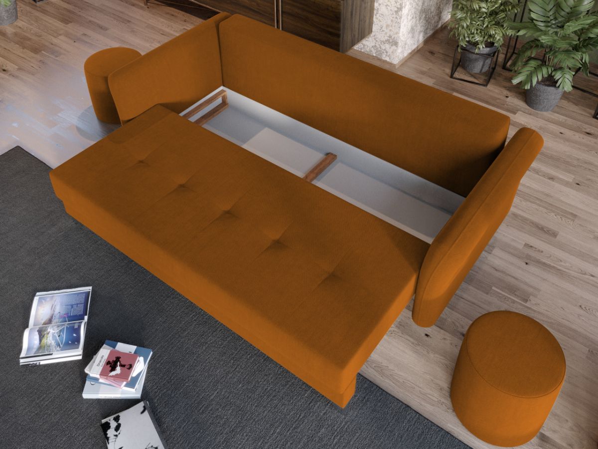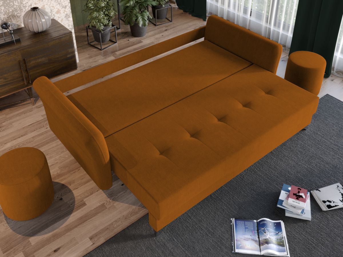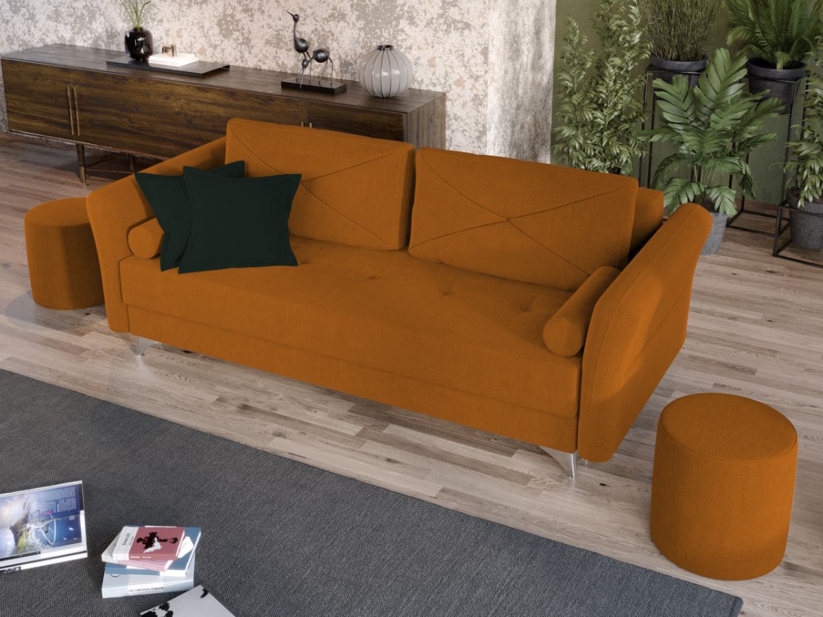 Canapea Bali Portocalie Canapea Bali Portocalie are un design modern, contemporan, cu un aspect aparte dat de pernele tip rulou si bratele rotunjite. Picioarele argintii lucioase completeaza eleganta acestei canapele. Pe langa aspect, ofera confort prin cele 4 perne detasabile cat si prin faptul ca se poate transforma rapid intr-un pat ce are lada de depozitare dedesubt. Bratele, sezutul si pernele de la spatar au cusaturi ce dau un design armonios in orice camera. Este recomandata atat pentru incaperi mici sau mari si are dimensiunea de: 230 cm lungime, 100 cm latime, 90 cm inaltime totala . Dupa extindere, obtineti un spatiu pentru odihna si relaxare, cu suprafata utila 193 x 145 cm . Este tapitata cu o stofa de calitate uni pe diverse culori. Atentie: Pretul afisat nu include alte accesorii sau obiecte de decor. Taburetele, pernele deco si draperiile se pot achizitiona optional. Livrare gratuita si rapida, 4-10 zile lucratoare prin flota proprie Suntem producatori de tapiterii, fara intermediari Toate piesele de tapiterii au o garantie de 2 ani Sezutul si extensia canapelei sunt pe relaxa (arcuri elicoidale si poliuretan) . Lada incorporata este ideala pentru depozitarea lenjeriei sau a altor obiecte. Scheletul este rezistent, realizat pe structura solida de fag si pal. Extensia este de tip Doppelliege ce prezinta un sistem actionat prin role, astfel ca partea de sezut se trage si permite partii de spatar sa gliseze spre partea din fata si sa se pozitioneze orizontal. Canapea Bali Portocalie se incadreaza cu usurinta in majoritatea locuintelor indiferent de stilul acestora. Puteti alege din mai multe culori pentru stofa. Produsele disponibile le puteti vedea aici Modele Bali . Dimensiuni Canapea Bali Portocalie Lungime: 230 cm Latime: 100 cm Lungime intre brate: 193 cm Inaltime sezut: 45 cm Adancime sezut: 78 cm (fara perne) Adancime sezut: 57 cm (pana in perne) Inaltime cu perne: 90 cm Inaltime fara perne: 74 cm Dimensiuni extinsa Lungime extinsa: 193 cm Adancime extinsa: 145 cm Dimensiuni brate Inaltime brate: 70 cm Lungime brate: 100 cm Tapiterie Canapea Bali Portocalie Tapiteria produsului este din stofa Portocalie . Nuanta acestui produs nu este pretentioasa, mascheaza eventualele evenimente neplacute prin care se poate murdari sau pata si se integreaza perfect in majoritatea locuintelor. Intretinere: se recomanda ca praful sa se stearga cu un material textil moale (finet) umed si sa nu se curete cu agenti chimici (diluant, acetona). Imaginile sunt cu titlu de prezentare si pot avea mici diferente de nuante in functie de display. Dimensiunile sunt exprimate în centimetri si pot oscila între ± 50 mm.