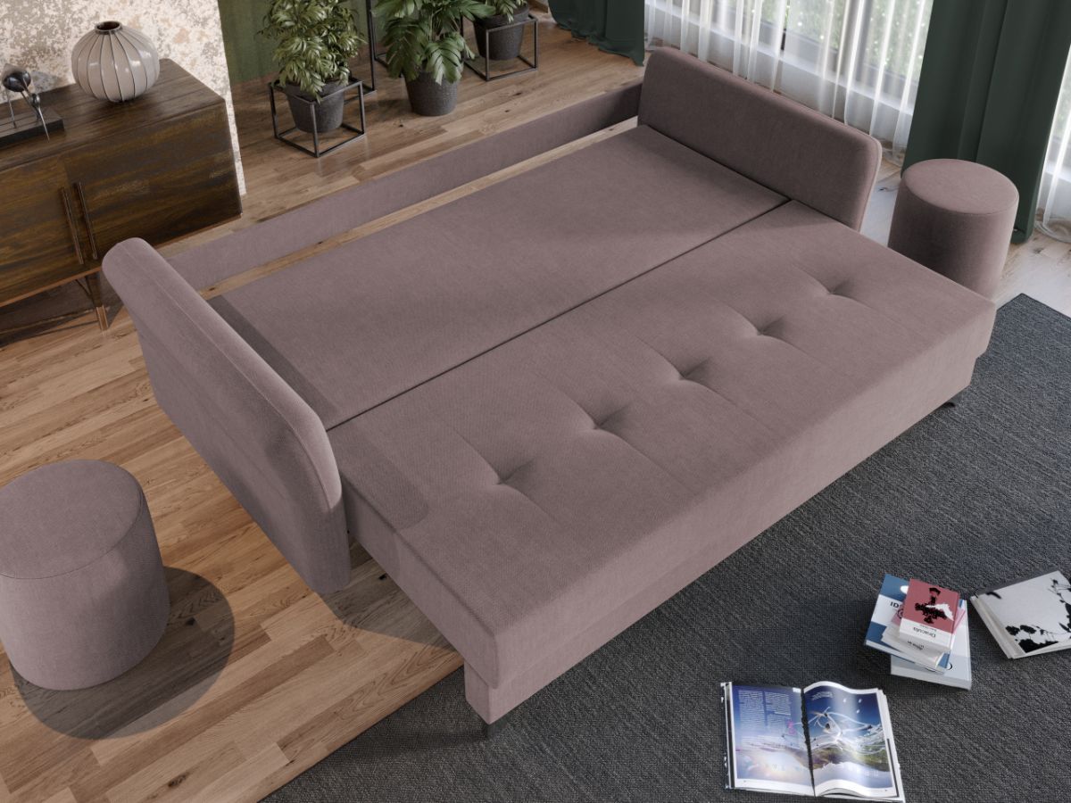 Canapea Bali Roz Pudrat Canapea Bali Roz Pudrat are un design modern, contemporan, cu un aspect aparte dat de pernele tip rulou si bratele rotunjite. Picioarele argintii lucioase completeaza eleganta acestei canapele. Pe langa aspect, ofera confort prin cele 4 perne detasabile cat si prin faptul ca se poate transforma rapid intr-un pat ce are lada de depozitare dedesubt. Bratele, sezutul si pernele de la spatar au cusaturi ce dau un design armonios in orice camera. Este recomandata atat pentru incaperi mici sau mari si are dimensiunea de: 230 cm lungime, 100 cm latime, 90 cm inaltime totala . Dupa extindere, obtineti un spatiu pentru odihna si relaxare, cu suprafata utila 193 x 145 cm . Este tapitata cu o stofa de calitate uni pe diverse culori. Atentie: Pretul afisat nu include alte accesorii sau obiecte de decor. Taburetele, pernele deco si draperiile se pot achizitiona optional. Livrare gratuita si rapida, 4-10 zile lucratoare prin flota proprie Suntem producatori de tapiterii, fara intermediari Toate piesele de tapiterii au o garantie de 2 ani Sezutul si extensia canapelei sunt pe relaxa (arcuri elicoidale si poliuretan) . Lada incorporata este ideala pentru depozitarea lenjeriei sau a altor obiecte. Scheletul este rezistent, realizat pe structura solida de fag si pal. Extensia este de tip Doppelliege ce prezinta un sistem actionat prin role, astfel ca partea de sezut se trage si permite partii de spatar sa gliseze spre partea din fata si sa se pozitioneze orizontal. Canapea Bali Roz Pudrat se incadreaza cu usurinta in majoritatea locuintelor indiferent de stilul acestora. Puteti alege din mai multe culori pentru stofa. Produsele disponibile le puteti vedea aici Modele Bali . Dimensiuni Canapea Bali Roz Pudrat Lungime: 230 cm Latime: 100 cm Lungime intre brate: 193 cm Inaltime sezut: 45 cm Adancime sezut: 78 cm (fara perne) Adancime sezut: 57 cm (pana in perne) Inaltime cu perne: 90 cm Inaltime fara perne: 74 cm Dimensiuni extinsa Lungime extinsa: 193 cm Adancime extinsa: 145 cm Dimensiuni brate Inaltime brate: 70 cm Lungime brate: 100 cm Tapiterie Canapea Bali Roz Pudrat Tapiteria produsului este din stofa Roz Pudrat . Nuanta acestui produs nu este pretentioasa, mascheaza eventualele evenimente neplacute prin care se poate murdari sau pata si se integreaza perfect in majoritatea locuintelor. Intretinere: se recomanda ca praful sa se stearga cu un material textil moale (finet) umed si sa nu se curete cu agenti chimici (diluant, acetona). Imaginile sunt cu titlu de prezentare si pot avea mici diferente de nuante in functie de display. Dimensiunile sunt exprimate în centimetri si pot oscila între ± 50 mm.