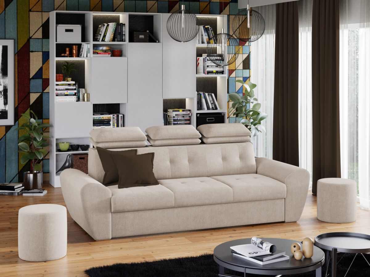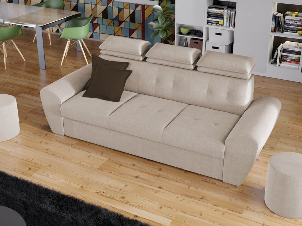 Canapea Barini Whisper 3 Canapea Barini Whisper 3 este o canapea cu design modern, cu forme rotunjite. Tetierele reglabile in mai multe trepte asigura confortul necesar in momentele de relaxare, sustinand capul exact in pozitia dorita. Picioarele argintii si butonii de pe sezut si de pe spatar confera eleganta acestei canapele cu trei locuri . Se transforma rapid si usor intr-un pat spatios de 185 x 130 cm . Este potrivita unei incaperi spatioase, avand dimensiunea de: 245 cm lungime, 100 cm latime, 95 cm inaltime totala. Este tapitata cu stofa de calitate pe diverse culori. Atentie: Pretul afisat nu include alte accesorii sau obiecte de decor. Taburetele, pernele deco si draperiile se pot achizitiona optional. Livrare gratuita si rapida, 4-10 zile lucratoare prin flota proprie Suntem producatori de tapiterii, fara intermediari Toate piesele de tapiterii au o garantie de 2 ani Sezutul este din arcuri sinusoidale si poliuretan, iar extensia canapelei este din poliuretan High Resilience. Scheletul este rezistent, realizat pe structura solida de fag si pal. Extensia de tip sertar este pozitionata sub sezutul canapelei. Se deschide ca un sertar, apoi se ridica salteaua din interiorul acestuia. Canapea Barini Whisper 3 se incadreaza cu usurinta in majoritatea locuintelor indiferent de stilul acestora. Puteti alege din mai multe culori pentru stofa. Produsele disponibile le puteti vedea aici Modele Barini . Dimensiuni Canapea Barini Whisper 3 Lungime: 245 cm Latime: 100 cm Lungime intre brate: 185 cm Inaltime sezut: 44 cm Adancime sezut: 63 cm Inaltime totala: 95 cm Inaltime brate: 52 cm Lungime brate: 95 cm Dimensiuni extinsa Lungime extinsa: 185 cm Adancime extinsa: 130 cm Tapiterie Canapea Barini Whisper 3 Tapiteria produsului este din stofa Crem . Nuanta acestui produs nu este pretentioasa, mascheaza eventualele evenimente neplacute prin care se poate murdari sau pata si se integreaza perfect in majoritatea locuintelor. Intretinere: se recomanda ca praful sa se stearga cu un material textil moale (finet) umed si sa nu se curete cu agenti chimici (diluant, acetona). Imaginile sunt cu titlu de prezentare si pot avea mici diferente de nuante in functie de display. Dimensiunile sunt exprimate în centimetri si pot oscila între ± 50 mm.