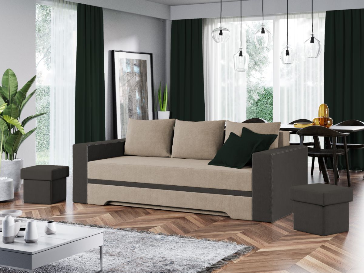 Canapea Bella Arte 9A / Preston 96 Canapea Bella Arte 9A / Preston 96 are un design linear, modern si versatil. Cele trei perne detasabile cu doua fete aduc acesteia un plus si in confort, sustinand corpul in pozitia dorita. Canapeaua este spatioasa, fiind ideala pentru trei persoane. In plus, datorita posibilitatii de extindere , obtineti un spatiu pentru odihna si relaxare pentru doua persoane, cu suprafata utila de 153 x 190 cm . Dimensiunile acestei canapele sunt: 228 cm lungime, 106 cm latime, 88 cm inaltime totala . Este prevazuta cu lada pentru depozitare, utila pentru depozitarea lenjeriei, a pernelor sau a paturii, pentru a pastra la indemana toate articolele frecvent utilizate. Este tapitata cu stofa de calitate pe diverse culori. Atentie: Pretul afisat nu include alte accesorii sau obiecte de decor. Taburetele, pernele deco si draperiile se pot achizitiona optional. Livrare gratuita si rapida, 4-10 zile lucratoare prin flota proprie Suntem producatori de tapiterii, fara intermediari Toate piesele de tapiterii au o garantie de 2 ani Sezutul si extensia canapelei sunt pe relaxa (arcuri elicoidale si poliuretan) . Scheletul este rezistent, realizat pe structura solida de fag si pal . Extensia este de tip Doppelliege, ce prezinta un sistem actionat prin role, astfel ca partea de sezut se trage si permite partii de spatar sa gliseze spre partea din fata si sa se pozitioneze orizontal. Canapea Bella Arte 9A / Preston 96 se incadreaza cu usurinta in majoritatea locuintelor indiferent de stilul acestora. Puteti alege din mai multe culori pentru stofa. Produsele disponibile le puteti vedea aici Modele Bella . Dimensiuni Canapea Bella Arte 9A / Preston 96 Lungime: 228 cm Latime: 106 cm Inaltime sezut: 45 cm Inaltime totala: 88 cm Inaltime fara perne: 78 cm Adancime sezut: 82 cm Latime brate: 18 cm Inaltime brate: 60 cm Dimensiuni extinsa Lungime extinsa: 190 cm Adancime extinsa: 153 cm Tapiterie Canapea Bella Arte 9A / Preston 96 Tapiteria produsului este din stofa Arte 9A pe sezut si Preston 96 pe brate . Nuantele acestui produs nu sunt pretentioase, mascheaza eventualele evenimente neplacute prin care se pot murdari sau pata si se integreaza perfect in majoritatea locuintelor. Intretinere: se recomanda ca praful sa se stearga cu un material textil moale (finet) umed si sa nu se curete cu agenti chimici (diluant, acetona). Imaginile sunt cu titlu de prezentare si pot avea mici diferente de nuante in functie de display. Dimensiunile sunt exprimate în centimetri si pot oscila între ± 50 mm.