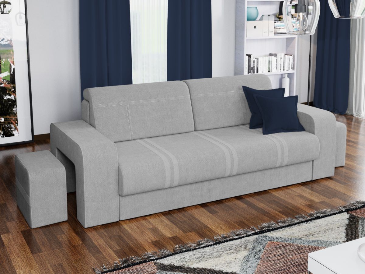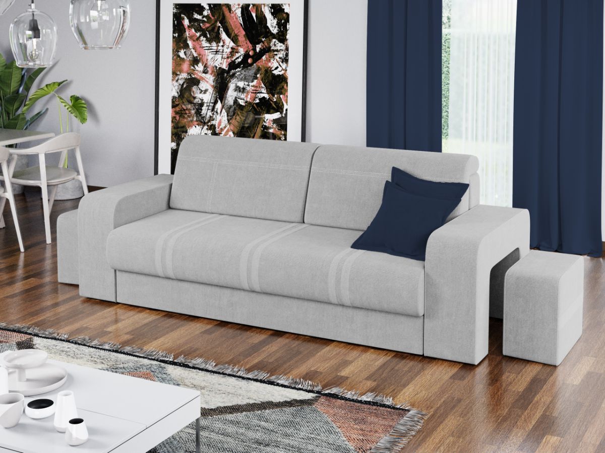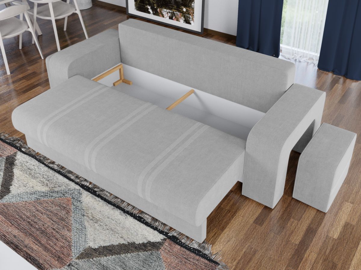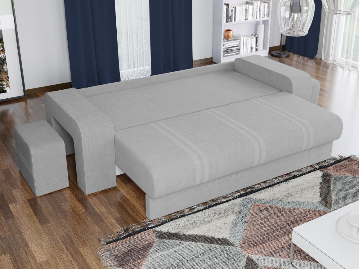Canapea Bravo Gri Deschis Simplitate si functionalitate la superlativ. Canapea Bravo Gri Deschis este potrivita pentru incaperi mici sau medii, avand dimensiunile de: 260 cm lungime, 103 cm latime, 75 cm inaltime totala. In plus, datorita posibilitatii de extindere, se obtine un spatiu pentru odihna si relaxare cu suprafata utila de 148 x 190 cm . Este prevazuta cu 2 tabureti care se pot integra in partile laterale decupate ale canapelei . Faceti economie de spatiu folosind lada de depozitare , utila pentru a pastra lenjeria, pernele sau patura si pentru a pastra la indemana toate articolele frecvent utilizate. Este tapitata cu stofa de calitate pe diverse culori. Dungile de pe sezut sunt din stofa de aceeasi culoare ca si restul canapelei. Atentie: Pretul afisat nu include alte accesorii sau obiecte de decor. Pernele deco si draperiile se pot achizitiona optional. Livrare gratuita si rapida, 4-10 zile lucratoare prin flota proprie Suntem producatori de tapiterii, fara intermediari Toate piesele de tapiterii au o garantie de 2 ani Sezutul si extensia canapelei sunt pe relaxa (arcuri elicoidale si poliuretan) . Scheletul este rezistent, realizat pe structura solida de fag si pal . Extensia este de tip Doppelliege, ce prezinta un sistem actionat prin role, astfel ca partea de sezut se trage si permite partii de spatar sa gliseze spre partea din fata si sa se pozitioneze orizontal. Canapea Bravo Gri Deschis se incadreaza cu usurinta in majoritatea locuintelor indiferent de stilul acestora. Puteti alege din mai multe culori pentru stofa. Produsele disponibile le puteti vedea aici Modele Bravo . Dimensiuni Canapea Bravo Lungime: 260 cm Latime: 103 cm Lungime intre brate: 190 cm Inaltime sezut: 45 cm Inaltime: 75 cm Adancime sezut: 75 cm Inaltime brate: 66 cm Lungime brate: 90 cm Grosime brate: 26 cm Dimensiuni extinsa Lungime extinsa: 190 cm Adancime extinsa: 148 cm Tapiterie Canapea Bravo Gri Deschis Tapiteria produsului este din stofa Gri Deschis . Nuanta acestui produs nu este pretentioasa, mascheaza eventualele evenimente neplacute prin care se poate murdari sau pata si se integreaza perfect in majoritatea locuintelor. Intretinere: se recomanda ca praful sa se stearga cu un material textil moale (finet) umed si sa nu se curete cu agenti chimici (diluant, acetona). Imaginile sunt cu titlu de prezentare si pot avea mici diferente de nuante in functie de display. Dimensiunile sunt exprimate în centimetri si pot oscila între ± 50 mm.