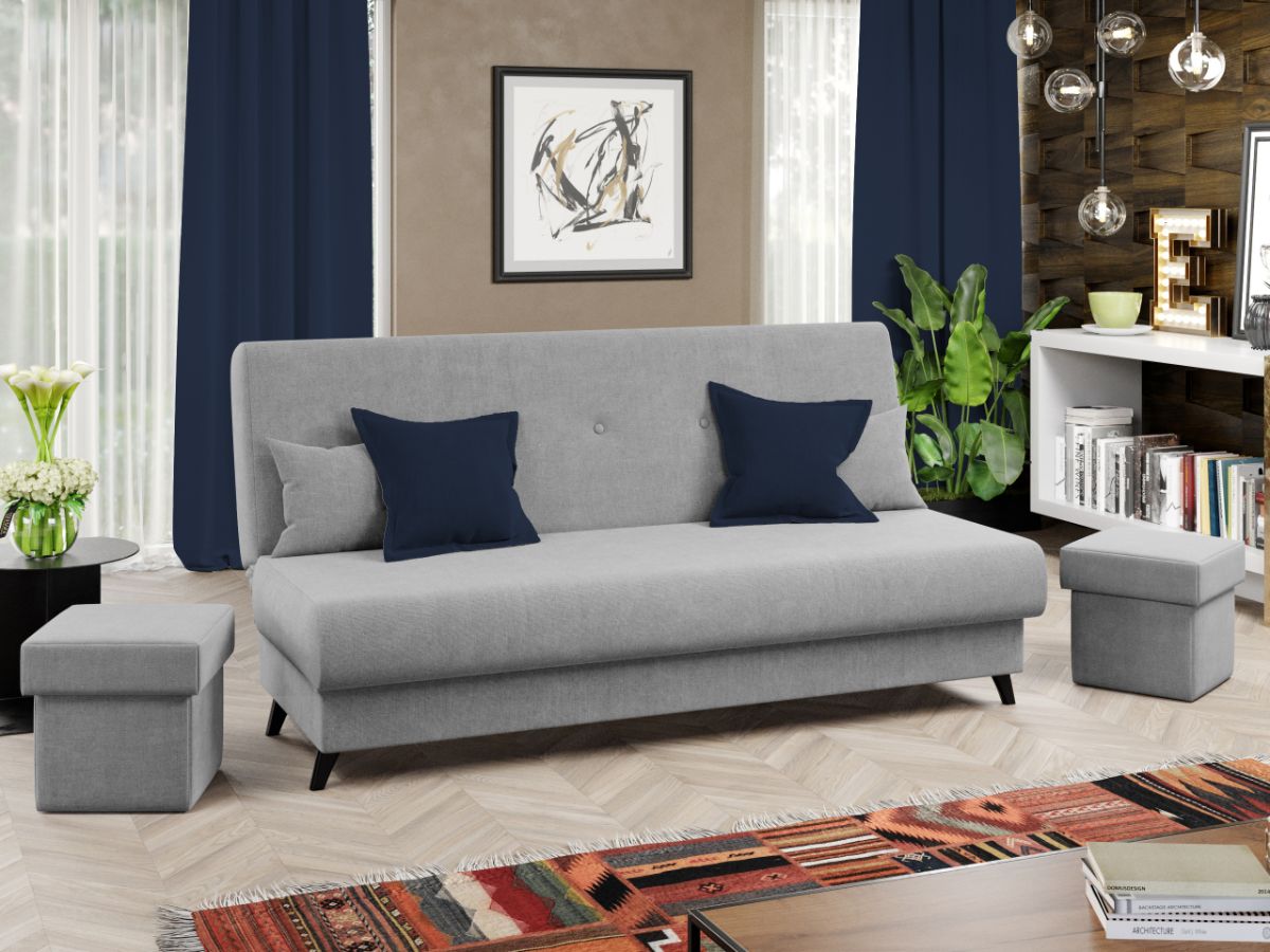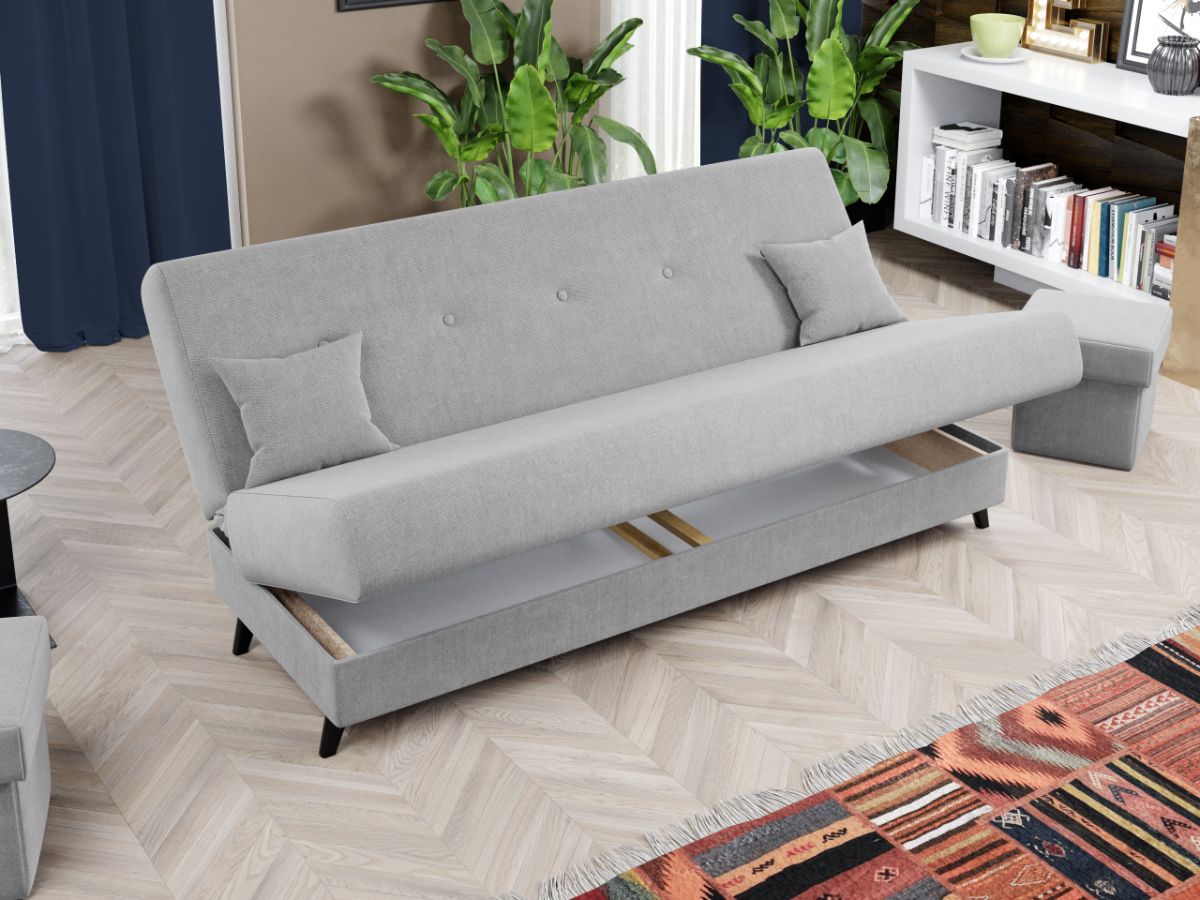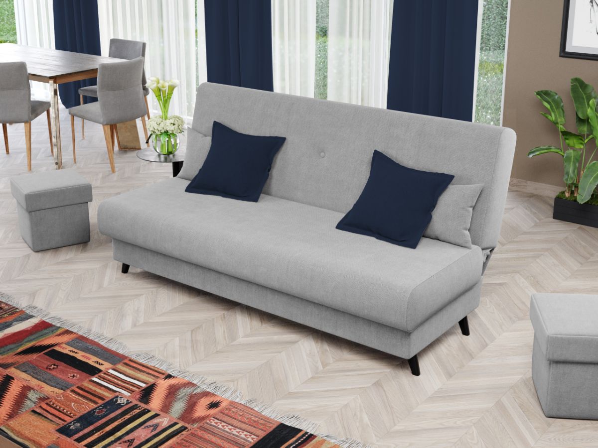 Canapea Clin Gri Deschis Canapea Clin Gri Deschis este practica, simpla si comoda. Butonii de pe spatar, cele doua perne mici si picioarele negre contribuie la eleganta pe care ti-o doresti in casa ta. Este alegerea ideala pentru incaperi mici, avand avantajul ca nu ocupa mult spatiu, fiind in acelasi timp incapatoare datorita lipsei bratelor. Canapeaua optimizeaza la maxim spatiul prin lada de depozitare , care poate fi folosita pentru depozitarea lenjeriei, a pernelor sau a paturii. Imbina cu succes functionalitatea cu designul, transformandu-se rapid intr-un pat confortabil de 190 x 120 cm . Dimensiunile canapelei sunt: 190 cm lungime, 95 cm latime, 93 cm inaltime totala . Este tapitata cu stofa de calitate pe diverse culori. Atentie: Pretul afisat nu include alte accesorii sau obiecte de decor. Taburetele, pernele deco si draperiile se pot achizitiona optional. Livrare gratuita si rapida, 4-10 zile lucratoare prin flota proprie Suntem producatori de tapiterii, fara intermediari Toate piesele de tapiterii au o garantie de 2 ani Sezutul si extensia sunt de tip relaxa (arcuri sinusoidale, arcuri elicoidale si poliuretan). Scheletul este rezistent, realizat pe structura solida de fag si pal . Sistemul de extensie este de tipul click-clack , se ridica de sezut, pana cand spatarul ajunge in pozitie orizontala si se aude un click, apoi se lasa sezutul si se formeaza zona de dormit. Canapea Clin Gri Deschis se incadreaza cu usurinta in majoritatea locuintelor indiferent de stilul acestora. Puteti alege din mai multe culori pentru stofa. Produsele disponibile le puteti vedea aici Modele Clin . Dimensiuni Canapea Clin Gri Deschis Lungime: 190 cm Latime: 95 cm Inaltime sezut: 45 cm Adancime sezut: 68 cm Inaltime totala: 93 cm Dimensiuni extinsa Lungime extinsa: 190 cm Adancime extinsa: 120 cm Tapiterie Canapea Clin Gri Deschis Tapiteria produsului este din stofa Gri Deschis . Nuanta acestui produs nu este pretentioasa, mascheaza eventualele evenimente neplacute prin care se poate murdari sau pata si se integreaza perfect in majoritatea locuintelor. Intretinere: se recomanda ca praful sa se stearga cu un material textil moale (finet) umed si sa nu se curete cu agenti chimici (diluant, acetona). Imaginile sunt cu titlu de prezentare si pot avea mici diferente de nuante in functie de display. Dimensiunile sunt exprimate în centimetri si pot oscila între ± 50 mm.