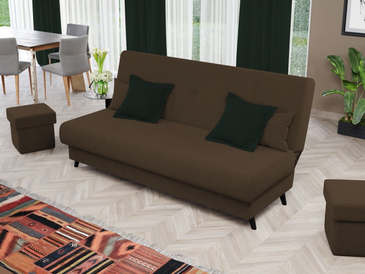 Canapea Clin Maro Canapea Clin Maro este practica, simpla si comoda. Butonii de pe spatar, cele doua perne mici si picioarele negre contribuie la eleganta pe care ti-o doresti in casa ta. Este alegerea ideala pentru incaperi mici, avand avantajul ca nu ocupa mult spatiu, fiind in acelasi timp incapatoare datorita lipsei bratelor. Canapeaua optimizeaza la maxim spatiul prin lada de depozitare , care poate fi folosita pentru depozitarea lenjeriei, a pernelor sau a paturii. Imbina cu succes functionalitatea cu designul, transformandu-se rapid intr-un pat confortabil de 190 x 120 cm . Dimensiunile canapelei sunt: 190 cm lungime, 95 cm latime, 93 cm inaltime totala . Este tapitata cu stofa de calitate pe diverse culori. Atentie: Pretul afisat nu include alte accesorii sau obiecte de decor. Taburetele, pernele deco si draperiile se pot achizitiona optional. Livrare gratuita si rapida, 4-10 zile lucratoare prin flota proprie Suntem producatori de tapiterii, fara intermediari Toate piesele de tapiterii au o garantie de 2 ani Sezutul si extensia sunt de tip relaxa (arcuri sinusoidale, arcuri elicoidale si poliuretan). Scheletul este rezistent, realizat pe structura solida de fag si pal . Sistemul de extensie este de tipul click-clack , se ridica de sezut, pana cand spatarul ajunge in pozitie orizontala si se aude un click, apoi se lasa sezutul si se formeaza zona de dormit. Canapea Clin Maro se incadreaza cu usurinta in majoritatea locuintelor indiferent de stilul acestora. Puteti alege din mai multe culori pentru stofa. Produsele disponibile le puteti vedea aici Modele Clin . Dimensiuni Canapea Clin Maro Lungime: 190 cm Latime: 95 cm Inaltime sezut: 45 cm Adancime sezut: 68 cm Inaltime totala: 93 cm Dimensiuni extinsa Lungime extinsa: 190 cm Adancime extinsa: 120 cm Tapiterie Canapea Clin Maro Tapiteria produsului este din stofa Maro . Nuanta acestui produs nu este pretentioasa, mascheaza eventualele evenimente neplacute prin care se poate murdari sau pata si se integreaza perfect in majoritatea locuintelor. Intretinere: se recomanda ca praful sa se stearga cu un material textil moale (finet) umed si sa nu se curete cu agenti chimici (diluant, acetona). Imaginile sunt cu titlu de prezentare si pot avea mici diferente de nuante in functie de display. Dimensiunile sunt exprimate în centimetri si pot oscila între ± 50 mm.