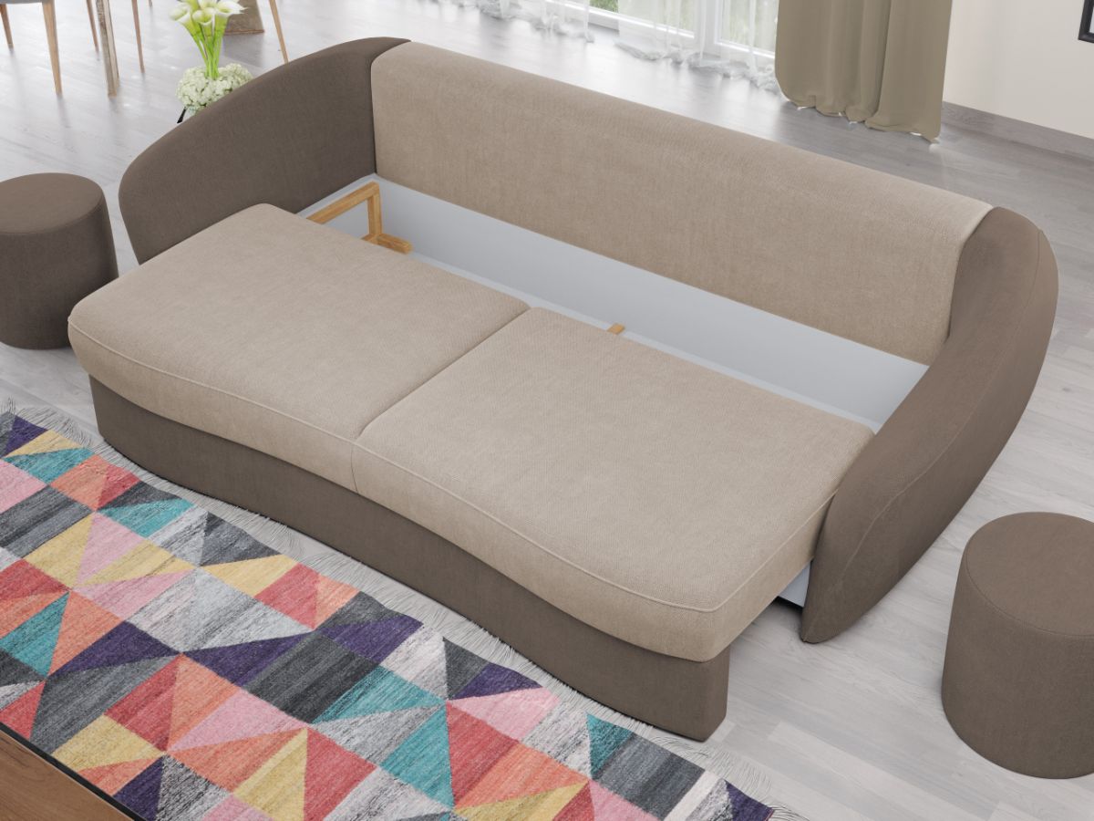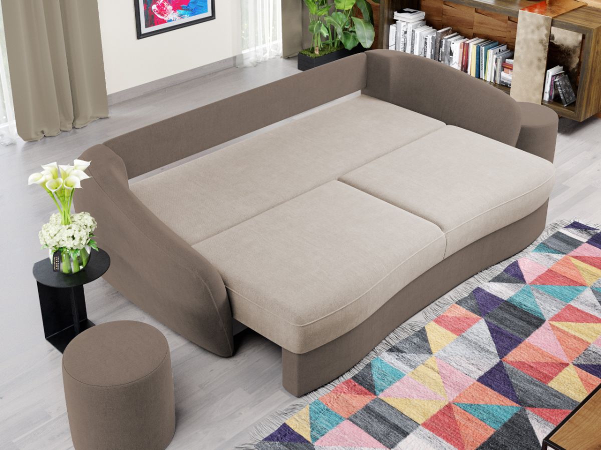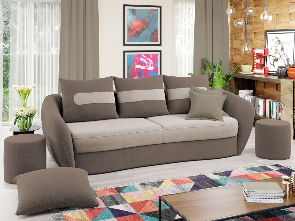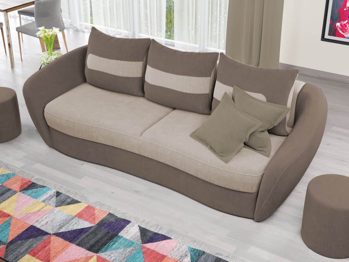 Canapea Ella Whisper 3 / Whisper 5 Canapea Ella Whisper 3 / Whisper 5 este caracterizata de un design elegant si modern. Liniile curbate ale sezutului, bratelor si ale celor 3 perne detasabile sunt elementele definitorii ale acesteia. Este alegerea potrivita pentru camera de zi, realizand aspectul armonios pe care il doresti in casa ta. Pe langa rolul estetic ce creeaza un ambient prietenos si primitor, canapeaua detine si un rol de sustinere pentru un confort sporit. Aceasta este o alegere practica pentru casa ta, transformandu-se usor intr-un pat spatios de 190×150 cm , fiind prevazuta cu lada pentru depozitare . Are dimensiunea de: 245 cm lungime, 120 cm latime, 90 cm inaltime totala . Este tapitata cu stofa de calitate pe diverse culori. Atentie: Pretul afisat nu include alte accesorii sau obiecte de decor. Taburetele, pernele deco si draperiile se pot achizitiona optional Livrare gratuita si rapida, 4-10 zile lucratoare prin flota proprie Suntem producatori de tapiterii, fara intermediari Toate piesele de tapiterii au o garantie de 2 ani Sezutul si extensia canapelei sunt pe relaxa (arcuri elicoidale si poliuretan) . Scheletul este rezistent, realizat pe structura solida de fag si pal. Extensia este de tip Doppelliege, ce prezinta un sistem actionat prin role, astfel ca partea de sezut se trage si permite partii de spatar sa gliseze spre partea din fata si sa se pozitioneze orizontal. Canapea Ella Whisper 3 / Whisper 5 se incadreaza cu usurinta in majoritatea locuintelor indiferent de stilul acestora. Puteti alege din mai multe culori pentru stofa. Produsele disponibile le puteti vedea aici Modele Ella . Dimensiuni Canapea Ella Whisper 3 / Whisper 5 Lungime: 245 cm Latime: 120 cm Lungime intre brate: 190 cm Inaltime sezut: 43 cm Inaltime: 90 cm Adancime sezut fara perne: 85 cm Adancime sezut cu perne: 80 cm Dimensiuni extinsa Lungime extinsa: 190 cm Adancime extinsa: 150 cm Dimensiuni brate Lungime brate: 100 cm Inaltime brate: 75 cm Grosime brate: 20 cm Tapiterie Canapea Ella Whisper 3 / Whisper 5 Tapiteria produsului este din stofa Crem si Maro. Nuantele acestui produs nu sunt pretentioase, mascheaza eventualele evenimente neplacute prin care se pot murdari sau pata si se integreaza perfect in majoritatea locuintelor. Intretinere: se recomanda ca praful sa se stearga cu un material textil moale (finet) umed si sa nu se curete cu agenti chimici (diluant, acetona). Imaginile sunt cu titlu de prezentare si pot avea mici diferente de nuante in functie de display. Dimensiunile sunt exprimate în centimetri si pot oscila între ± 50 mm.