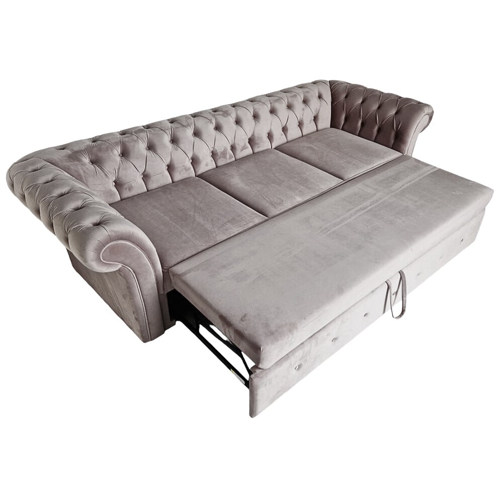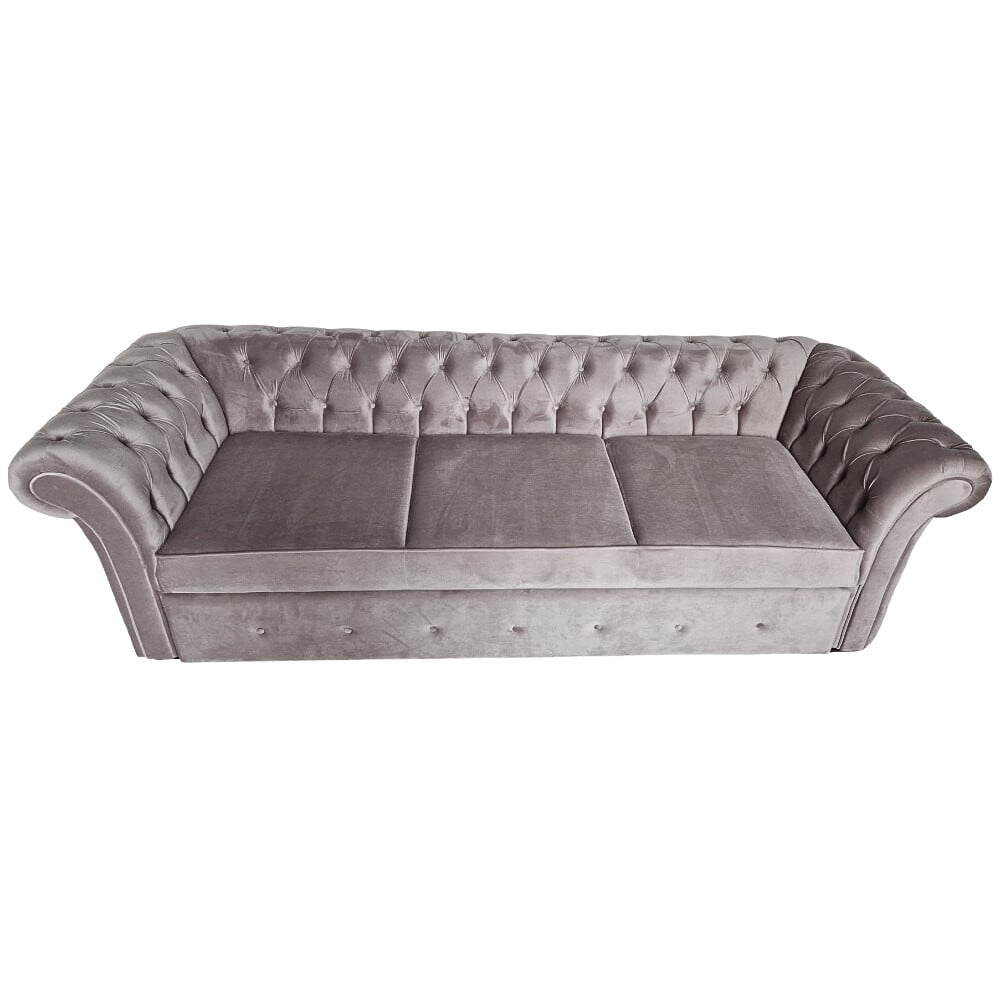 Canapea Extensibila Chesterfield, 250x100x75cm, 3 locuri, Velutto 15 Silver, Glasspandoor Lungime: 250 cm Latime: 100 cm Inaltime:75 cm Inaltime sezut: 45 cm Produsul este realizat pe structura de pal de 18mm, cu grinzi de rezistenta, din lemn de brad de 3x5cm si 5x5cm.