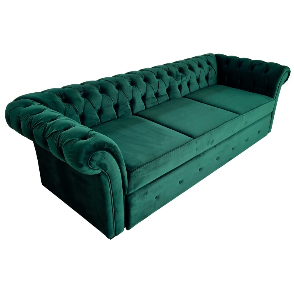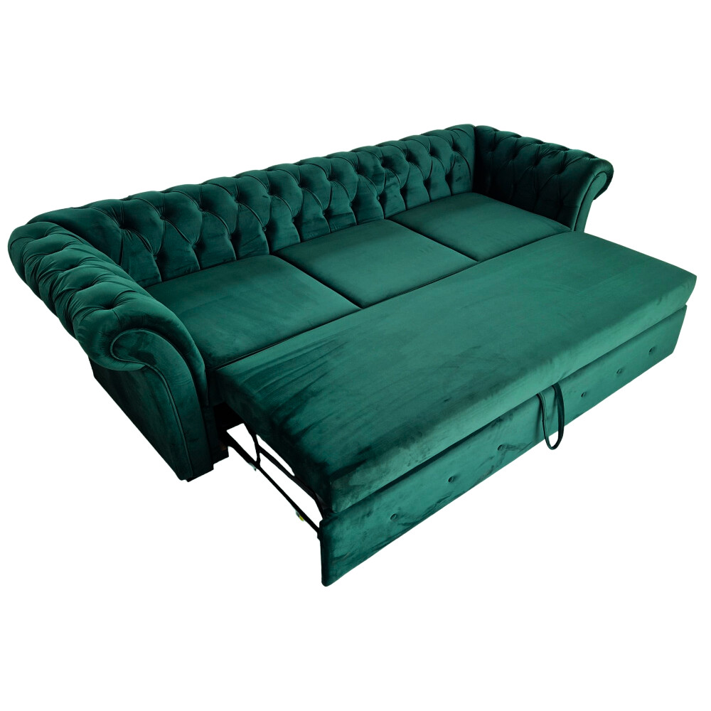 Canapea Extensibila Chesterfield, 250x100x75cm, 3 locuri, Velutto 27 Jungle Green, Glasspandoor Lungime: 250 cm Latime: 100 cm Inaltime:75 cm Inaltime sezut: 45 cm Produsul este realizat pe structura de pal de 18mm, cu grinzi de rezistenta, din lemn de brad de 3x5cm si 5x5cm.