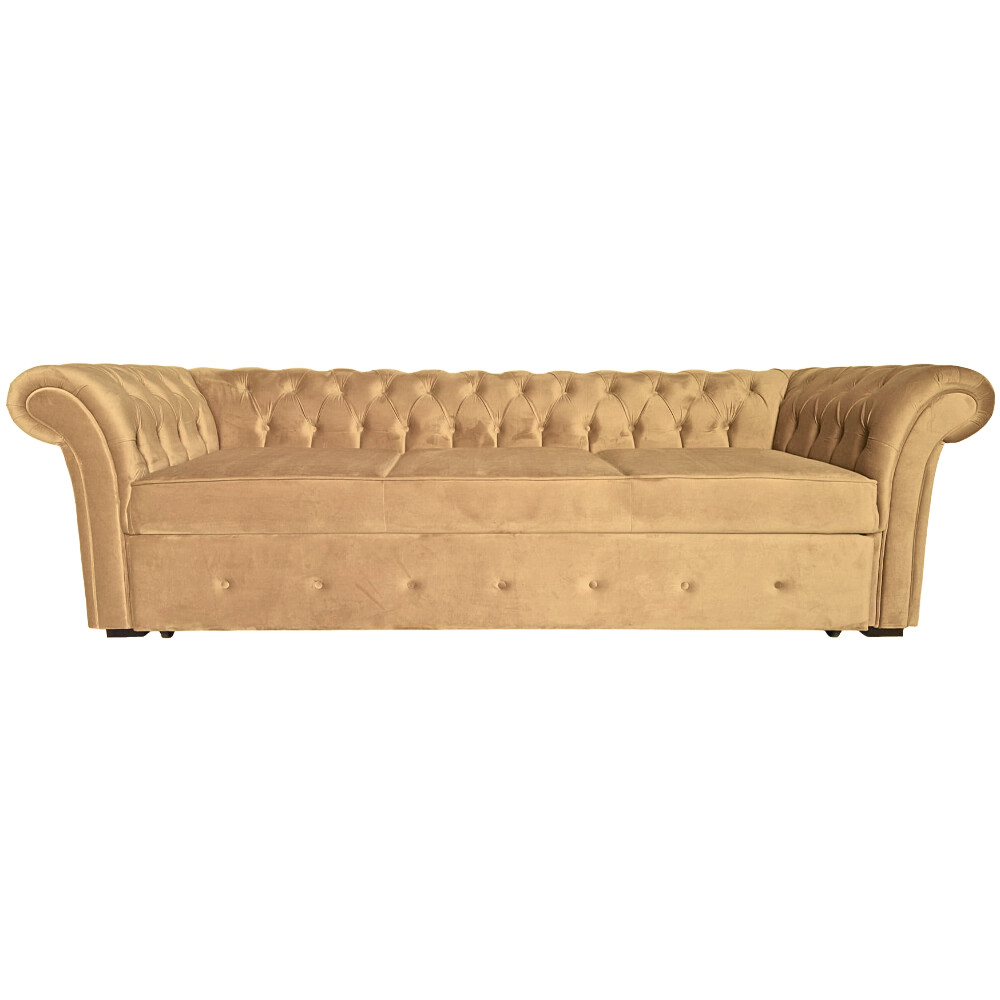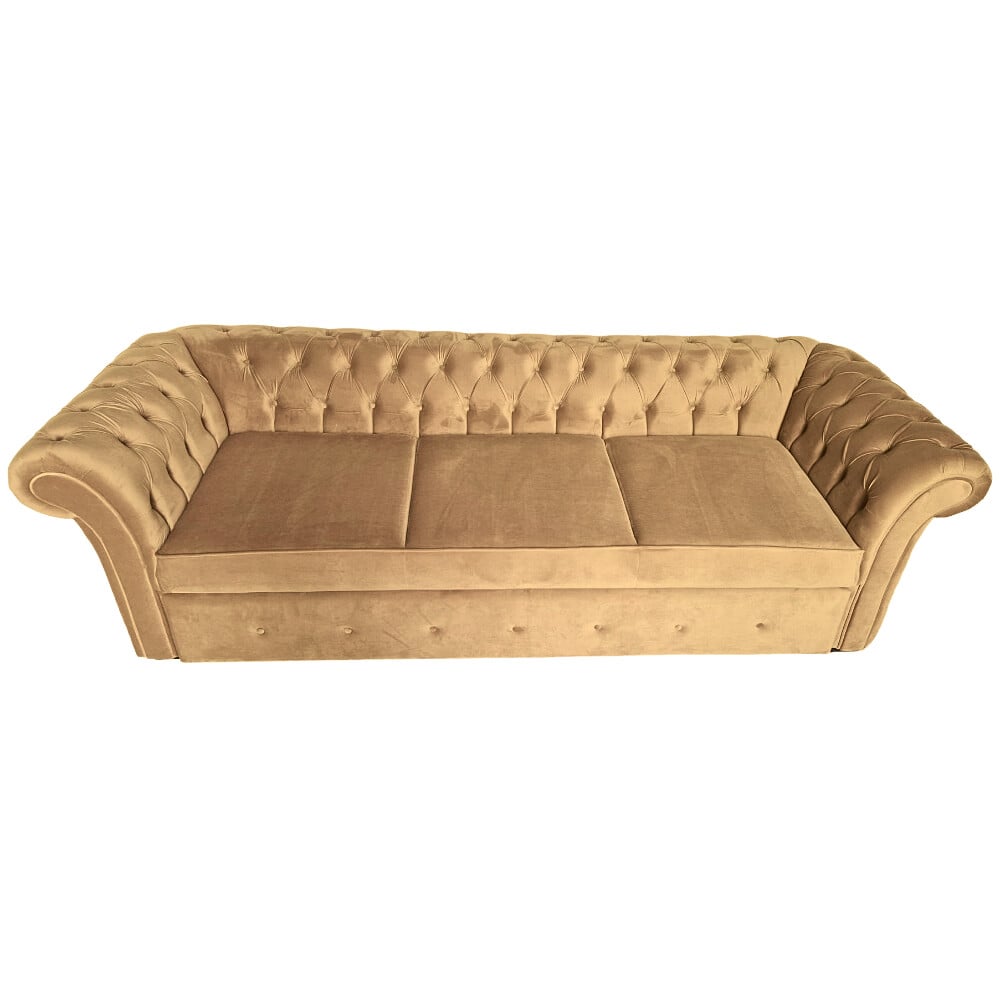 Canapea Extensibila Chesterfield, 250x100x75cm, 3 locuri, Velutto 30 Tobacco, Glasspandoor Lungime: 250 cm Latime: 100 cm Inaltime:75 cm Inaltime sezut: 45 cm Produsul este realizat pe structura de pal de 18mm, cu grinzi de rezistenta, din lemn de brad de 3x5cm si 5x5cm.