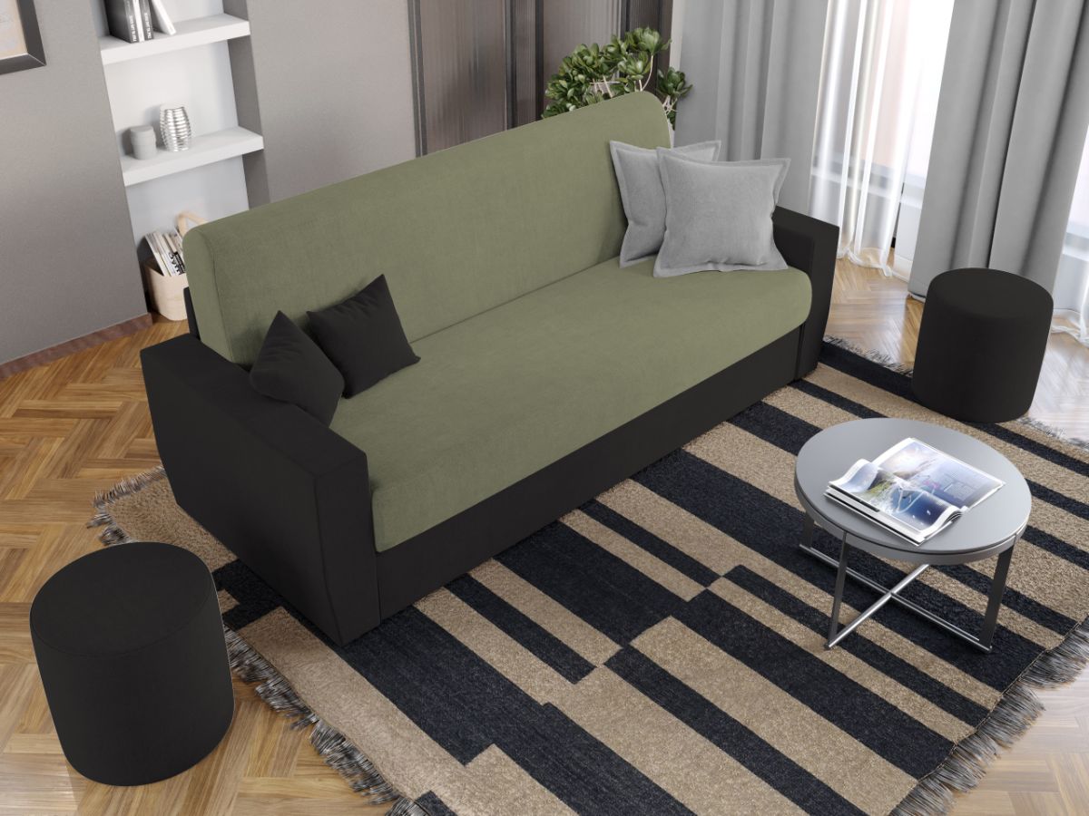 Canapea Corsica Verde / Negru Canapea Corsica Verde / Negru are un design simplu la baza, dar aduce un plus in stil imbinand doua nuante de stofa. Este realizata pe structura din lemn de fag combinat cu pal brut. Sezutul si extensia sunt de tip relaxa cu arcuri sinusoidale, arcuri elicoidale si poliuretan. Sistemul de extensie este de tipul click-clack , se ridica de sezut, pana cand spatarul ajunge in pozitie orizontala si se aude un click, apoi se lasa sezutul si se formeaza zona de dormit. Sub sezut este lada pentru depozitare . Dupa extindere partea din spate ramane in pozitie fixa impiedicand alunecarea asternuturilor sau a pernelor. Atentie: Pretul afisat nu include alte accesorii sau obiecte de decor. Taburetele, pernele deco si draperiile se pot achizitiona optional. Livrare gratuita si rapida, 4-10 zile lucratoare prin flota proprie Suntem producatori de tapiterii, fara intermediari Toate piesele de tapiterii au o garantie de 2 ani Este potrivita pentru incaperi medii sau mari, avand dimensiunile de: 220 cm lungime, 97 cm latime, 90 cm inaltime totala . Prin extindere se realizeaza un pat confortabil de 185 x 115 cm in care se poate dormi atat ocazional cat si zi de zi . Cele doua perne mici incluse sunt foarte utile. Canapea Corsica Verde / Negru se incadreaza cu usurinta in majoritatea locuintelor indiferent de stilul acestora. Puteti alege din mai multe culori pentru stofa. Produsele disponibile le puteti veadea aici Modele Corsica . Dimensiuni Canapea Corsica Verde / Negru Latime: 220 cm Adancime: 97 cm Adancime sezut: 54 cm Inaltime: 90 cm Latime intre brate: 185 cm Adancime extinsa: 115 cm Spatiu de dormit: 185 x 115 cm Tapiteria produsului este din stofa . Nuantele acestui produs nu sunt pretentioase, mascheaza eventualele evenimente neplacute prin care se pot murdari sau pata si se integreaza perfect in majoritatea locuintelor. Intretinere: se recomanda ca praful sa se stearga cu un material textil moale (finet) umed si sa nu se curete cu agenti chimici (diluant, acetona). Imaginile sunt cu titlu de prezentare si pot avea diferente de nuanta in functie de display. Dimensiunile sunt exprimate în centimetri si pot oscila între ± 0.5 cm.