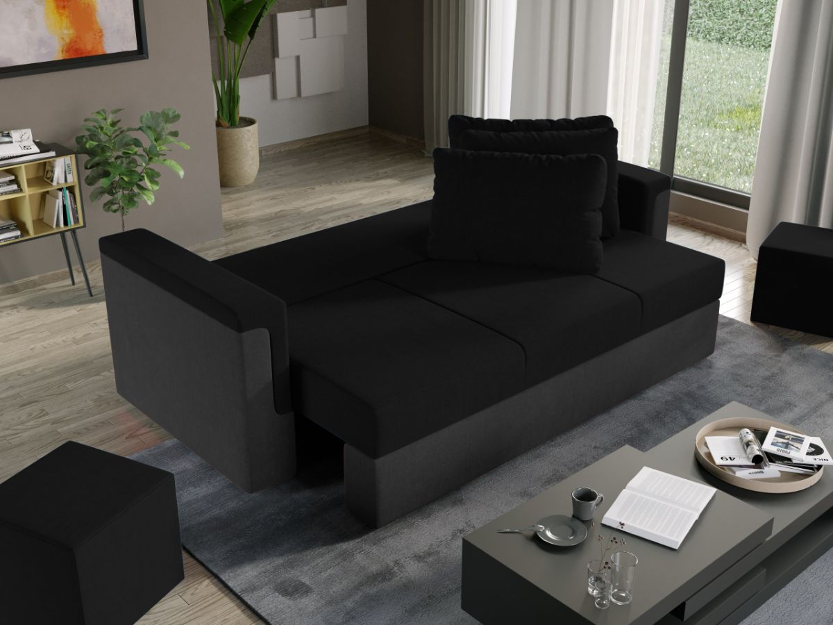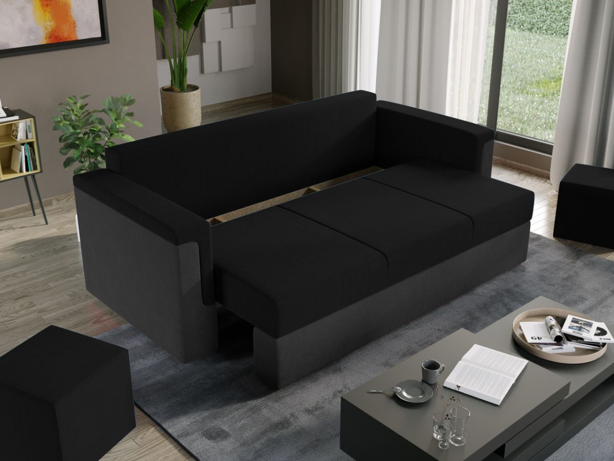 Canapea Extensibila Faro gri antracit / negru O canapea ideala pentru relaxare, dar şi pentru somn. Canapea Extensibila Faro gri antracit / negru cu lada are 3 perne mari si sezut relaxa, totul pentru confortul tau. Designul imbina doua nuante de stofa si creeaza un stil desavarsit. Atentie: Pretul afisat nu include alte accesorii sau obiecte de decor. Taburetele, pernele deco si draperiile se pot achizitiona optional. Livrare gratuita si rapida, 4-10 zile lucratoare prin flota proprie Suntem producatori de tapiterii, fara intermediari Toate piesele de tapiterii au o garantie de 2 ani Canapea Extensibila Faro gri antracit / negru este potrivita pentru incaperi medii sau mari si are dimensiunile de: 220 cm lungime, 95 cm latime, 85 cm inaltime totala . In plus, datorita posibilitatii de extindere, obtineti un spatiu pentru odihna si relaxare, cu suprafata utila 180 x 140 cm . Canapea Extensibila Faro gri antracit / negru Sezutul si extensia canapelei sunt pe relaxa (arcuri elicoidale și poliuretan) . Ofera fermitatea optima, dar si confortul dorit. Poti trage un pui de somn binemeritat in timpul zilei sau te poti relaxa cu familia si prietenii seara. O canapea confortabila, care ofera spatiu generos. Lada incorporata este ideala pentru depozitarea lenjeriei, a pernelor sau a paturii, pentru a pastra la indemana toate articolele frecvent utilizate. Scheletul este rezistent realizat pe structura solida. Avem incredere in imaginatia dvs. in materie de mobilier. Moderna, incapatoare si comoda, Canapea Extensibila Faro gri antracit / negru poate fi acompaniata de multe stiluri de mobila. Canapeaua este extensibila si se transforma rapid intr-un pat de doua persoane de 180 x 140 cm Dimensiuni Canapea Faro Lungime totala: 220 cm Latime totala: 95 cm Lungime intre brate: 180 cm Inaltime brate: 60 cm Inaltime spatar cu perne: 85 cm Inaltime sezut: 43 cm Adancime sezut cu perne: 58 cm Adancime sezut fara perne: 80 cm Spatiu de dormit dupa extindere: 180 x 140 cm Tapiterie Canapea Extensibila Faro Tapiteria produsului este din stofa . Nuanta acestui produs nu este pretentioasa, mascheaza eventualele evenimente neplacute prin care se poate murdari sau pata si se integreaza perfect in majoritatea locuintelor. Intretinere: se recomanda ca praful sa se stearga cu un material textil moale (finet) umed si sa nu se curete cu agenti chimici (diluant, acetona). Imaginile sunt cu titlu de prezentare si pot avea diferente de nuanta in functie de display. Dimensiunile sunt exprimate în centimetri și pot oscila între ± 50 mm.