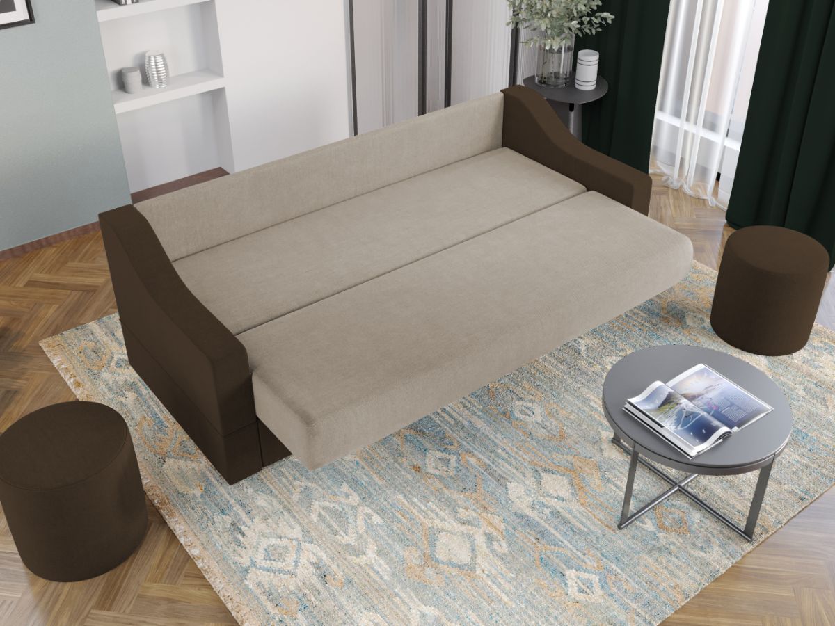 Canapea Iris Crem / Maro Canapea Iris Crem / Maro are un design minimalist si poate fi usor integrata alaturi de celelalte piese de mobilier din camera. Bratele canapelei ofera un suport placut si anatomic prin forma lor deosebita. Pe langa confort, acestea aduc un plus de stil. Dimensiunile sunt generoase si prin extindere se realizeaza un pat confortabil cu suprafata utila de 184 x 118 cm, in care se poate dormi atat ocazional, cat si zi de zi . Acesta are dimensiunea de: 210 cm lungime, 86 cm latime, 90 cm inaltime totala . Este tapitata cu stofa de calitate pe diverse culori. Atentie: Pretul afisat nu include alte accesorii sau obiecte de decor. Taburetele, pernele deco si draperiile se pot achizitiona optional. Livrare gratuita si rapida, 4-10 zile lucratoare prin flota proprie Suntem producatori de tapiterii, fara intermediari Toate piesele de tapiterii au o garantie de 2 ani Sezutul si extensia canapelei sunt pe relaxa (arcuri elicoidale si poliuretan) . Scheletul este rezistent, realizat pe structura solida de fag si pal . Sistemul de extensie este de tipul click-clack , se ridica de sezut, pana cand spatarul ajunge in pozitie orizontala si se aude un click, apoi se lasa sezutul si se formeaza zona de dormit. Sub sezut este lada pentru depozitare . Dupa extindere partea din spate ramane in pozitie fixa impiedicand alunecarea asternuturilor sau a pernelor. Canapea Iris Crem / Maro se incadreaza cu usurinta in majoritatea locuintelor indiferent de stilul acestora. Puteti alege din mai multe culori pentru stofa. Produsele disponibile le puteti vedea aici Modele Iris . Dimensiuni Canapea Iris Crem / Maro Latime: 210 cm Adancime: 86 cm Adancime sezut: 58 cm Inaltime sezut: 46 cm Inaltime: 90 cm Latime intre brate: 184 cm Adancime extinsa: 118 cm Spatiu de dormit: 184 x 118 cm Tapiterie Canapea Iris Crem / Maro Tapiteria produsului este din stofa Crem si Maro . Nuantele acestui produs nu sunt pretentioase, mascheaza eventualele evenimente neplacute prin care se pot murdari sau pata si se integreaza perfect in majoritatea locuintelor. Intretinere: se recomanda ca praful sa se stearga cu un material textil moale (finet) umed si sa nu se curete cu agenti chimici (diluant, acetona). Imaginile sunt cu titlu de prezentare si pot avea mici diferente de nuante in functie de display. Dimensiunile sunt exprimate în centimetri si pot oscila între ± 50 mm.