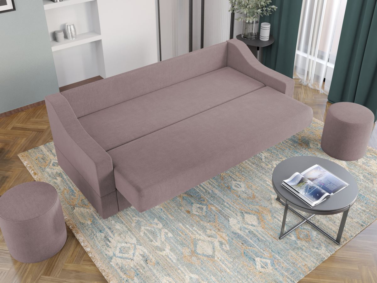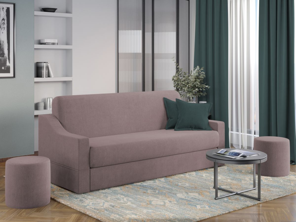 Canapea Iris Roze Canapea Iris Roze are un design minimalist si poate fi usor integrata alaturi de celelalte piese de mobilier din camera. Bratele canapelei ofera un suport placut si anatomic prin forma lor deosebita. Pe langa confort, acestea aduc un plus de stil. Dimensiunile sunt generoase si prin extindere se realizeaza un pat confortabil cu suprafata utila de 184 x 118 cm, in care se poate dormi atat ocazional, cat si zi de zi . Acesta are dimensiunea de: 210 cm lungime, 86 cm latime, 90 cm inaltime totala . Este tapitata cu stofa de calitate pe diverse culori. Atentie: Pretul afisat nu include alte accesorii sau obiecte de decor. Taburetele, pernele deco si draperiile se pot achizitiona optional. Livrare gratuita si rapida, 4-10 zile lucratoare prin flota proprie Suntem producatori de tapiterii, fara intermediari Toate piesele de tapiterii au o garantie de 2 ani Sezutul si extensia canapelei sunt pe relaxa (arcuri elicoidale si poliuretan) . Scheletul este rezistent, realizat pe structura solida de fag si pal . Sistemul de extensie este de tipul click-clack , se ridica de sezut, pana cand spatarul ajunge in pozitie orizontala si se aude un click, apoi se lasa sezutul si se formeaza zona de dormit. Sub sezut este lada pentru depozitare . Dupa extindere partea din spate ramane in pozitie fixa impiedicand alunecarea asternuturilor sau a pernelor. Canapea Iris Roze se incadreaza cu usurinta in majoritatea locuintelor indiferent de stilul acestora. Puteti alege din mai multe culori pentru stofa. Produsele disponibile le puteti vedea aici Modele Iris . Dimensiuni Canapea Iris Roze Latime: 210 cm Adancime: 86 cm Adancime sezut: 58 cm Inaltime sezut: 46 cm Inaltime: 90 cm Latime intre brate: 184 cm Adancime extinsa: 118 cm Spatiu de dormit: 184 x 118 cm Tapiterie Canapea Iris Roze Tapiteria produsului este din stofa Roze . Nuanta acestui produs nu este pretentioasa, mascheaza eventualele evenimente neplacute prin care se poate murdari sau pata si se integreaza perfect in majoritatea locuintelor. Intretinere: se recomanda ca praful sa se stearga cu un material textil moale (finet) umed si sa nu se curete cu agenti chimici (diluant, acetona). Imaginile sunt cu titlu de prezentare si pot avea mici diferente de nuante in functie de display. Dimensiunile sunt exprimate în centimetri si pot oscila între ± 50 mm.