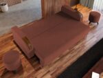 Canapea Londa Caramizie Canapea Londa Caramizie combina stilul si confortul, fiind alegerea potrivita pentru locuinta dumneavoastra. Picioarele argintii lucioase si insertiile de lemn de pe brate completeaza eleganta acestei canapele. Pe langa aspect, ofera confort prin cele 2 perne detasabile, cat si prin faptul ca se poate transforma rapid intr-un pat ce are lada de depozitare dedesubt. Este recomandata atat pentru incaperi medii, cat si mari si are dimensiunile de: 220 cm lungime, 95 cm latime, 83 cm inaltime totala . Dupa extindere, obtineti un spatiu pentru odihna si relaxare, cu suprafata utila 190 x 140 cm . Este tapitata cu o stofa de calitate uni pe diverse culori. Atentie: Pretul afisat nu include alte accesorii sau obiecte de decor. Taburetele, pernele deco si draperiile se pot achizitiona optional. Livrare gratuita si rapida, 4-10 zile lucratoare prin flota proprie Suntem producatori de tapiterii, fara intermediari Toate piesele de tapiterii au o garantie de 2 ani Sezutul si extensia canapelei sunt pe relaxa (arcuri elicoidale si poliuretan) . Scheletul este rezistent, realizat pe structura solida de fag si pal. Extensia este de tip Doppelliege ce prezinta un sistem actionat prin role, astfel ca partea de sezut se trage si permite partii de spatar sa gliseze spre partea din fata si sa se pozitioneze orizontal. Canapea Londa Caramizie se incadreaza cu usurinta in majoritatea locuintelor indiferent de stilul acestora. Puteti alege din mai multe culori pentru stofa. Produsele disponibile le puteti vedea aici Modele Londa . Dimensiuni Canapea Londa Lungime: 220 cm Latime: 95 cm Lungime intre brate: 190 cm Inaltime sezut: 42 cm Inaltime: 83 cm Adancime sezut cu perne: 55 cm Adancime sezut fara perne: 80 cm Inaltime picioare: 10 cm Dimensiuni extinsa Lungime extins: 190 cm Adancime extins: 140 cm Tapiterie Canapea Londa Caramizie Tapiteria produsului este din stofa Caramizie. Nuanta acestui produs nu este pretentioasa, mascheaza eventualele evenimente neplacute prin care se poate murdari sau pata si se integreaza perfect in majoritatea locuintelor. Intretinere: se recomanda ca praful sa se stearga cu un material textil moale (finet) umed si sa nu se curete cu agenti chimici (diluant, acetona). Imaginile sunt cu titlu de prezentare si pot avea mici diferente de nuante in functie de display. Dimensiunile sunt exprimate în centimetri si pot oscila între ± 50 mm.