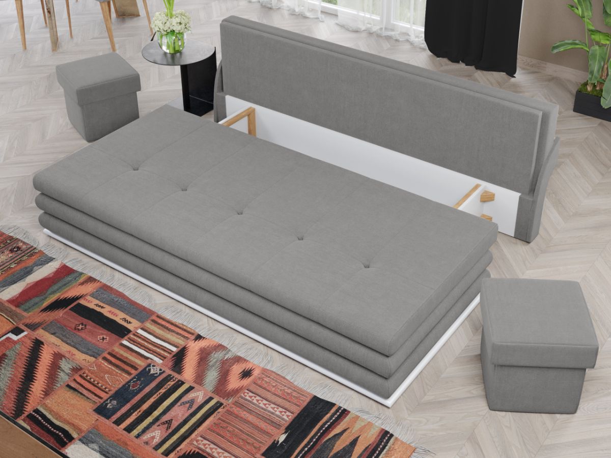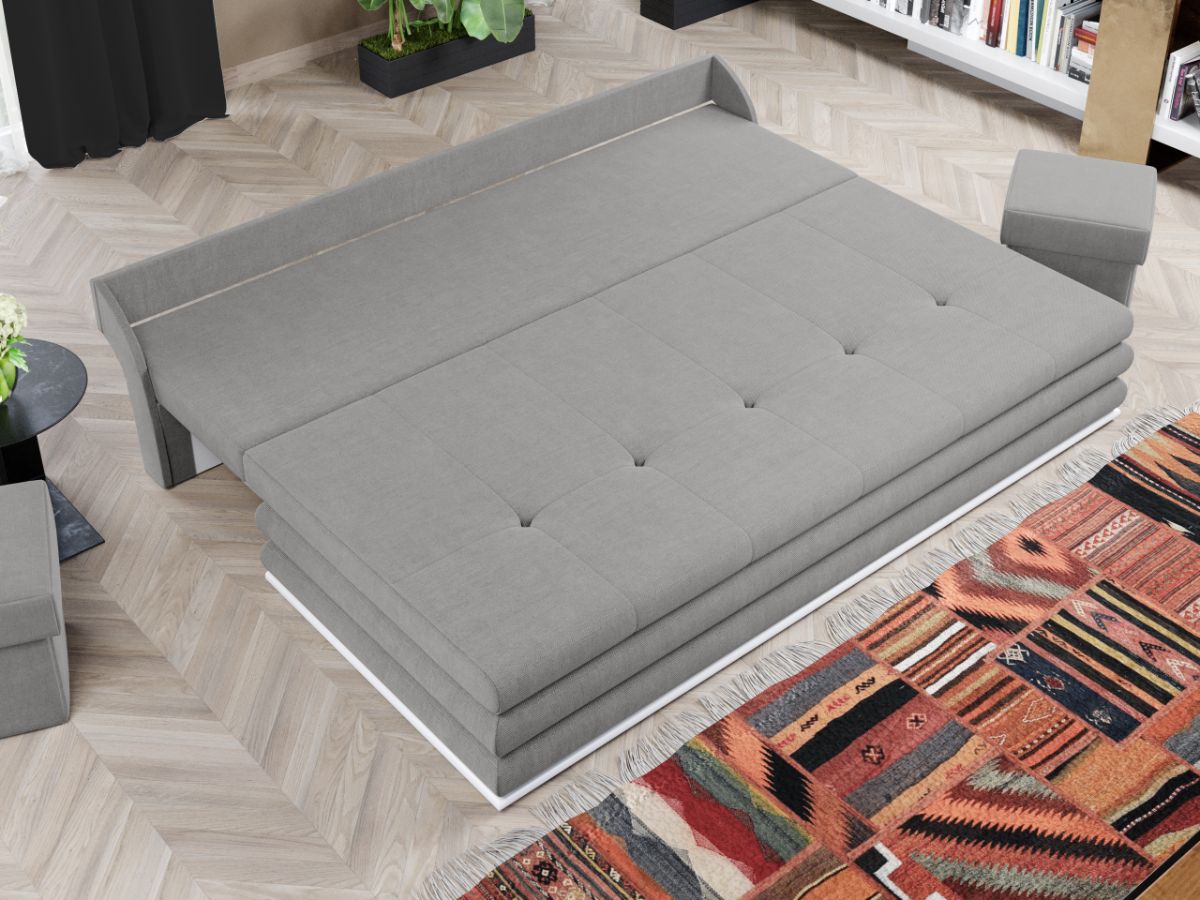 Canapea Mira Vardo 6 Canapea Mira Vardo 6 este o canapea moderna, perfecta pentru orice camera de zi. Definitoriu pentru aceasta este design-ul special, dat de formele rotunjite ale fetei sezutului, de butonii de pe acesta si de ornamentul contrastant de la baza. Cele doua perne si bratele laterale detasabile ofera confort si sustinere. Printre cele mai importante functii ale canapelei este spatiul de depozitare pe care il ofera, dar si capacitatea de a se transforma intr-un pat confortabil de 200x160cm . Are dimensiunea de: 210 cm lungime, 112 cm latime, 80 cm inaltime totala . Este tapitata cu stofa de calitate pe diverse culori. Atentie: Pretul afisat nu include alte accesorii sau obiecte de decor. Taburetele, pernele deco si draperiile se pot achizitiona optional. Livrare gratuita si rapida, 4-10 zile lucratoare prin flota proprie Suntem producatori de tapiterii, fara intermediari Toate piesele de tapiterii au o garantie de 2 ani Sezutul si extensia canapelei sunt din poliuretan HR (spuma poliuretanica High Resilience). Scheletul este rezistent, realizat pe structura solida de fag si pal. Extensia este de tip Doppelliege, ce prezinta un sistem actionat prin role, astfel ca partea de sezut se trage si permite partii de spatar sa gliseze spre partea din fata si sa se pozitioneze orizontal. Canapea Mira Vardo 6 se incadreaza cu usurinta in majoritatea locuintelor indiferent de stilul acestora. Puteti alege din mai multe culori pentru stofa. Produsele disponibile le puteti vedea aici Modele Mira . Dimensiuni Canapea Mira Vardo 6 Lungime: 210 cm Latime: 112 cm Lungime intre brate: 140 cm Inaltime sezut: 44 cm Inaltime: 80 cm Adancime sezut : 90 cm Dimensiuni extinsa Lungime extinsa: 200 cm Adancime extinsa: 160 cm Dimensiuni brate Lungime brate: 84 cm Latime brate: 33 cm Tapiterie Canapea Mira Vardo 6 Tapiteria produsului este din stofa Gri. Nuanta acestui produs nu este pretentioasa, mascheaza eventualele evenimente neplacute prin care se poate murdari sau pata si se integreaza perfect in majoritatea locuintelor. Intretinere: se recomanda ca praful sa se stearga cu un material textil moale (finet) umed si sa nu se curete cu agenti chimici (diluant, acetona). Imaginile sunt cu titlu de prezentare si pot avea mici diferente de nuante in functie de display. Dimensiunile sunt exprimate în centimetri și pot oscila între ± 50 mm.