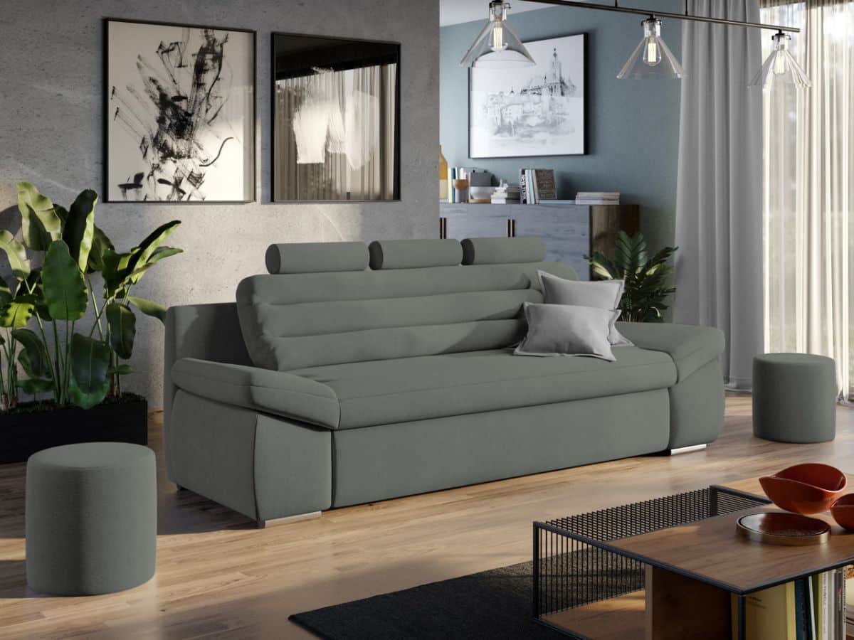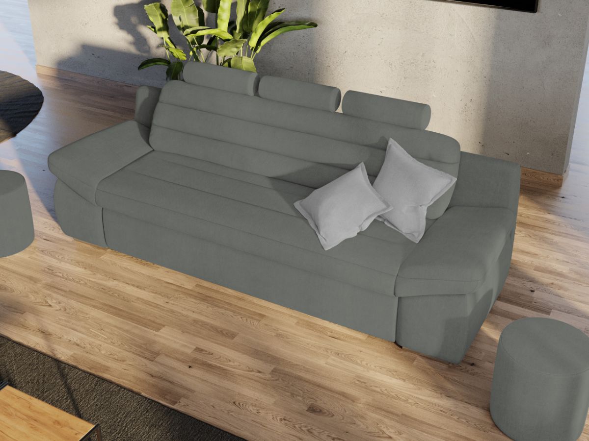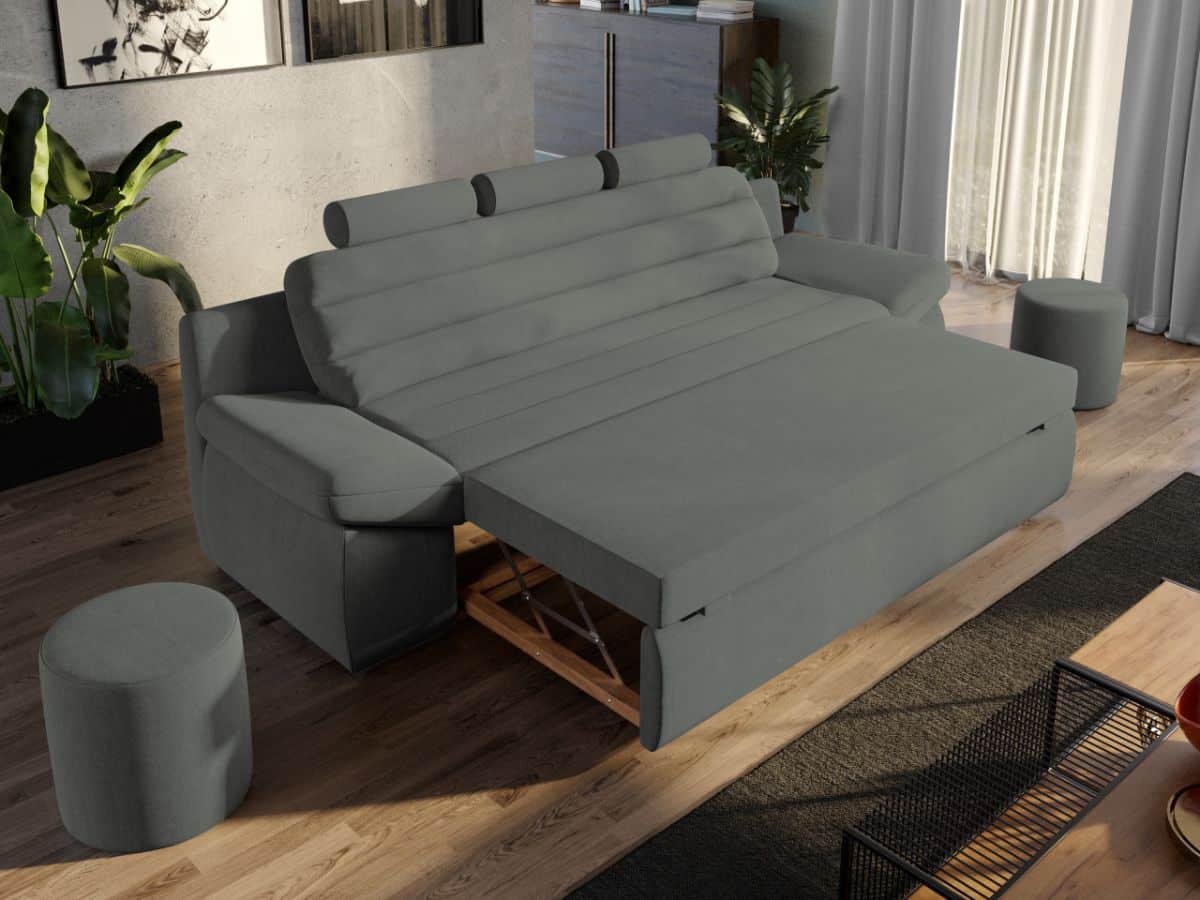 Canapea Quinn Havana 10 Incapatoare si foarte confortabila, Canapea Quinn Havana 10 este alegerea potrivita in materie de mobilier si de amenajarea casei, fiind usor de integrat in orice incapere. Pe langa nivelul de confort pe care il ofera datorita suportului spatarului si al celor 3 tetiere, canapeaua este caracterizata de formele sale moderne, elegante si este potrivita pentru o camera medie sau mare. Te poti relaxa si rasfata dupa o zi lunga pe sezutul sau comod, transformandu-se intr-un pat cu suprafata utila de 185 x 125 cm in doar cateva minute. Canapeaua are dimensiunea de: 260 cm lungime, 100 cm latime, 105 cm inaltime totala . Este tapitata cu stofa de calitate pe diverse culori. Atentie:  Pretul afisat nu include alte accesorii sau obiecte de decor. Taburetele, pernele deco si draperiile se pot achizitiona optional. Livrare gratuita si rapida, 4-10 zile lucratoare prin flota proprie Suntem producatori de tapiterii, fara intermediari Toate piesele de tapiterii au o garantie de 2 ani Sezutul si extensia canapelei sunt din  poliuretan High Resilience. Scheletul este rezistent, realizat pe structura solida de fag si pal. Extensia de tip sertar este pozitionata sub sezutul canapelei. Se deschide ca un sertar, apoi se ridica salteaua din interiorul acestuia. Canapea Quinn Havana 10 se incadreaza cu usurinta in majoritatea locuintelor indiferent de stilul acestora. Puteti alege din mai multe culori pentru stofa. Produsele disponibile le puteti vedea aici Modele Quinn . Dimensiuni Canapea Quinn Havana 10 Lungime: 260 cm Latime: 100 cm Lungime intre brate: 185 cm Inaltime sezut: 52 cm Adancime sezut: 60 cm Inaltime totala: 105 cm Dimensiuni extinsa Lungime extinsa: 185 cm Adancime extinsa: 125 cm Tapiterie Canapea Quinn Havana 10 Tapiteria produsului este din stofa Havana 10 . Nuanta acestui produs nu este pretentioasa, mascheaza eventualele evenimente neplacute prin care se poate murdari sau pata si se integreaza perfect in majoritatea locuintelor. Intretinere: se recomanda ca praful sa se stearga cu un material textil moale (finet) umed si sa nu se curete cu agenti chimici (diluant, acetona). Imaginile sunt cu titlu de prezentare si pot avea mici diferente de nuante in functie de display. Dimensiunile sunt exprimate în centimetri si pot oscila între ± 50 mm.