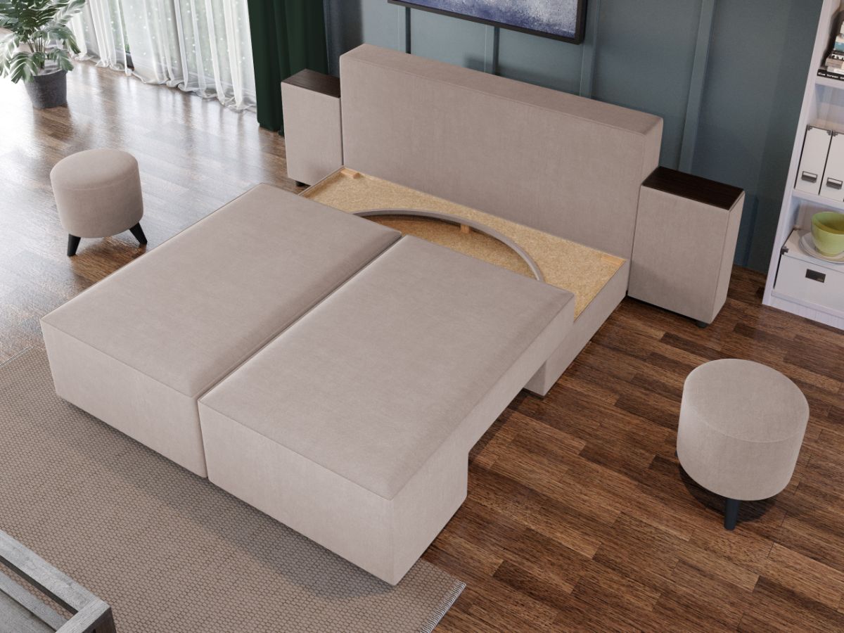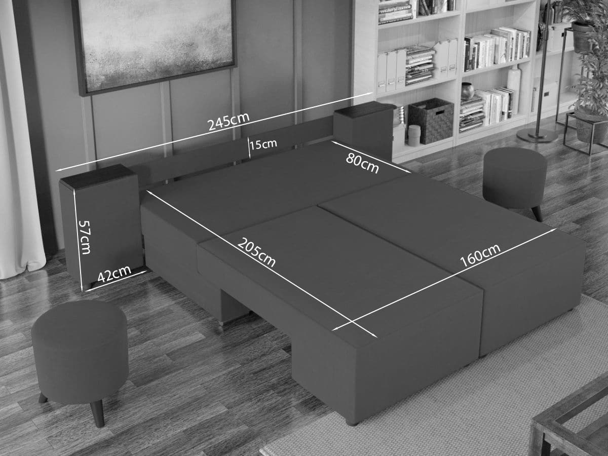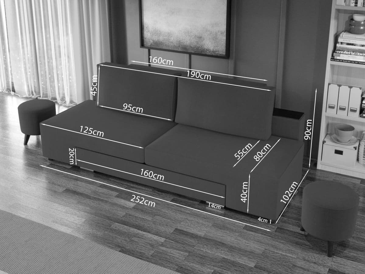 Canapea Valencia Crem Canapea Valencia Crem este o canapea cu design modern , cu dimensiuni generoase, ideala pentru momentele de relaxare. Ofera un plus de confort prin cele 2 perne detasabile , fiind in acelasi timp incapatoare datorita lipsei bratelor. Canapeaua imbina cu succes functionalitatea cu designul, transformandu-se rapid intr-un pat confortabil de 205 x 160 cm . Este prevazuta cu lada de depozitare , care poate fi folosita pentru pastrarea lenjeriei, a pernelor sau a paturii. Dimensiunile canapelei sunt: 252 cm lungime, 102 cm latime, 90 cm inaltime totala . Este tapitata cu stofa de calitate pe diverse culori. Atentie:  Pretul afisat nu include alte accesorii sau obiecte de decor. Taburetele, pernele deco si draperiile se pot achizitiona optional. Livrare gratuita si rapida, 4-10 zile lucratoare prin flota proprie Suntem producatori de tapiterii, fara intermediari Toate piesele de tapiterii au o garantie de 2 ani Sezutul si extensia canapelei sunt din arcuri elicoidale . Lada incorporata este ideala pentru depozitarea lenjeriei sau a altor obiecte. Scheletul este rezistent, realizat pe structura solida de fag si pal. Extensia este de tip rotativ, astfel ca cele doua parti componente ale sezutului se rotesc fiecare din exterior spre interior unindu-se, permitand partii de spatar sa gliseze spre partea din fata si sa se pozitioneze orizontal. Canapea Valencia Crem se incadreaza cu usurinta in majoritatea locuintelor indiferent de stilul acestora. Puteti alege din mai multe culori pentru stofa. Produsele disponibile le puteti vedea aici Modele Valencia . Dimensiuni Canapea Valencia Crem Lungime: 252 cm Latime: 102 cm Inaltime sezut: 40 cm Adancime sezut: 80 cm (fara perne) Adancime sezut: 55 cm (pana in perne) Inaltime spatar mic: 57 cm Inaltime totala: 90 cm Inaltime picioruse: 4 cm Dimensiuni extinsa Lungime extinsa: 205 cm Adancime extinsa: 160 cm Tapiterie Canapea Valencia Crem Tapiteria produsului este din stofa Crem . Nuanta acestui produs nu este pretentioasa, mascheaza eventualele evenimente neplacute prin care se poate murdari sau pata si se integreaza perfect in majoritatea locuintelor. Intretinere: se recomanda ca praful sa se stearga cu un material textil moale (finet) umed si sa nu se curete cu agenti chimici (diluant, acetona). Imaginile sunt cu titlu de prezentare si pot avea mici diferente de nuante in functie de display. Dimensiunile sunt exprimate în centimetri si pot oscila între ± 50 mm.