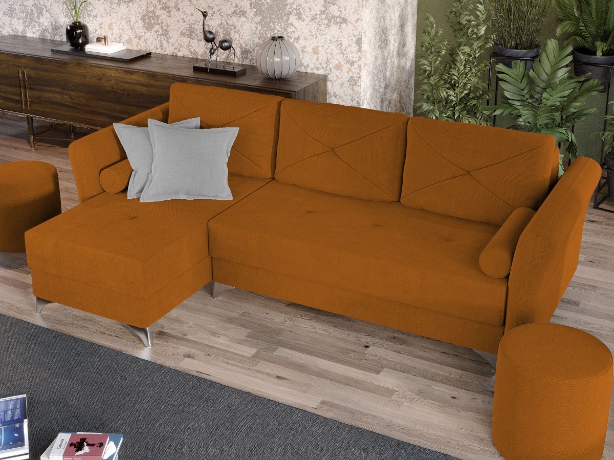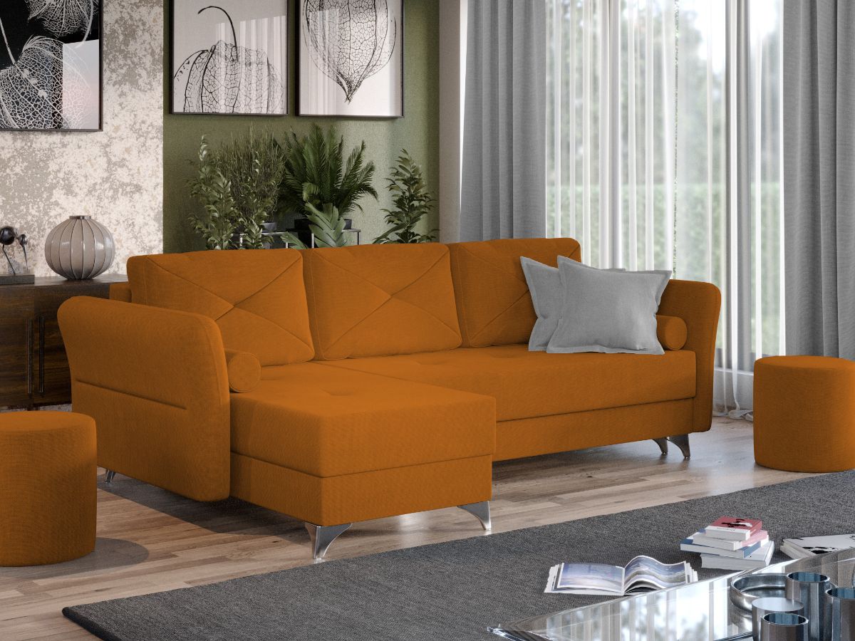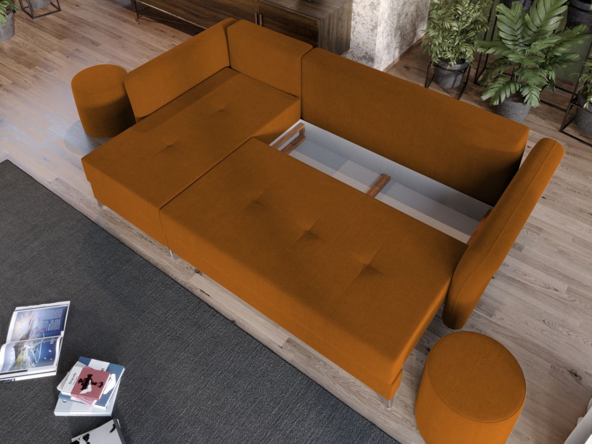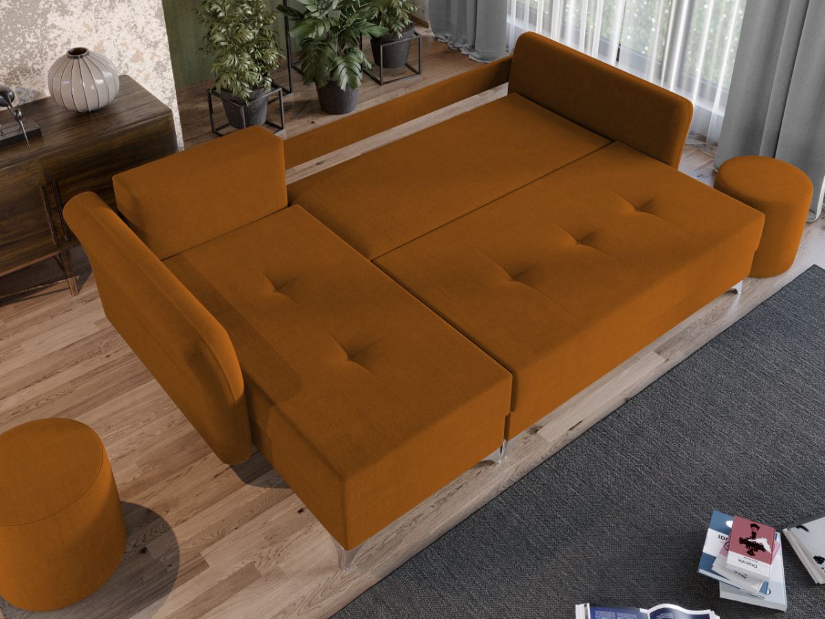 Coltar Bali Portocaliu Coltar Bali Portocaliu are un design modern, contemporan, cu un aspect aparte dat de pernele tip rulou si bratele rotunjite. Picioarele argintii lucioase completeaza eleganta acestui coltar. Pe langa aspect, ofera confort prin cele 5 perne detasabile cat si prin faptul ca se poate transforma rapid intr-un pat ce are lada de depozitare dedesubt. Bratele, sezutul si pernele de la spatar au cusaturi ce dau un design armonios in orice camera. Este recomandat atat pentru incaperi mici sau mari si are dimensiunea de: 260 cm lungime, 150 cm latime, 90 cm inaltime totala . Dupa extindere, obtineti un spatiu pentru odihna si relaxare, cu suprafata utila 220 x 130 cm . Este tapitat cu o stofa de calitate uni pe diverse culori. Atentie: Pretul afisat nu include alte accesorii sau obiecte de decor. Taburetele, pernele deco si draperiile se pot achizitiona optional. Livrare gratuita si rapida, 4-10 zile lucratoare prin flota proprie Suntem producatori de tapiterii, fara intermediari Toate piesele de tapiterii au o garantie de 2 ani Sezutul si extensia coltarului sunt pe relaxa (arcuri elicoidale si poliuretan) . Lada incorporata este ideala pentru depozitarea lenjeriei sau a altor obiecte. Scheletul este rezistent, realizat pe structura solida de fag si pal. Extensia este de tip Doppelliege ce prezinta un sistem actionat prin role, astfel ca partea de sezut se trage si permite partii de spatar sa gliseze spre partea din fata si sa se pozitioneze orizontal. Coltar Bali Portocaliu se incadreaza cu usurinta in majoritatea locuintelor indiferent de stilul acestora. Puteti alege din mai multe culori pentru stofa. Produsele disponibile le puteti vedea aici Modele Bali . Dimensiuni Coltar Bali Portocaliu Lungime: 260 cm Latime: 150 cm Lungime intre brate: 220 cm Inaltime sezut: 45 cm Adancime sezut: 80 cm (fara perne) Adancime sezut: 55 cm (pana in perne) Inaltime cu perne: 90 cm Inaltime fara perne: 75 cm Dimensiuni extins Lungime extins: 220 cm Adancime extins: 130 cm Dimensiuni brate Inaltime brate: 70 cm Lungime brate: 100 cm Tapiterie Coltar Bali Portocaliu Tapiteria produsului este din stofa Portocalie . Nuanta acestui produs nu este pretentioasa, mascheaza eventualele evenimente neplacute prin care se poate murdari sau pata si se integreaza perfect in majoritatea locuintelor. Intretinere: se recomanda ca praful sa se stearga cu un material textil moale (finet) umed si sa nu se curete cu agenti chimici (diluant, acetona). Imaginile sunt cu titlu de prezentare si pot avea mici diferente de nuante in functie de display. Dimensiunile sunt exprimate în centimetri si pot oscila între ± 50 mm.