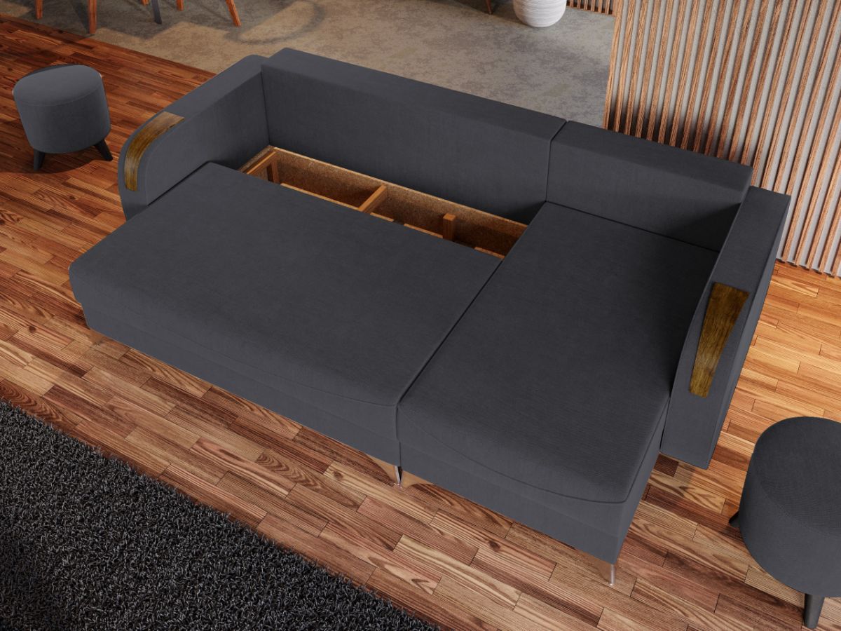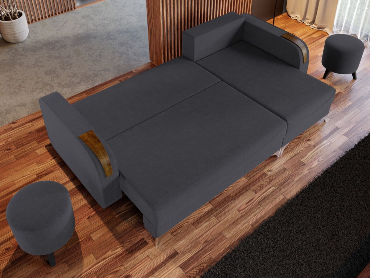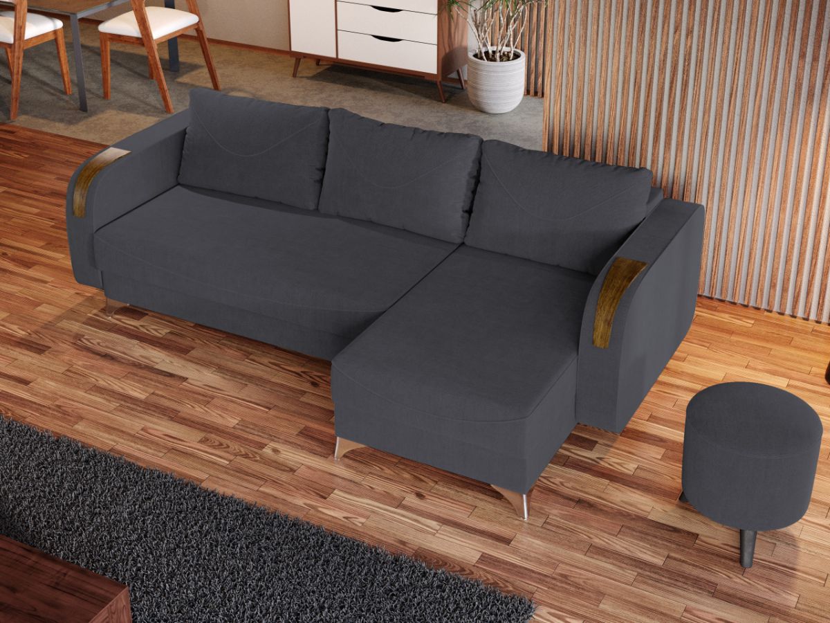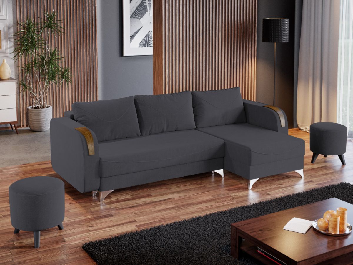 Coltar Londa Gri Inchis Coltar Londa Gri Inchis combina stilul si confortul, fiind alegerea potrivita pentru locuinta dumneavoastra. Picioarele argintii lucioase si insertiile de lemn de pe brate completeaza eleganta acestui coltar. Pe langa aspect, ofera confort prin cele 3 perne detasabile, cat si prin faptul ca se poate transforma rapid intr-un pat ce are lada de depozitare dedesubt. Este recomandat atat pentru incaperi medii, cat si mari si are dimensiunile de: 245 cm lungime, 140 cm latime, 95 cm inaltime totala . Dupa extindere, obtineti un spatiu pentru odihna si relaxare, cu suprafata utila 210 x 140 cm . Este tapitat cu o stofa de calitate uni pe diverse culori. Atentie: Pretul afisat nu include alte accesorii sau obiecte de decor. Taburetele si draperiile se pot achizitiona optional. Livrare gratuita si rapida, 4-10 zile lucratoare prin flota proprie Suntem producatori de tapiterii, fara intermediari Toate piesele de tapiterii au o garantie de 2 ani Sezutul si extensia coltarului sunt pe relaxa (arcuri elicoidale si poliuretan) . Scheletul este rezistent, realizat pe structura solida de fag si pal. Extensia este de tip Doppelliege ce prezinta un sistem actionat prin role, astfel ca partea de sezut se trage si permite partii de spatar sa gliseze spre partea din fata si sa se pozitioneze orizontal. Coltar Londa Gri Inchis se incadreaza cu usurinta in majoritatea locuintelor indiferent de stilul acestora. Puteti alege din mai multe culori pentru stofa. Produsele disponibile le puteti vedea aici Modele Londa . Dimensiuni Coltar Londa Lungime: 245 cm Latime: 140 cm Lungime intre brate: 210 cm Inaltime sezut: 44 cm Inaltime: 95 cm Adancime sezut cu perne: 55 cm Adancime sezut fara perne: 80 cm Adancime selong cu perne: 100 cm Adancime selong fara perne: 120 cm Latime sezlon 72 cm Inaltime picioare: 10 cm Dimensiuni extins Lungime extins: 210 cm Adancime extins: 140 cm Tapiterie Coltar Londa Gri Inchis Tapiteria produsului este din stofa Gri Inchis. Nuanta acestui produs nu este pretentioasa, mascheaza eventualele evenimente neplacute prin care se poate murdari sau pata si se integreaza perfect in majoritatea locuintelor. Intretinere: se recomanda ca praful sa se stearga cu un material textil moale (finet) umed si sa nu se curete cu agenti chimici (diluant, acetona). Imaginile sunt cu titlu de prezentare si pot avea mici diferente de nuante in functie de display. Dimensiunile sunt exprimate în centimetri si pot oscila între ± 50 mm.