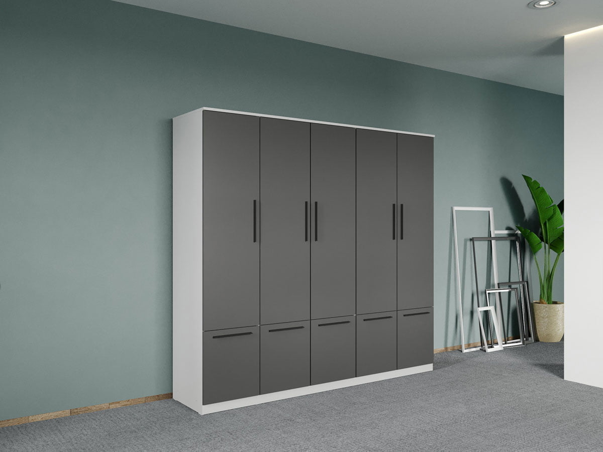 Dulap dormitor Alb-Gri 5U – Madrid – reprezintă un element esențial al dormitorului. Acest dulap oferă multiple spații de depozitare sub formă de polițe, permițându-vă să stocați haine și alte obiecte personale în 10 compartimente distincte. Dimensiuni exterioare: Lățime: 205,4 cm Adâncime: 48 cm Inălțime: 192,5 cm Informații suplimentare Dulap dormitor Alb-Gri 5U – Madrid: Șifonierul face parte din colecția de dormitoare Madrid. Puteți utiliza cele 10 compartimente disponibile pentru a organiza și depozita diverse obiecte. Carcasa și frontul sunt realizate din  PAL melaminat , având o grosime de  16 mm . Dulapul este compus din carcasă, front, polițe și mânere pentru uși, toate asigurând o funcționalitate și accesibilitate optimă. OPȚIONAL: Corp cu sertare – Descarcă schița de montaj Dimensiunile produsului pot varia cu ± 10 mm. Finisajul Alb-Gri perlat în combinație cu Negru (mânere) oferă un plus de eleganță încăperii. Dulapul poate fi amplasat în diverse încăperi, fiind versatil și ușor de integrat în orice tip de amenajare. Produsul se expediază în colete, demontat și este însoțit de toate accesoriile și schița de montaj aferentă. Atenție! Costul produsului nu include accesorii sau elemente decorative suplimentare, precum tablouri, lămpi, lenjerii de pat sau covoare. *Scopul fotografiilor este de a oferi o reprezentare generală, însă există posibilitatea unor mici variații de culoare cauzate de dispozitivele utilizate.