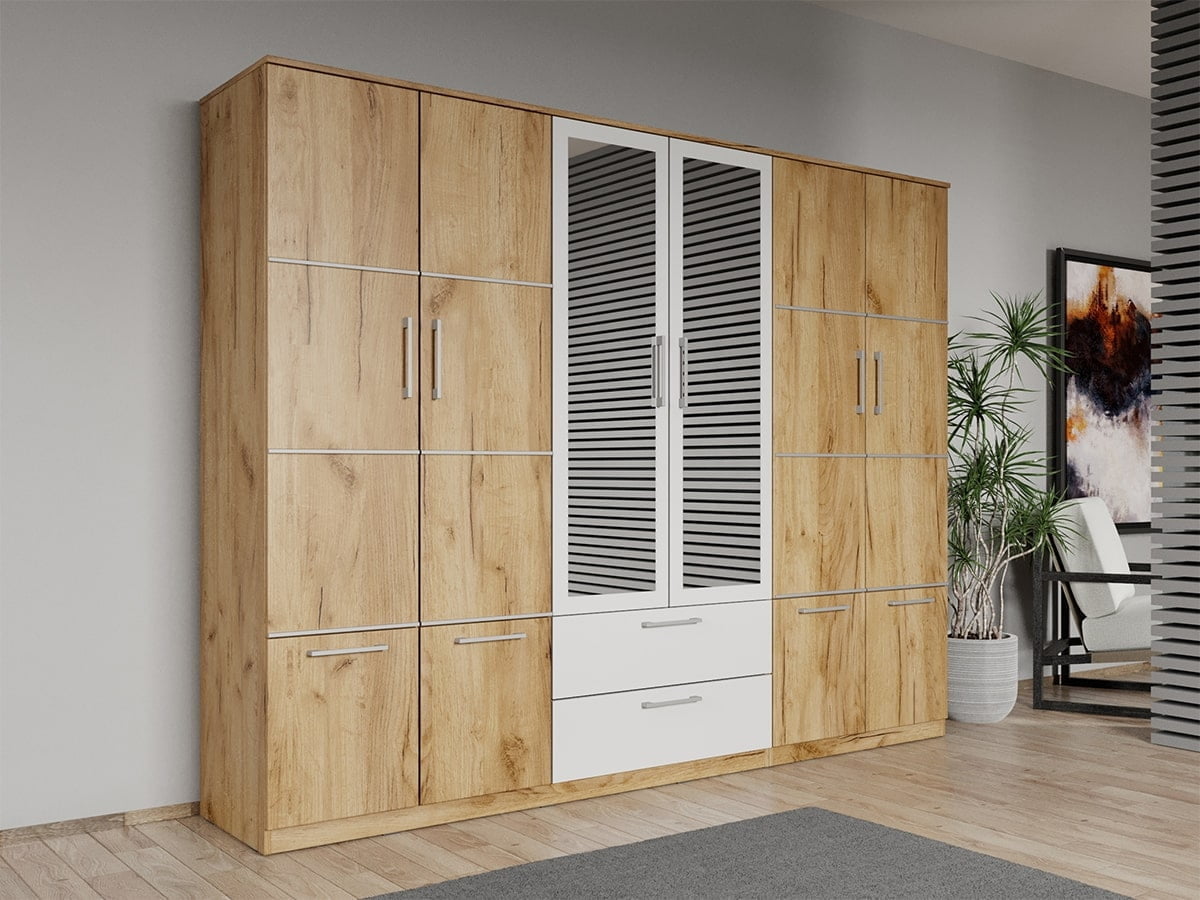 Dulap dormitor Stejar Auriu-alb 6U cu 2 oglinzi – Acapulco