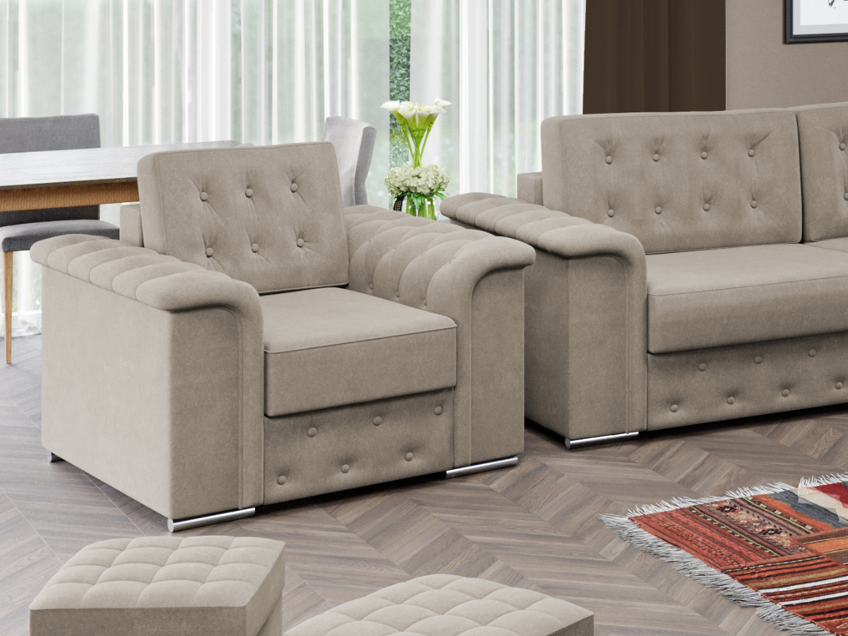 Fotoliu Olimp Crem Fotoliu Olimp Crem combina stilul si confortul, fiind alegerea potrivita pentru locuinta dumneavoastra. Nota eleganta este data de butonii decorativi prezenti pe brate, fata sezutului si perna detasabila, cat si de picioarele cu finisaj argintiu . Are dimensiunile de: 113 cm lungime, 96 cm latime, 90 cm inaltime totala . Este tapitat cu stofa de calitate pe diverse culori. Atentie: Pretul afisat nu include alte accesorii sau obiecte de decor (pernele deco, tablouri, elemente de iluminat, covor etc.). Taburetele se pot achizitiona optional. Livrare gratuita si rapida, 4-10 zile lucratoare prin flota proprie Suntem producatori de tapiterii, fara intermediari, Toate piesele de tapiterii au o garantie de 2 ani Ofera fermitatea optima, dar si confortul dorit prin sezutul fotoliului care este pe relaxa (arcuri elicoidale si poliuretan) . Scheletul este rezistent, realizat pe structura solida de fag si pal . Fotoliu Olimp Crem se incadreaza cu usurinta in majoritatea locuintelor indiferent de stilul acestora. Puteti alege din mai multe culori pentru stofa. Produsele disponibile le puteti vedea aici Modele Olimp . Dimensiuni Fotoliu Olimp Latime: 113 cm Adancime: 96 cm Inaltime totala: 90 cm Inaltime fara perna: 75 cm Latime intre brate: 57 cm Inaltime sezut: 48 cm Adancime sezut cu perna: 55 cm Adancime sezut fara perna: 72 cm Inaltime brate: 67 cm Inaltime picior: 4 cm Tapiterie Fotoliu Olimp Crem Tapiteria produsului este din stofa Crem. Nuanta acestui produs nu este pretentioasa, mascheaza eventualele evenimente neplacute prin care se poate murdari sau pata si se integreaza perfect in majoritatea locuintelor. Intretinere: se recomanda ca praful sa se stearga cu un material textil moale (finet) umed si sa nu se curete cu agenti chimici (diluant, acetona). Imaginile sunt cu titlu de prezentare si pot avea mici diferente de nuante in functie de display. Dimensiunile sunt exprimate în centimetri si pot oscila între ± 50 mm.