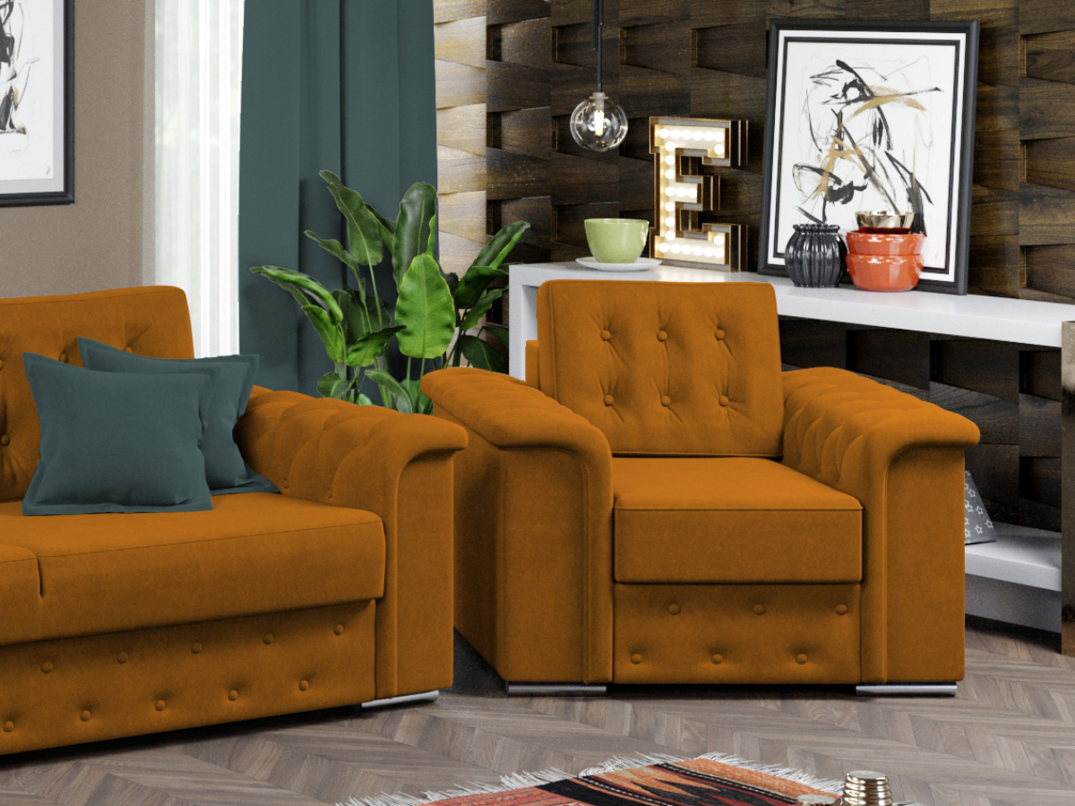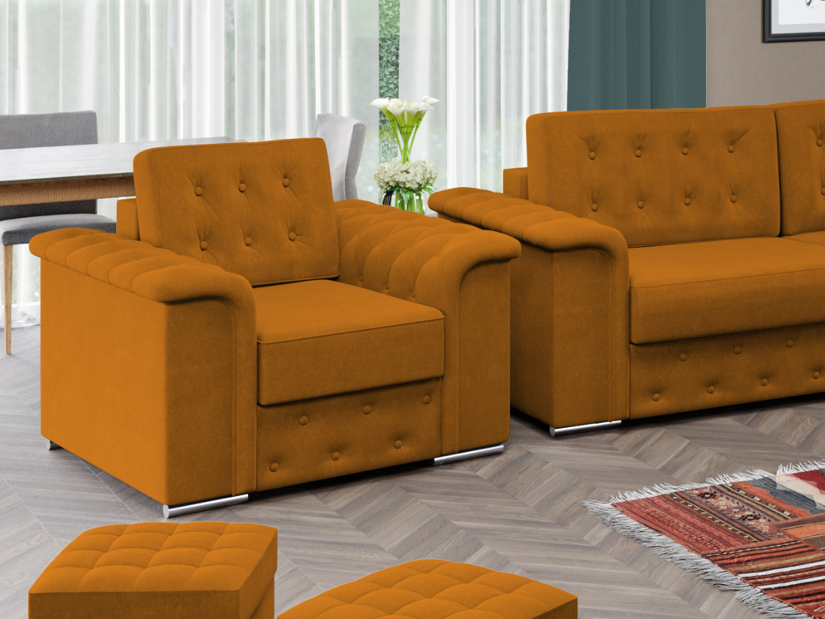 Fotoliu Olimp Portocaliu Fotoliu Olimp Portocaliu combina stilul si confortul, fiind alegerea potrivita pentru locuinta dumneavoastra. Nota eleganta este data de butonii decorativi prezenti pe brate, fata sezutului si perna detasabila, cat si de picioarele cu finisaj argintiu . Are dimensiunile de: 113 cm lungime, 96 cm latime, 90 cm inaltime totala . Este tapitat cu stofa de calitate pe diverse culori. Atentie: Pretul afisat nu include alte accesorii sau obiecte de decor (pernele deco, tablouri, elemente de iluminat, covor etc.). Taburetele se pot achizitiona optional. Livrare gratuita si rapida, 4-10 zile lucratoare prin flota proprie Suntem producatori de tapiterii, fara intermediari, Toate piesele de tapiterii au o garantie de 2 ani Ofera fermitatea optima, dar si confortul dorit prin sezutul fotoliului care este pe relaxa (arcuri elicoidale si poliuretan) . Scheletul este rezistent, realizat pe structura solida de fag si pal . Fotoliu Olimp Portocaliu se incadreaza cu usurinta in majoritatea locuintelor indiferent de stilul acestora. Puteti alege din mai multe culori pentru stofa. Produsele disponibile le puteti vedea aici Modele Olimp . Dimensiuni Fotoliu Olimp Latime: 113 cm Adancime: 96 cm Inaltime totala: 90 cm Inaltime fara perna: 75 cm Latime intre brate: 57 cm Inaltime sezut: 48 cm Adancime sezut cu perna: 55 cm Adancime sezut fara perna: 72 cm Inaltime brate: 67 cm Inaltime picior: 4 cm Tapiterie Fotoliu Olimp Portocaliu Tapiteria produsului este din stofa Portocalie. Nuanta acestui produs nu este pretentioasa, mascheaza eventualele evenimente neplacute prin care se poate murdari sau pata si se integreaza perfect in majoritatea locuintelor. Intretinere: se recomanda ca praful sa se stearga cu un material textil moale (finet) umed si sa nu se curete cu agenti chimici (diluant, acetona). Imaginile sunt cu titlu de prezentare si pot avea mici diferente de nuante in functie de display. Dimensiunile sunt exprimate în centimetri si pot oscila între ± 50 mm.