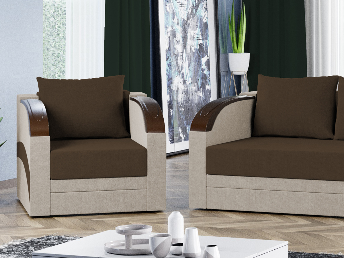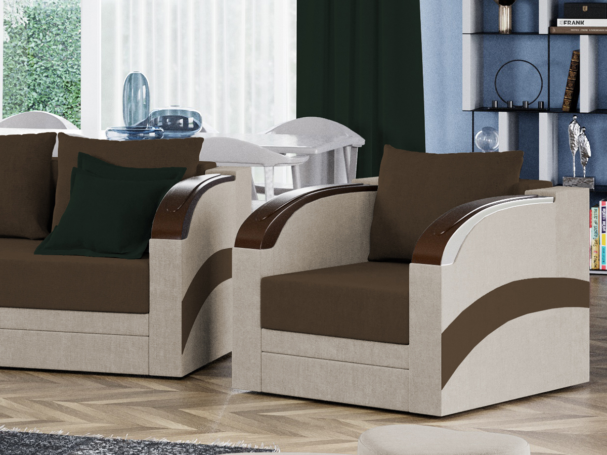 Fotoliu Verona Maro / Crem Fotoliu Verona Maro / Crem este un fotoliu clasic si solid, potrivit oricarei sufragerii. Ornamentul bratelor ofera un plus de eleganta prin imitarea unei piese din lemn masiv, iar perna detasabila ofera sustinere corpului. Te poti aseza astfel incat sa te simti bine si relaxat timp de multe ore, gratie pernei detasabile pentru spatar, care ofera sustinere corpului tau exact in pozitia dorita. Are dimensiunea de: 86 cm lungime, 87 cm latime, 90 cm inaltime totala. Este tapitat cu stofa de calitate pe diverse culori. Atentie: Pretul afisat nu include alte accesorii sau obiecte de decor (pernele deco, tablouri, elemente de iluminat, covor etc.). Taburetele se pot achizitiona optional. Livrare gratuita si rapida, 4-10 zile lucratoare prin flota proprie Suntem producatori de tapiterii, fara intermediari, Toate piesele de tapiterii au o garantie de 2 ani Ofera fermitatea optima, dar si confortul dorit prin sezutul fotoliului care este pe relaxa (arcuri elicoidale si poliuretan) . Scheletul este rezistent, realizat pe structura solida de fag si pal . Fotoliu Verona Maro / Crem se incadreaza cu usurinta in majoritatea locuintelor indiferent de stilul acestora. Puteti alege din mai multe culori pentru stofa. Produsele disponibile le puteti vedea aici Modele Verona . Dimensiuni Fotoliu Verona Latime: 86 cm Adancime: 87 cm Inaltime: 90 cm Latime intre brate: 57 cm Inaltime sezut: 44 cm Inaltime fara perne: 76 cm Adancime sezut cu perne: 46 cm Adancime sezut fara perne: 67 cm Inaltime picioruse: 3 cm Tapiterie Fotoliu Verona Maro / Crem Tapiteria produsului este din stofa Maro si Crem. Nuantele acestui produs nu sunt pretentioase, mascheaza eventualele evenimente neplacute prin care se pot murdari sau pata si se integreaza perfect in majoritatea locuintelor. Intretinere: se recomanda ca praful sa se stearga cu un material textil moale (finet) umed si sa nu se curete cu agenti chimici (diluant, acetona). Imaginile sunt cu titlu de prezentare si pot avea mici diferente de nuante in functie de display. Dimensiunile sunt exprimate în centimetri si pot oscila între ± 50 mm.