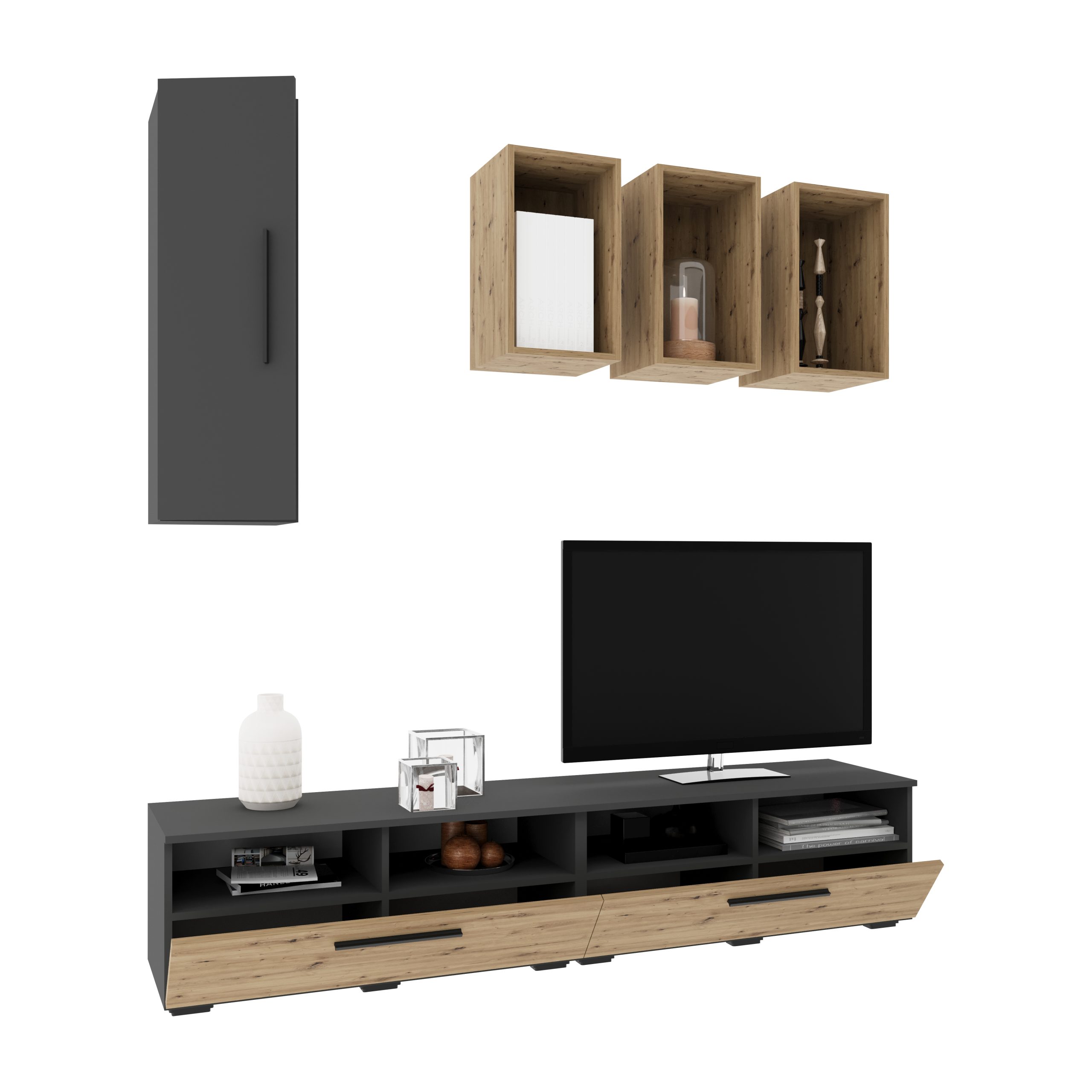 Living Kos V12 este realizat din PAL Melaminat de 16 mm, decor Antracit/Stejar Artisan. Datorita designului simplist, acest set de mobilier poate fi incadrat in orice incapere si totodata va poate contura un aspect placut locuintei dumneavoastra. In plus, este ideal atat pentru spatiile restranse cat si pentru cele mai voluminoase, datorita dimensiunilor atent alese. • Material: PAL Melaminat de 16 mm, accesorii metalice • Dimensiuni: 190 x 40 x 200 cm • Garantie 2 ani • Produsul se livreaza demontat, in cutii, cu toate accesoriile necesare asamblarii acestuia *Televizorul si celelalte obiecte de decor NU sunt incluse. Lungimea totala a ansamblului: L 190 cm • Comoda Kos, O Usa, 2 Polite: 95 x 40 x 39 cm • Raft Kos: 50 x 28 x 30 cm • Soldat Kos, O Usa: 30 x 30 x 95 cm