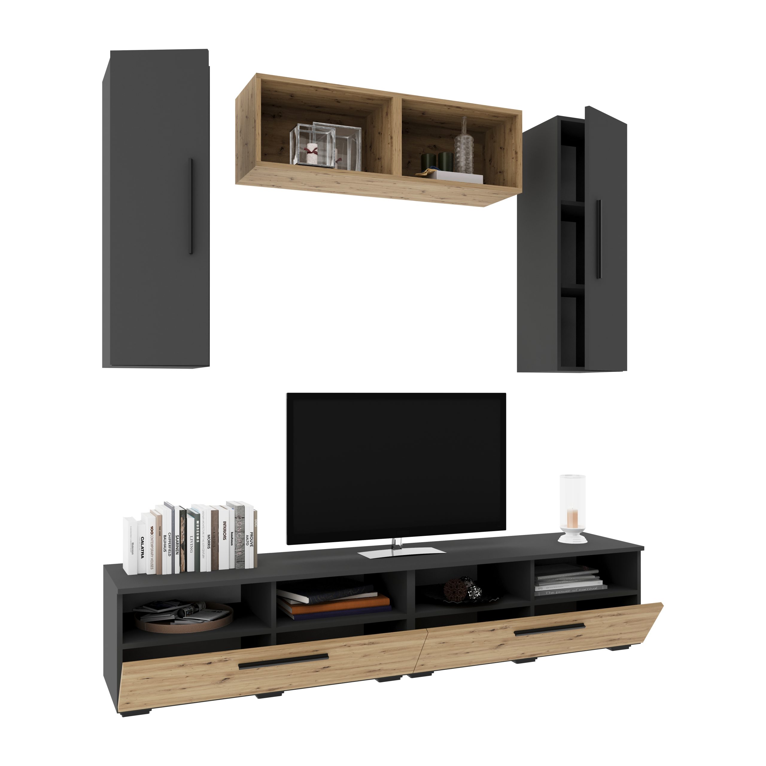 Living Kos V16 este realizat din PAL Melaminat de 16 mm, decor Antracit/Stejar Artisan. Datorita designului simplist, acest set de mobilier poate fi incadrat in orice incapere si totodata va poate contura un aspect placut locuintei dumneavoastra. In plus, este ideal atat pentru spatiile restranse cat si pentru cele mai voluminoase, datorita dimensiunilor atent alese. • Material: PAL Melaminat de 16 mm, accesorii metalice • Dimensiuni: 190 x 40 x 200 cm • Garantie 2 ani • Produsul se livreaza demontat, in cutii, cu toate accesoriile necesare asamblarii acestuia *Televizorul si celelalte obiecte de decor NU sunt incluse. Lungimea totala a ansamblului: L 190 cm • Comoda Kos, O Usa, 2 Polite: 95 x 40 x 39 cm • Raft Kos: 50 x 28 x 30 cm • Soldat Kos, O Usa: 30 x 30 x 95 cm