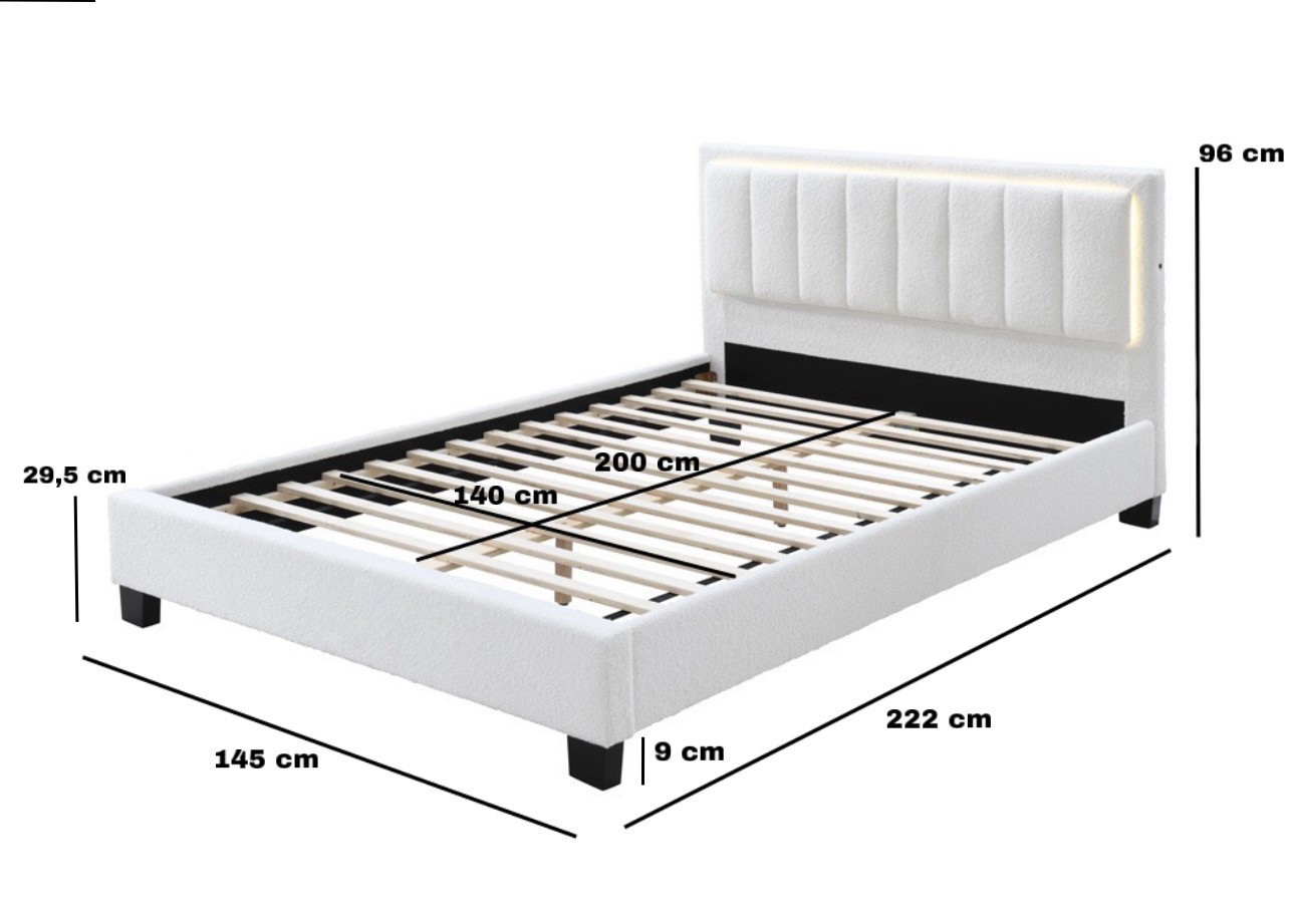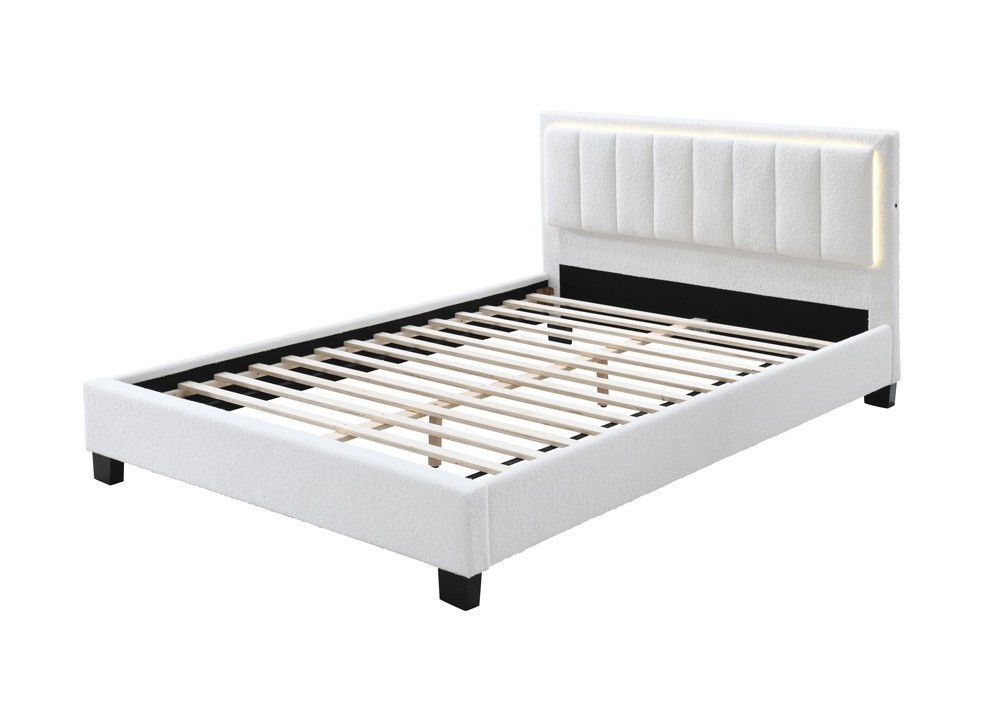Pat tapitat Comfort 1 cu LED, 140×200, cadru din lemn cu somiera fixa, culoare Crem
