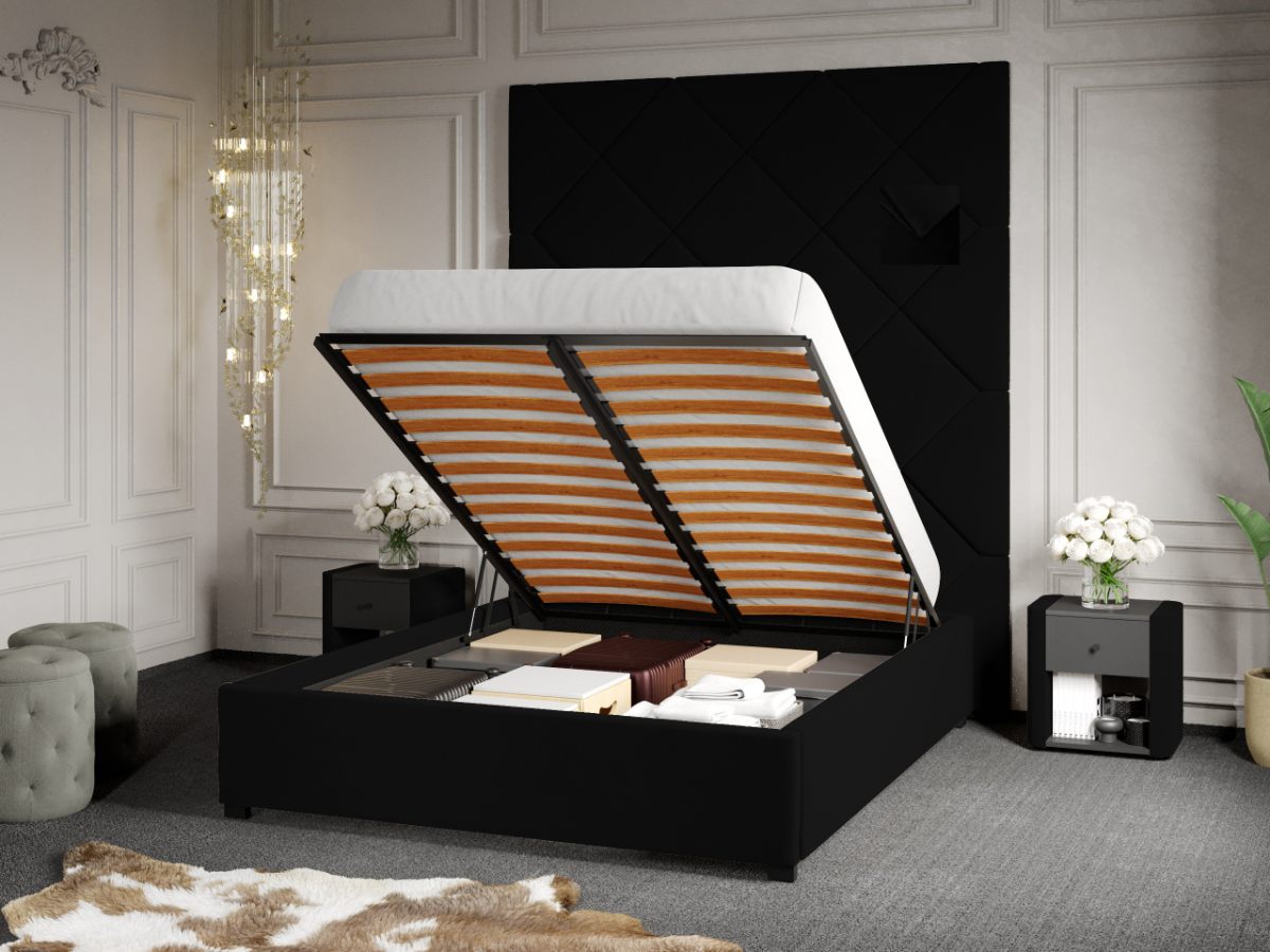 Pat Tapitat cu Panou Inalt C1 Dubai pentru saltea de 190 rabatabil cu lada Negru – Velluto 20 160×190