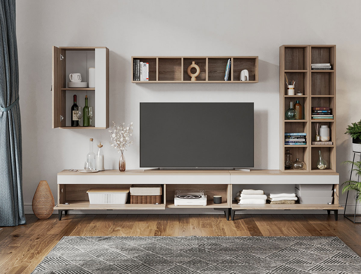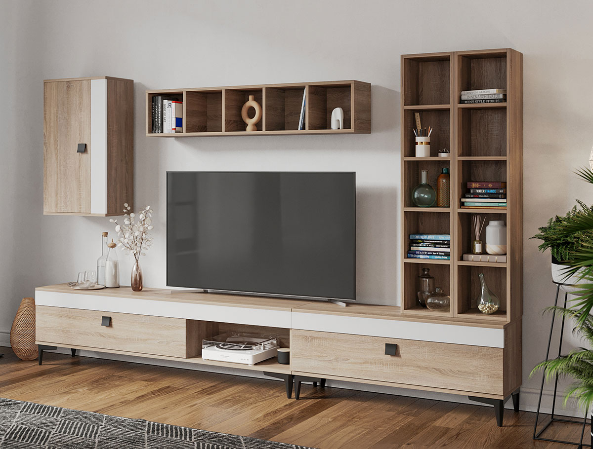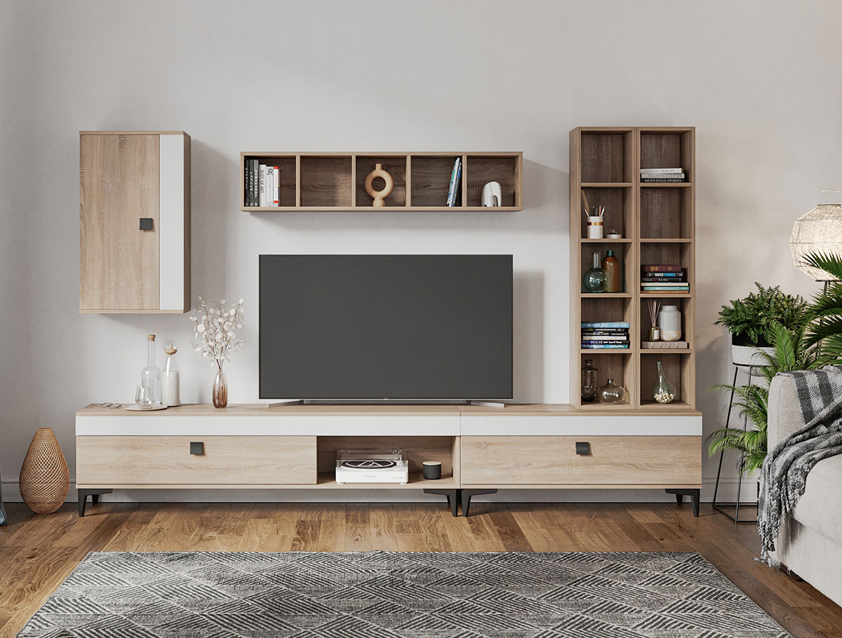 Living Scandinav Rafa 02 Un living in stil scandinav este aerisit, calduros, imbina texturi si materiale diverse si iti da o stare de relaxare, in aceasta categorie de mobilier se incadreza si setul de Living Scandinav Rafa 02. Aceasta colectie are un stil nordic si este alcatuita din mai multe corpuri. Puteti alege direct din configuratiile realizate de noi sau daca doriti puteti creea singuri propria configuratie de living combinand din corpurile de mobila pentru living astfel incat sa se potriveasca perfect in spatiul dorit. Livrare gratuita si rapida, 4-10 zile lucratoare prin flota proprie Suntem producatori de mobilier, fara intermediari Toate piesele de mobilier au o garantie de 2 ani Mobila Sufragerie stil nordic Corpurile sunt construite din PAL melaminat de 16mm cu finisaj alb si sonoma , cel din urma avand o textura similara lemnului, impreuna cu manerele si picioarele negre creeaza un contrast rafinat si un ambient placut. Cantul aplicat este unul de 0,6 ce le permite muchiilor sa fie placute la atingere . Dimensiuni Rafa 02 – Living Scandinav Imaginea alaturata prezinta compartimentarea pentru mobila de sufragerie Rafa. Aceasta configuratie are 6 corpuri modulare , 2 suspendate si 4 nesuspendate. Spatii de depozitare cu usa cat si etajere si polite. Dimensiuni corpuri componente: Comoda TV 1000 Rafa: L 100 x A 33.5 x H 43.7 cm Comoda TV 1600 Rafa: L 160 x A 33.5 x H 43.7 cm Corp Superior Rafa: L 43.9 x A 26.6 x H 77 cm 3 x Corp decorarativ cu polite: L 120 x A 22 x H 25 cm Inaltime picioare 12cm, este inclusa in dimensiunile corpurilor si dimensiunea totala. Dimensiuni totale livin L 260 x A 33.5 x H 170 cm Spatiul de TV: diagonala recomandata maxima 180cm/70″ Toate corpurile se pot pune pe stanga sau pe dreapta in functie de cum doriti. Nu este obligatoriu pozitionarea ca in prezentare. Ele nu sunt prinse unul de celalalt. Info si schite montaj mobila sufragerie Schite de montaj: DESCARCA SCHITA COMODA TV 1000 DESCARCA SCHITA COMODA TV 1600 DESCARCA SCHITA CORP SUPERIOR DESCARCA SCHITA CORP DECORARATIV CU POLITE Pretul afisat nu include alte accesorii sau obiecte de decor (TV, tablouri, elemente de iluminat, covor etc.) Dimensiunile sunt exprimate in cm si pot oscila intre ± 10 mm. Produsul se livreaza demontat si este insotit de accesorii si instructiuni de asamblare.