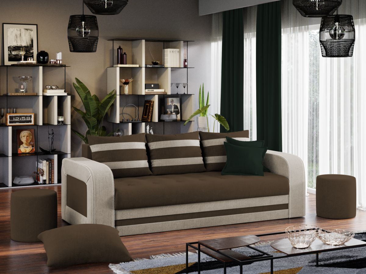 Set Canapea si Fotolii Camila Maro / Crem Set Canapea si Fotolii Camila Maro / Crem va completa cu siguranta casa voastra, oferindu-va spatiul necesar indiferent de situatie: un film cu cei dragi, o cafea cu prietenii sau un loc de odihna pentru oaspeti. Formele rotunjite ale manerelor si ale sezutului adauga un plus de confort acestui set destinat unei sufragerii spatioase. Canapeaua se transforma rapid si usor intr-un pat spatios de 190×155 cm si are dimensiunea de: 230 cm lungime, 103 cm latime, 80 cm inaltime totala . Fotoliul are dimensiunea de: 97 cm lungime, 90 cm latime, 80 cm inaltime totala. Butonii de pe sezut dau un plus de eleganta si stil oricarui living, iar pernele sunt detasabile. Setul este tapitat cu stofa de calitate pe diverse culori. Atentie: Pretul afisat nu include alte accesorii sau obiecte de decor. Taburetele, pernele deco si draperiile se pot achizitiona optional. Livrare gratuita si rapida, 4-10 zile lucratoare prin flota proprie Suntem producatori de tapiterii, fara intermediari Toate piesele de tapiterii au o garantie de 2 ani Sezutul canapelei, al fotoliilor si extensia canapelei sunt pe relaxa (arcuri elicoidale si poliuretan) . Scheletul este rezistent, realizat pe structura solida de fag si pal. Extensia canapelei este de tip Doppelliege, ce prezinta un sistem actionat prin role, astfel ca partea de sezut se trage si permite partii de spatar sa gliseze spre partea din fata si sa se pozitioneze orizontal. Set Canapea si Fotolii Camila Maro / Crem include canapeaua si cele doua fotolii si se incadreaza cu usurinta in majoritatea locuintelor indiferent de stilul acestora. Puteti alege din mai multe culori pentru stofa. Produsele disponibile le puteti vedea aici Modele Camila . Dimensiuni Canapea Camila Lungime: 230 cm Latime: 103 cm Lungime intre brate: 190 cm Inaltime sezut: 47 cm Inaltime: 80 cm Adancime sezut: 80 cm Dimensiuni extinsa Lungime extinsa: 190 cm Adancime extinsa: 155 cm Dimensiuni brate Lungime brate: 100 cm Inaltime brate: 62 cm Grosime brate: 17 cm Dimensiuni Fotoliu Camila Latime: 97 cm Adancime: 90 cm Inaltime: 80 cm Latime intre brate:60 cm Adancime sezut: 80 cm Inaltime sezut: 47 cm Inaltime perna: 50 cm Grosime brate: 17 cm Tapiterie Set Canapea si Fotolii Camila Maro / Crem Tapiteria produselor este din stofa Maro si Crem . Nuantele acestui set nu sunt pretentioase, mascheaza eventualele evenimente neplacute prin care se pot murdari sau pata si se integreaza perfect in majoritatea locuintelor. Intretinere: se recomanda ca praful sa se stearga cu un material textil moale (finet) umed si sa nu se curete cu agenti chimici (diluant, acetona). Imaginile sunt cu titlu de prezentare si pot avea mici diferente de nuante in functie de display. Dimensiunile sunt exprimate în centimetri si pot oscila între ± 50 mm.