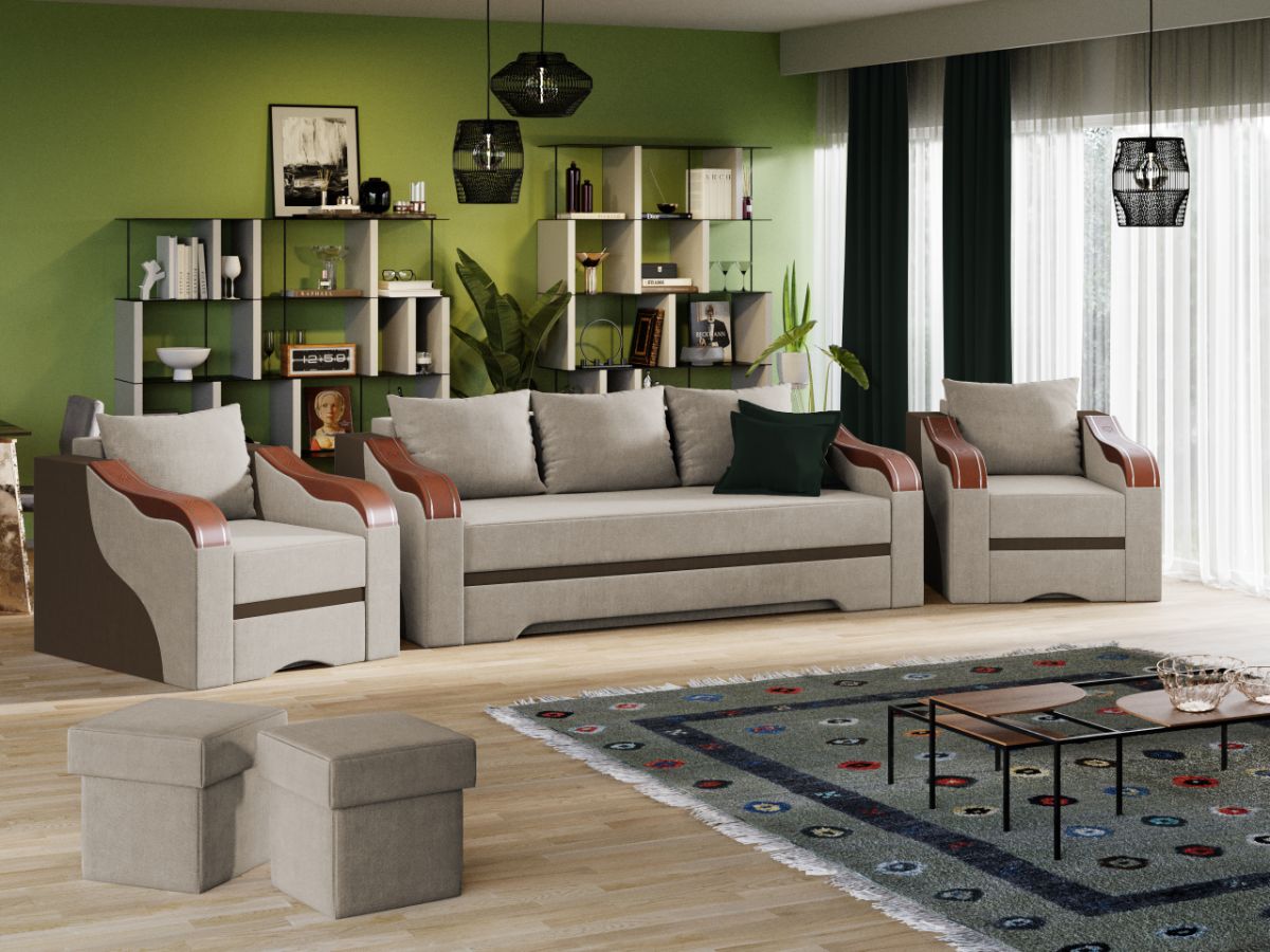 Set Canapea si Fotolii Julia Crem / Maro Set Canapea si Fotolii Julia Crem / Maro este format dintr-o canapea si doua fotolii clasice si solide. Ornamentele aplicate ale bratelor completeaza forma eleganta a acestui set incapator. Canapeaua imbina stilul cu functionalitatea prin faptul ca este prevazuta cu lada pentru depozitare si se transforma rapid si usor intr-un pat spatios de 190 x 150 cm atunci cand scoti pernele si tragi sezutul in exterior coborand spatarul. Aceasta are dimensiunea de: 230 cm lungime, 106 cm latime, 80 cm inaltime totala . Fotoliul are dimensiunea de: 85 cm lungime, 87 cm latime, 80 cm inaltime totala . Ofera un confort sporit prin pernele detasabile . Setul este tapitat cu stofa de calitate pe diverse culori. Atentie: Pretul afisat nu include alte accesorii sau obiecte de decor. Taburetele, pernele deco si draperiile se pot achizitiona optional. Livrare gratuita si rapida, 4-10 zile lucratoare prin flota proprie Suntem producatori de tapiterii, fara intermediari Toate piesele de tapiterii au o garantie de 2 ani Sezutul canapelei, al fotoliilor si extensia canapelei sunt pe relaxa (arcuri elicoidale si poliuretan) . Scheletul este rezistent, realizat pe structura solida de fag si pal. Extensia canapelei este de tip Doppelliege, ce prezinta un sistem actionat prin role, astfel ca partea de sezut se trage si permite partii de spatar sa gliseze spre partea din fata si sa se pozitioneze orizontal. Set Canapea si Fotolii Julia Crem / Maro include canapeaua si cele doua fotolii si se incadreaza cu usurinta in majoritatea locuintelor indiferent de stilul acestora. Puteti alege din mai multe culori pentru stofa. Produsele disponibile le puteti vedea aici Modele Julia . Dimensiuni Canapea Julia Lungime: 230 cm Latime: 106 cm Lungime intre brate: 190 cm Inaltime sezut: 45 cm Inaltime: 80 cm Adancime sezut: 80 cm Dimensiuni extinsa Lungime extinsa: 190 cm Adancime extinsa: 150 cm Dimensiuni Fotoliu Julia Latime: 85 cm Adancime: 87 cm Inaltime: 80 cm Latime intre brate: 58 cm Inaltime sezut: 48 cm Grosime brate: 12-13 cm Tapiterie Set Canapea si Fotolii Julia Crem / Maro Tapiteria produselor este din stofa Crem si Maro . Nuantele acestui set nu sunt pretentioase, mascheaza eventualele evenimente neplacute prin care se pot murdari sau pata si se integreaza perfect in majoritatea locuintelor. Intretinere: se recomanda ca praful sa se stearga cu un material textil moale (finet) umed si sa nu se curete cu agenti chimici (diluant, acetona). Imaginile sunt cu titlu de prezentare si pot avea mici diferente de nuante in functie de display. Dimensiunile sunt exprimate în centimetri si pot oscila între ± 50 mm.