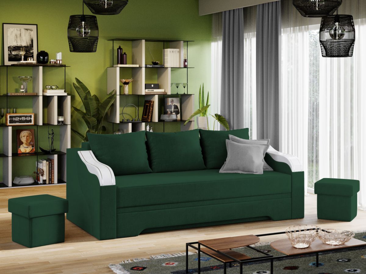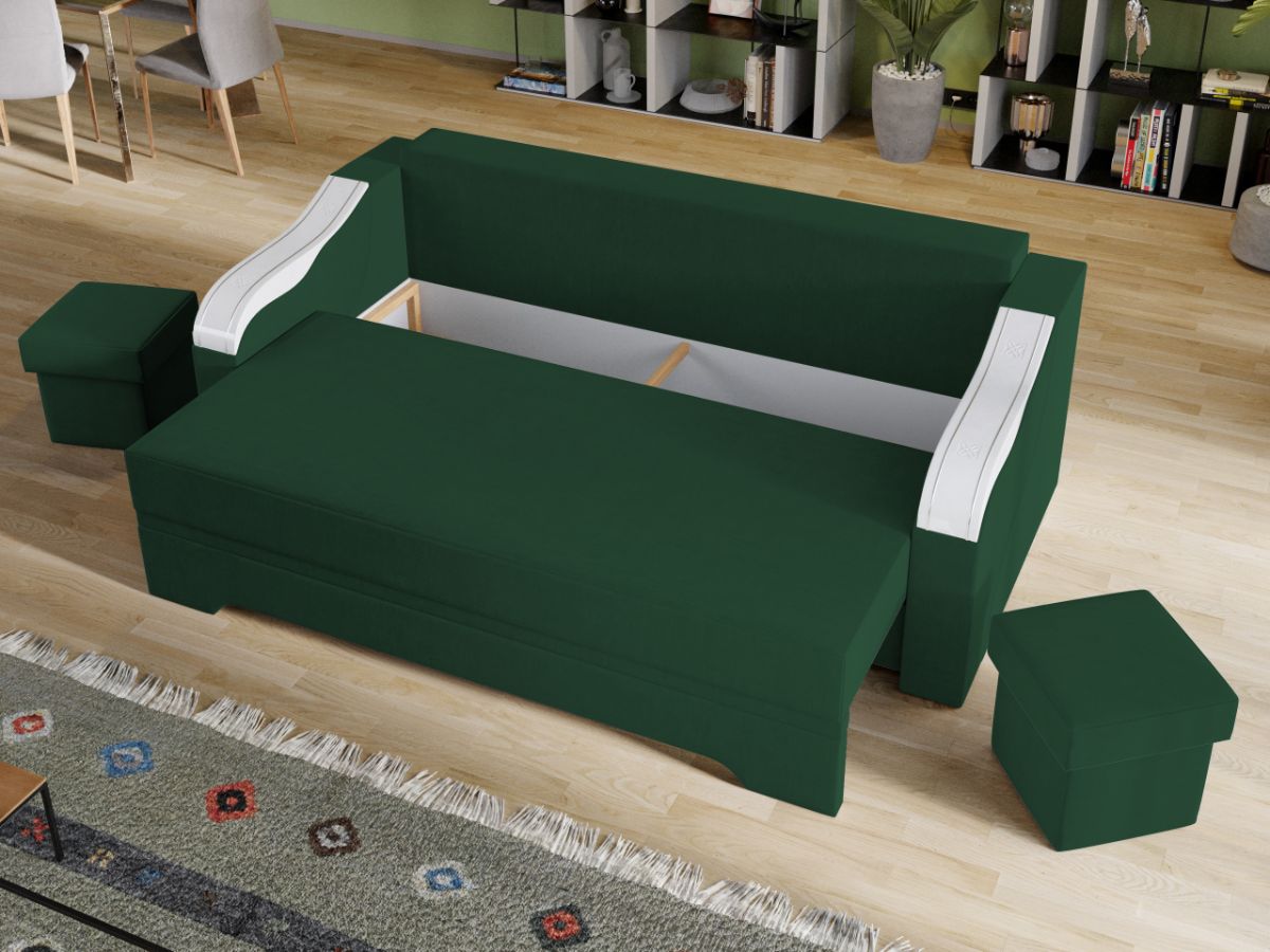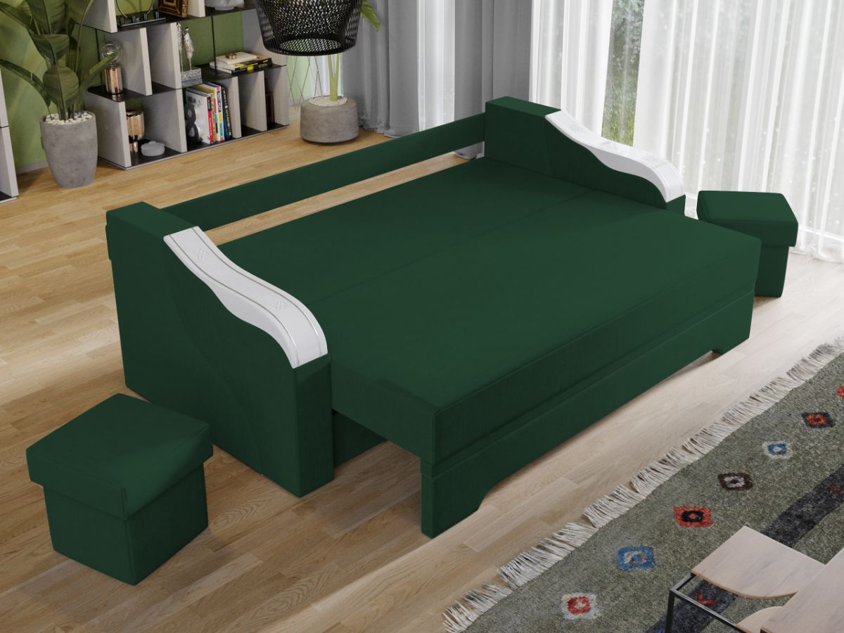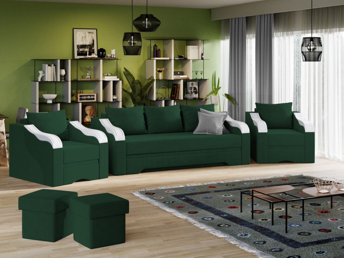 Set Canapea si Fotolii Julia Verde Set Canapea si Fotolii Julia Verde este format dintr-o canapea si doua fotolii clasice si solide. Ornamentele aplicate ale bratelor completeaza forma eleganta a acestui set incapator. Canapeaua imbina stilul cu functionalitatea prin faptul ca este prevazuta cu lada pentru depozitare si se transforma rapid si usor intr-un pat spatios de 190 x 150 cm atunci cand scoti pernele si tragi sezutul in exterior coborand spatarul. Aceasta are dimensiunea de: 230 cm lungime, 106 cm latime, 80 cm inaltime totala . Fotoliul are dimensiunea de: 85 cm lungime, 87 cm latime, 80 cm inaltime totala . Ofera un confort sporit prin pernele detasabile . Setul este tapitat cu stofa de calitate pe diverse culori. Atentie: Pretul afisat nu include alte accesorii sau obiecte de decor. Taburetele, pernele deco si draperiile se pot achizitiona optional. Livrare gratuita si rapida, 4-10 zile lucratoare prin flota proprie Suntem producatori de tapiterii, fara intermediari Toate piesele de tapiterii au o garantie de 2 ani Sezutul canapelei, al fotoliilor si extensia canapelei sunt pe relaxa (arcuri elicoidale si poliuretan) . Scheletul este rezistent, realizat pe structura solida de fag si pal. Extensia canapelei este de tip Doppelliege, ce prezinta un sistem actionat prin role, astfel ca partea de sezut se trage si permite partii de spatar sa gliseze spre partea din fata si sa se pozitioneze orizontal. Set Canapea si Fotolii Julia Verde include canapeaua si cele doua fotolii si se incadreaza cu usurinta in majoritatea locuintelor indiferent de stilul acestora. Puteti alege din mai multe culori pentru stofa. Produsele disponibile le puteti vedea aici Modele Julia . Dimensiuni Canapea Julia Lungime: 230 cm Latime: 106 cm Lungime intre brate: 190 cm Inaltime sezut: 45 cm Inaltime: 80 cm Adancime sezut: 80 cm Dimensiuni extinsa Lungime extinsa: 190 cm Adancime extinsa: 150 cm Dimensiuni Fotoliu Julia Latime: 85 cm Adancime: 87 cm Inaltime: 80 cm Latime intre brate: 58 cm Inaltime sezut: 48 cm Grosime brate: 12-13 cm Tapiterie Set Canapea si Fotolii Julia Verde Tapiteria produselor este din stofa Verde . Nuanta acestui set nu este pretentioasa, mascheaza eventualele evenimente neplacute prin care se poate murdari sau pata si se integreaza perfect in majoritatea locuintelor. Intretinere: se recomanda ca praful sa se stearga cu un material textil moale (finet) umed si sa nu se curete cu agenti chimici (diluant, acetona). Imaginile sunt cu titlu de prezentare si pot avea mici diferente de nuante in functie de display. Dimensiunile sunt exprimate în centimetri si pot oscila între ± 50 mm.