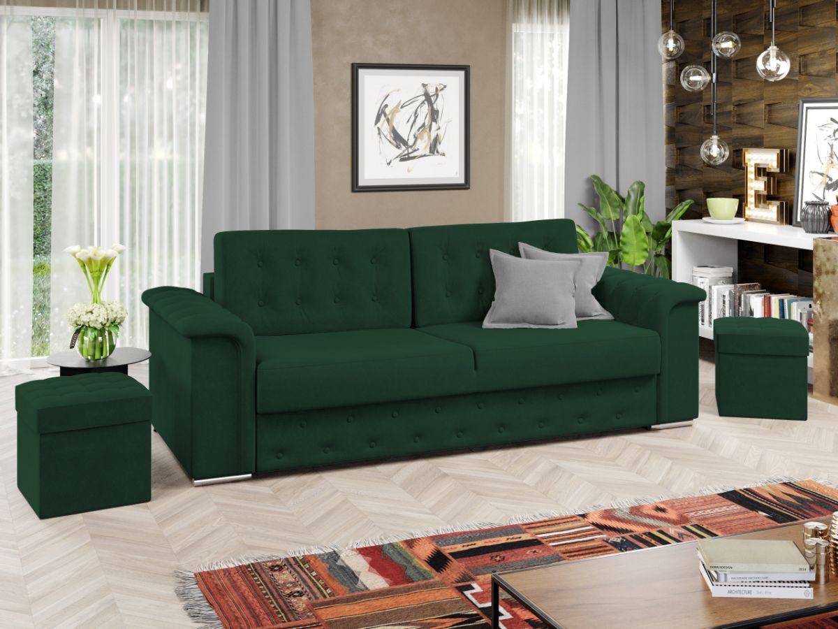 Set Canapea si Fotolii Olimp Verde Set Canapea si Fotolii Olimp Verde combina stilul si confortul, fiind alegerea potrivita pentru locuinta dumneavoastra. Nota eleganta este data de butonii decorativi prezenti pe brate, fata sezutului, pernele detasabile, cat si de picioarele cu finisaj argintiu . Imbina cu succes functionalitatea cu designul, canapeaua transformandu-se rapid intr-un pat confortabil de 190 x 150 cm . Este potrivit pentru un living cu dimensiuni generoase. Canapeaua are dimensiunile de: 250 cm lungime, 105 cm latime, 95 cm inaltime totala , iar fotoliul de: 113 cm lungime, 96 cm latime, 90 cm inaltime totala . Setul este tapitat cu stofa de calitate pe diverse culori. Atentie: Pretul afisat nu include alte accesorii sau obiecte de decor. Taburetele, pernele deco si draperiile se pot achizitiona optional. Livrare gratuita si rapida, 4-10 zile lucratoare prin flota proprie Suntem producatori de tapiterii, fara intermediari Toate piesele de tapiterii au o garantie de 2 ani Sezutul canapelei, al fotoliilor si extensia canapelei sunt pe relaxa (arcuri elicoidale si poliuretan). Scheletul este rezistent, realizat pe structura solida de fag si pal. Extensia canapelei este de tip Doppelliege, ce prezinta un sistem actionat prin role, astfel ca partea de sezut se trage si permite partii de spatar sa gliseze spre partea din fata si sa se pozitioneze orizontal. Set Canapea si Fotolii Olimp Verde include canapeaua si cele doua fotolii si se incadreaza cu usurinta in majoritatea locuintelor indiferent de stilul acestora. Puteti alege din mai multe culori pentru stofa. Produsele disponibile le puteti vedea aici Modele Olimp . Dimensiuni Canapea Olimp Lungime: 250 cm Latime: 105 cm Inaltime sezut: 46 cm Inaltime totala: 95 cm Inaltime fara perne: 72 cm Adancime sezut cu perne: 62 cm Adancime sezut fara perne: 85 cm Inaltime brate: 67 cm Lungime picior: 22 cm Inaltime picior: 4 cm Dimensiuni extinsa Lungime extinsa: 190 cm Adancime extinsa: 150 cm Dimensiuni Fotoliu Olimp Latime: 113 cm Adancime: 96 cm Inaltime totala: 90 cm Inaltime fara perna: 75 cm Latime intre brate: 57 cm Inaltime sezut: 48 cm Adancime sezut cu perna: 55 cm Adancime sezut fara perna: 72 cm Inaltime brate: 67 cm Inaltime picior: 4 cm Tapiterie Set Canapea si Fotolii Olimp Verde Tapiteria produselor este din stofa Verde . Nuanta acestui set nu este pretentioasa, mascheaza eventualele evenimente neplacute prin care se poate murdari sau pata si se integreaza perfect in majoritatea locuintelor. Intretinere: se recomanda ca praful sa se stearga cu un material textil moale (finet) umed si sa nu se curete cu agenti chimici (diluant, acetona). Imaginile sunt cu titlu de prezentare si pot avea mici diferente de nuante in functie de display. Dimensiunile sunt exprimate în centimetri si pot oscila între ± 50 mm.