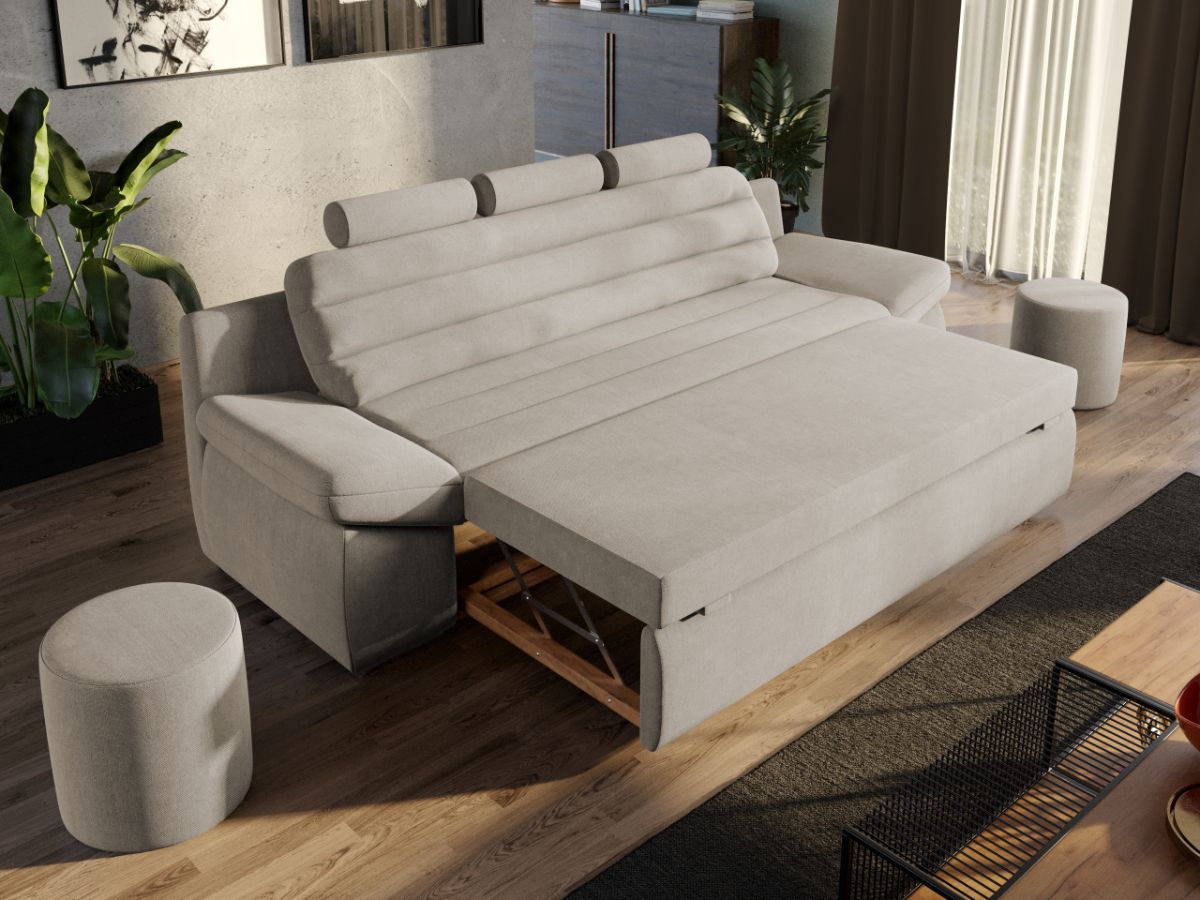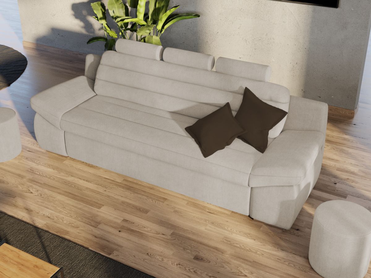 Set Canapea si Fotolii Quinn Crem Set Canapea si Fotolii Quinn Crem este alegerea potrivita in materie de mobilier si de amenajarea casei, fiind usor de integrat in orice incapere. Pe langa nivelul de confort pe care il ofera datorita suportului spatarelor si al tetierelor, setul este caracterizat de formele sale moderne, elegante si este potrivit pentru o camera mare. Te poti relaxa si rasfata dupa o zi lunga pe sezutul comod, produsele fiind incapatoare si confortabile. Canapeaua se transforma intr-un pat cu suprafata utila de 185 x 125 cm  in doar cateva minute si are dimensiunea de: 260 cm lungime, 100 cm latime, 105 cm inaltime totala . Fotoliul are dimensiunea de: 130 cm lungime, 100 cm latime, 105 cm inaltime   totala . Setul este tapitat cu stofa de calitate pe diverse culori. Atentie:  Pretul afisat nu include alte accesorii sau obiecte de decor. Taburetele, pernele deco si draperiile se pot achizitiona optional. Livrare gratuita si rapida, 4-10 zile lucratoare prin flota proprie Suntem producatori de tapiterii, fara intermediari Toate piesele de tapiterii au o garantie de 2 ani Sezutul canapelei, al fotoliilor si extensia canapelei sunt din  poliuretan High Resilience.  Scheletul este rezistent, realizat pe structura solida de fag si pal. Extensia de tip sertar este pozitionata sub sezutul canapelei. Se deschide ca un sertar, apoi se ridica salteaua din interiorul acestuia. Set Canapea si Fotolii Quinn Crem include canapeaua si cele doua fotolii si se incadreaza cu usurinta in majoritatea locuintelor indiferent de stilul acestora. Puteti alege din mai multe culori pentru stofa. Produsele disponibile le puteti vedea aici Modele Quinn . Dimensiuni Canapea Quinn Lungime: 260 cm Latime: 100 cm Lungime intre brate: 185 cm Inaltime sezut: 52 cm Adancime sezut: 60 cm Inaltime totala: 105 cm Dimensiuni extinsa Lungime extinsa: 185 cm Adancime extinsa: 125 cm Dimensiuni Fotoliu Quinn Latime: 130 cm Adancime: 100 cm Inaltime: 105 cm Latime intre brate: 57 cm Adancime sezut: 60 cm Inaltime sezut: 52 cm Inaltime spatar: 48 cm Dimensiuni brate Inaltime brate: 60 cm Lungime brate: 70 cm Tapiterie Set Canapea si Fotolii Quinn Crem Tapiteria produselor este din stofa Crem . Nuanta acestui set nu este pretentioasa, mascheaza eventualele evenimente neplacute prin care se poate murdari sau pata si se integreaza perfect in majoritatea locuintelor. Intretinere: se recomanda ca praful sa se stearga cu un material textil moale (finet) umed si sa nu se curete cu agenti chimici (diluant, acetona). Imaginile sunt cu titlu de prezentare si pot avea mici diferente de nuante in functie de display. Dimensiunile sunt exprimate în centimetri si pot oscila între ± 50 mm.