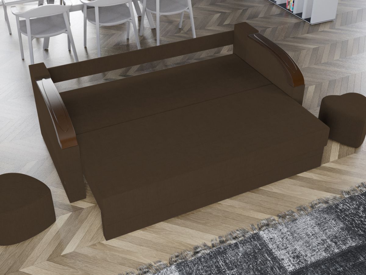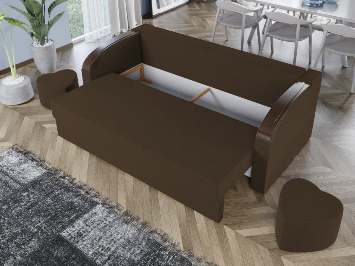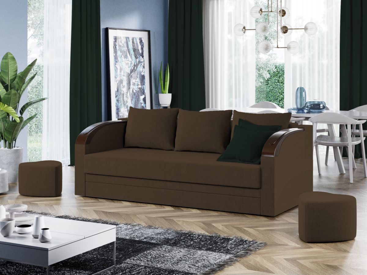 Set Canapea si Fotolii Verona Maro Set Canapea si Fotolii Verona Maro este format dintr-o canapea si doua fotolii clasice si solide. Ornamentul bratelor ofera un plus de eleganta prin imitarea unei piese din lemn masiv. Canapeaua imbina stilul cu functionalitatea prin faptul ca este prevazuta cu lada pentru depozitare si se transforma rapid si usor intr-un pat spatios de 190 x 150 cm atunci cand scoti pernele si tragi sezutul in exterior coborand spatarul. Aceasta are dimensiunea de: 220 cm lungime, 102 cm latime, 85 cm inaltime totala . Fotoliul are dimensiunea de: 86 cm lungime, 87 cm latime, 85 cm inaltime totala . Ofera un confort sporit prin pernele detasabile . Setul este tapitat cu stofa de calitate pe diverse culori. Atentie: Pretul afisat nu include alte accesorii sau obiecte de decor. Taburetele, pernele deco si draperiile se pot achizitiona optional. Livrare gratuita si rapida, 4-10 zile lucratoare prin flota proprie Suntem producatori de tapiterii, fara intermediari Toate piesele de tapiterii au o garantie de 2 ani Sezutul canapelei, al fotoliilor si extensia canapelei sunt pe relaxa (arcuri elicoidale si poliuretan) . Scheletul este rezistent, realizat pe structura solida de fag si pal. Extensia canapelei este de tip Doppelliege, ce prezinta un sistem actionat prin role, astfel ca partea de sezut se trage si permite partii de spatar sa gliseze spre partea din fata si sa se pozitioneze orizontal. Set Canapea si Fotolii Verona Maro include canapeaua si cele doua fotolii si se incadreaza cu usurinta in majoritatea locuintelor indiferent de stilul acestora. Puteti alege din mai multe culori pentru stofa. Produsele disponibile le puteti vedea aici Modele Verona . Dimensiuni Canapea Verona Lungime: 220 cm Latime: 102 cm Lungime intre brate: 190 cm Inaltime sezut: 44 cm Inaltime: 85 cm Inaltime fara perne: 76 cm Adancime sezut cu perne: 58 cm Adancime sezut fara perne: 80 cm Inaltime picioruse: 3 cm Dimensiuni extinsa Lungime extinsa: 190 cm Adancime extinsa: 150 cm Dimensiuni Fotoliu Verona Latime: 86 cm Adancime: 87 cm Inaltime: 85 cm Latime intre brate: 57 cm Inaltime sezut: 44 cm Inaltime fara perne: 76 cm Adancime sezut cu perne: 58 cm Adancime sezut fara perne: 80 cm Inaltime picioruse: 3 cm Tapiterie Set Canapea si Fotolii Verona Maro Tapiteria produselor este din stofa Maro . Nuanta acestui set nu este pretentioasa, mascheaza eventualele evenimente neplacute prin care se poate murdari sau pata si se integreaza perfect in majoritatea locuintelor. Intretinere: se recomanda ca praful sa se stearga cu un material textil moale (finet) umed si sa nu se curete cu agenti chimici (diluant, acetona). Imaginile sunt cu titlu de prezentare si pot avea mici diferente de nuante in functie de display. Dimensiunile sunt exprimate în centimetri si pot oscila între ± 50 mm.
