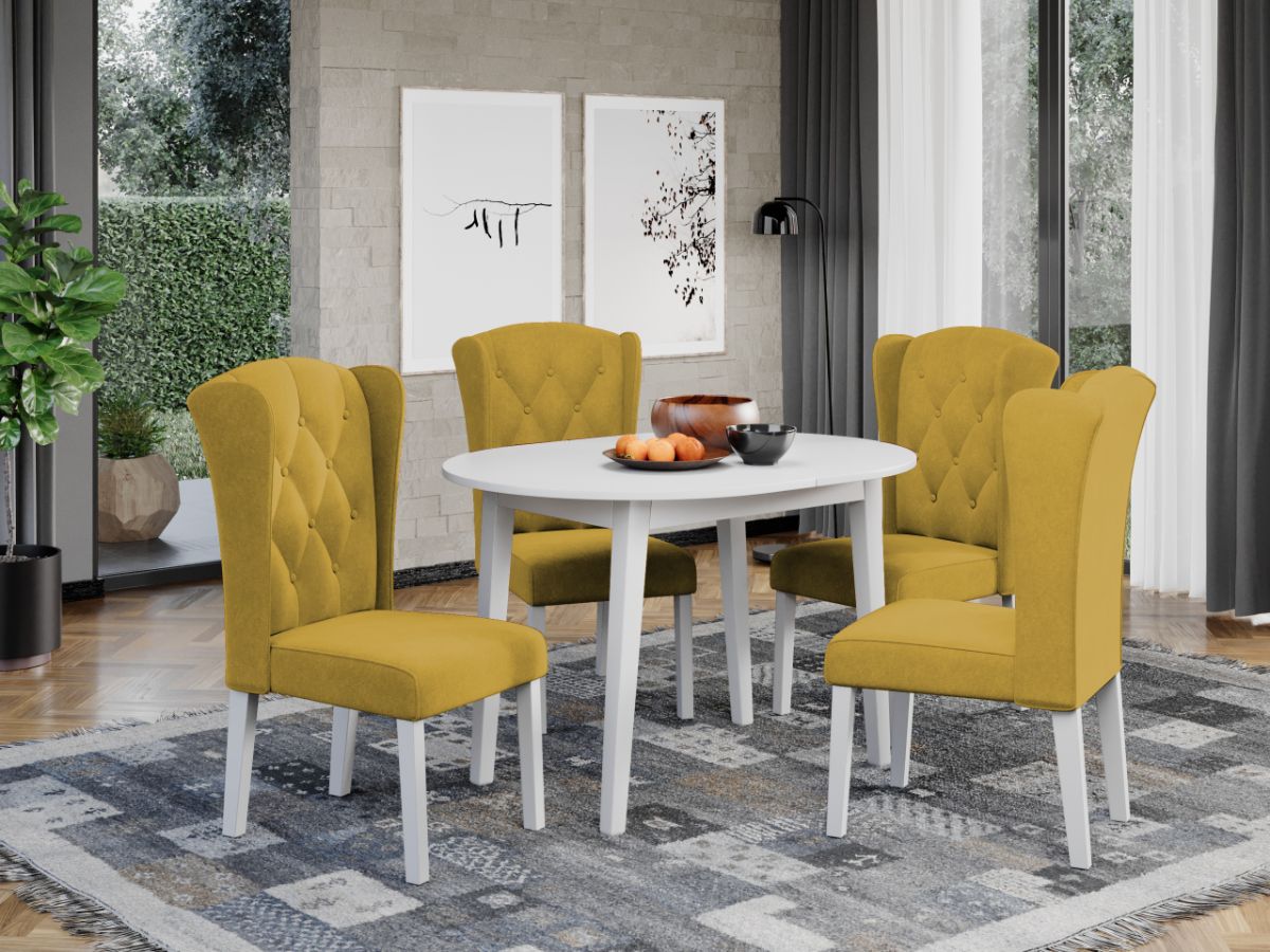 Masa Rosa Alba extensibila Blatul este  alb din MDF , rezistent la umezeala cu o grosime generoasa de 18 mm . Acesta are colturi rotunjite care pe langa aspectul unic ajuta si la un spatiu suplimentar in camera, prevenirea loviturilor cat si posibilitatea de amplasare a scaunelor pe colt atunci cand aveti un numar mai mare de invitati. Picioarele sunt din  lemn de fag masiv, slefuit si vopsit in alb. Acestea ofera o rezistenta sporita si o durabilitate mare pentru masa. Dimensiuni masa inchisa: Lungime 120 cm Latime 90 cm Inaltime 77 cm Dimensiuni m asa extinsa: Lungime 160 cm Latime 90 cm Inaltime 77 cm   Scaun Atena Havana 65 x 4 bucati Scaun Atena Havana 65 – Adauga o nota romantica a meselor savurate alaturi de cei dragi. Scaunul Atena se va potrivi de minune sufrageriei sau bucatariei tale. Structura este din lemn masiv de fag. Picioarele sunt din lemn masiv vopsit alb . Spatarul si sezutul sunt tapitate complet cu stofa de calitate superioara, placuta la atingere si cu posibilitatea unei curatari usoare. Dimensiuni Scaun Atena: Dimensiuni totale: 53 x 52 x 106 cm (L x A x I) Dimensiuni sezut: 43 x 47 cm Set Masa Rosa extensibila + 4 Scaune Atena Havana 65 Esti in cautarea unor produse de calitate pentru locuinta sau spatiul tau? Mobila Laguna iti pune la dispozitie produsul Set Masa Rosa extensibila + 4 Scaune Atena Havana 65 spre vanzare online. Pe aceasta pagina puteti gasi pretul si toate detaliile care va intereseaza. In cazul in care aveti intrebari suplimentare ne puteti contacta si va ajutam cu mare placere. Detalii produs Produsul   este realizat din materiale de calitate, atent alese si testate de echipa Mobila Laguna. Punem accent pe detalii si suntem foarte exigenti pentru rezultate care sa tinda spre perfectiune. Am echilibrat raportul dintre calitate si pret astfel incat sa va puteti bucura de produs   la un cost avantajos. Infiintata in 1994, Laguna Serv este astazi unul dintre producatorii cunoscuti din Romania. Am ajuns aici ghidati de echilibrul perfect dintre calitatea si preturile avantajoase ale pieselor de mobilier tapitate pentru care atelierul nostru garanteaza rezistenta si functionalitatea. Nu te-ai convins inca? Viziteaza una din locatiile Mobila Laguna din Romania pentru a vedea produsele noastre, vezi lista de locatii . Ne puteti vizita si pe pagina de facebook pentru a putea vedea oferte si noutati. Mai multe detalii legate de cum comandati, cum platiti si cum este livrat produsul Set Masa Rosa extensibila + 4 Scaune Atena Havana 65 puteti gasi prin intermediul meniurilor din aceasta pagina, sau ne puteti contacta telefonic sau online – mergi la pagina de contact ATENTIE: Imaginile sunt cu titlu de prezentare, in functie de modul in care au fost pozate sau proiectate 3D si de tipul ecranului dumeavoastra, pot diferi culorile / nuantele sau anumite detalii .