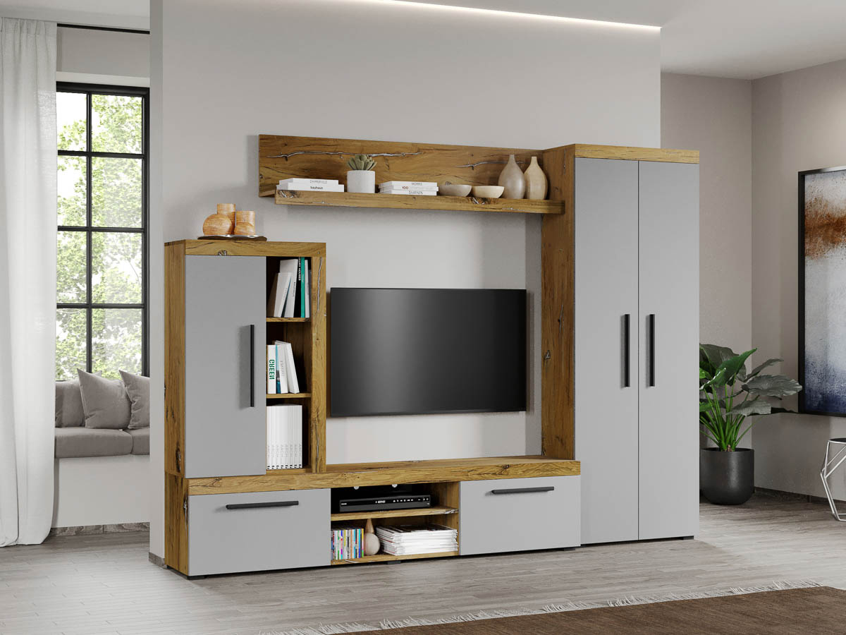 Set Mobilier Living Gri cu Flagstaff-Atena-C01 Set Mobilier Living Gri cu Flagstaff-Atena-C01 oferă numeroase avantaje și răspunde nevoilor clienților noștri. Deține spații de depozitare încăpătoare și practice pentru obiectele destinate sufrageriei, cât și pentru haine. Acest mobilier îmbunătățește încăperea din punct de vedere funcțional, dar și din punct de vedere estetic. Combinația dintre Gri și Flagstaff adaugă un farmec unic camerei și contribuie la crearea unei atmosfere primitoare în orice locuință. Specificații: Componente: 1 modul suspendat (polița) și 3 la sol (comoda înaltă, o comodă TV și dulapul cu 2 uși ). Accesorii incluse: Feronerie, balamale, mânere și schițe de montaj pentru fiecare corp. Material: PAL melaminat cu grosime de 16 mm. Finisaje: Gri Pietriș, Flagstaff Oak. Tip corpuri: Modulare (pot fi poziționate în ordinea dorită). Diagonală TV recomandată: 189 cm/75″ *Elementele de suspendare a corpurilor pe perete nu sunt incluse! Atenție! Costul produsului nu include accesorii sau elemente decorative suplimentare, precum tablouri, lămpi, lenjerii de pat sau covoare. *Scopul fotografiilor este de a oferi o reprezentare generală, însă există posibilitatea unor mici variații de culoare. Dimensiuni exterioare: Lățime: 247,6 cm Adâncime: 35,2 cm Înălțime: 182 cm Corpuri, dimensiuni și schițe de montaj: *Dimensiunile sunt exprimate în centimetri! Comodă TV: L 180 x A 35.2 x H 39.8 cm – Descarcă schița de montaj. Comodă înaltă: L 60 x A 30.4 x H 96.8 cm – Descarcă schița de montaj. Dulap cu două uși : L 67.6 x A 30.4 x H 182 cm – Descarcă schița de montaj. Poliță 1390: L 139 x A 21.6 x H 34.8 cm – Descarcă schița de montaj. *Dimensiunile produsului pot varia cu ± 10 mm. *Produsul se expediază în colete, demontat și este însoțit de toate accesoriile și schița de montaj aferentă.