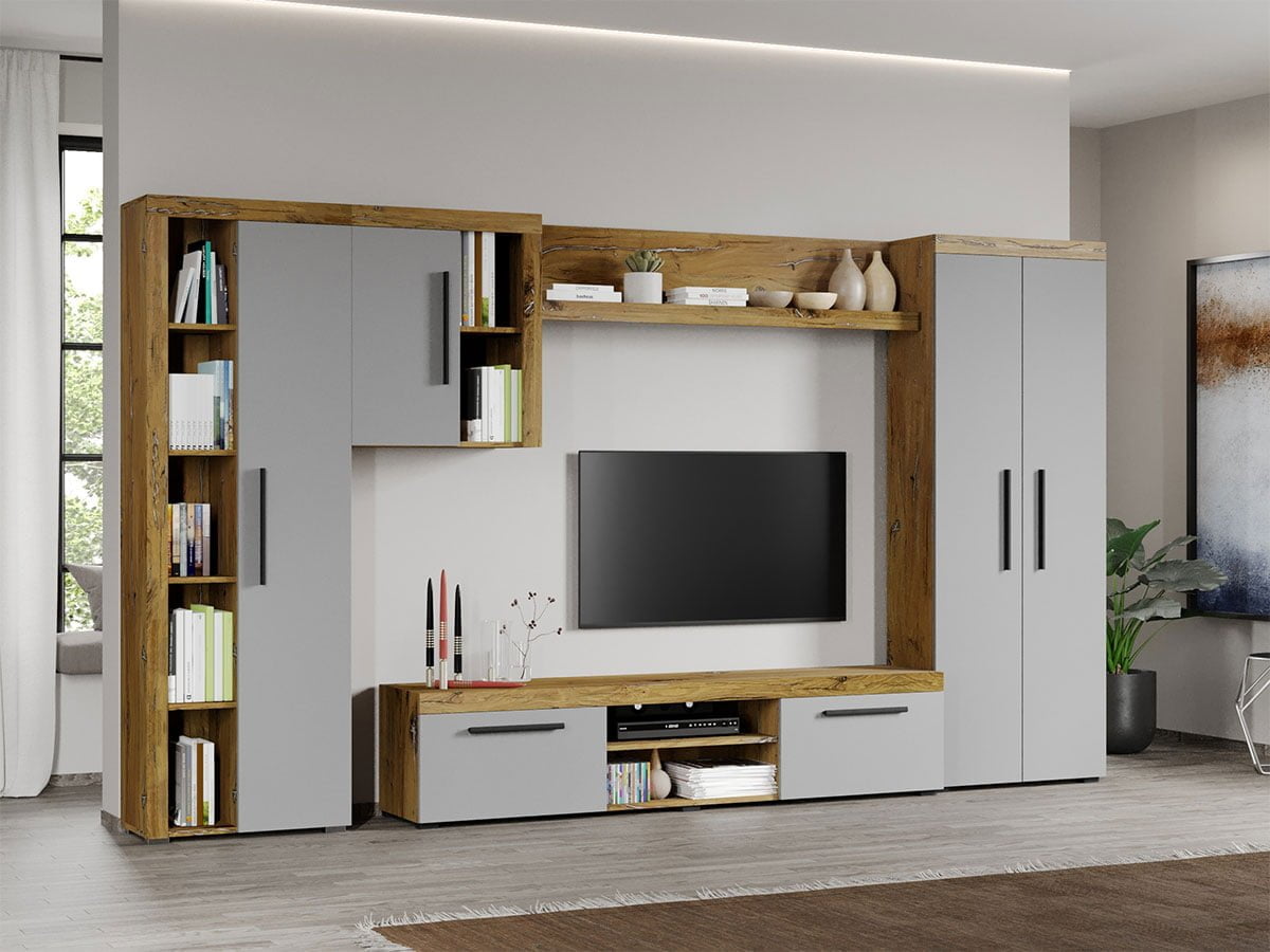 Set Mobilier Living Gri cu Flagstaff-Atena-C16 oferă numeroase avantaje și răspunde nevoilor clienților noștri. Deține spații de depozitare încăpătoare și practice pentru obiectele destinate sufrageriei, cât și pentru haine. Acest mobilier îmbunătățește încăperea din punct de vedere funcțional, dar și din punct de vedere estetic. Combinația dintre Gri și Flagstaff adaugă un farmec unic camerei și contribuie la crearea unei atmosfere primitoare în orice locuință. Specificații: Componente: 2 module suspendate (polița și corp suspendat) și 3 la sol (o comodă TV, un dulap cu o ușă și un dulap cu 2 uși ). Accesorii incluse: Feronerie, balamale, mânere și schițe de montaj pentru fiecare corp. Material: PAL melaminat cu grosime de 16 mm. Finisaje: Gri Pietriș, Flagstaff Oak. Tip corpuri: Modulare (pot fi poziționate în ordinea dorită). Diagonală TV recomandată: 189 cm/75″ *Elementele de suspendare a corpurilor pe perete nu sunt incluse! Atenție! Costul produsului nu include accesorii sau elemente decorative suplimentare, precum tablouri, lămpi, lenjerii de pat sau covoare. *Scopul fotografiilor este de a oferi o reprezentare generală, însă există posibilitatea unor mici variații de culoare. Dimensiuni exterioare: Lățime: 326,6 cm Adâncime: 35,2 cm Înălțime: 182 cm Corpuri, dimensiuni și schițe de montaj: *Dimensiunile pentru Set Mobilier Living Gri cu Flagstaff-Atena-C16: Comodă TV: L 180 x A 35.2 x H 39.8 cm – Descarcă schița de montaj. Corp Suspendat: L 60 x A 30.4 x H 69.8 cm – Descarcă schița de montaj. Dulap cu două uși : L 67.6 x A 30.4 x H 182 cm – Descarcă schița de montaj. Dulap cu o ușă : L 60 x A 30.4 x H 182 cm – Descarcă schița de montaj. Poliță 1390: L 139 x A 21.6 x H 34.8 cm – Descarcă schița de montaj. *Dimensiunile produsului pot varia cu ± 10 mm. *Produsul se expediază în colete, demontat și este însoțit de toate accesoriile și schița de montaj aferentă.