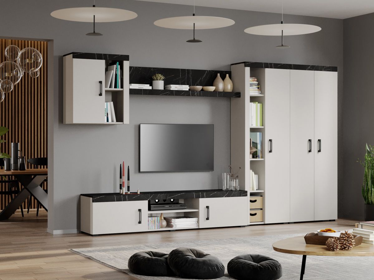 Soldat 1 usa Melo In prezentare puteti vedea compartimentarea corpului de living Soldat 1 usa Melo. Are 10 spatii de depozitare, 5 din acestea fiind inchise cu usa, unde puteti depozita obiecte ce nu doriti sa se vada si 5 spatii deschise. Poate fi folosit ca si corp unic sau combinat cu alte corpuri din familia Melo. Latime: 60 cm Adancime: 30.4 cm Inaltime: 182 cm Combinatia intre finisajele Alb si Negru Piatra impreuna cu manerul negru creeaza un aspect deosebit in orice casa. DESCARCA SCHITA MONTAJ Pretul afisat nu include alte accesorii sau obiecte de decor (TV, tablouri, elemente de iluminat, covor etc.) Dimensiunile sunt exprimate in cm si pot oscila intre ± 10 mm. Produsul se livreaza demontat si este insotit de accesorii si instructiuni de asamblare. Soldat 1 usa Melo Livrare gratuita si rapida, 4-10 zile lucratoare prin flota proprie Suntem producatori de mobilier, fara intermediari Toate piesele de mobilier au o garantie de 2 ani Soldat 1 usa Melo face parte din familia de mobila pentru sufragerie / living Melo. Aceasta colectie are un aspect modern si este alcatuita din mai module. Puteti alege direct din configuratiile realizate de noi sau daca doriti puteti creea singuri propria configuratie de living combinand din corpurile de mobila pentru living. In functie de spatiul unde doriti sa amplasati mobila puteti adapta livingul. Corpurile sunt construite din PAL melaminat de 16mm cu finisaj Alb si Negru Piatra , care creeaza un contrast rafinat si un ambient placut. Cantul aplicat este unul de 0,6 care le permite muchiilor sa fie placute la atingere .