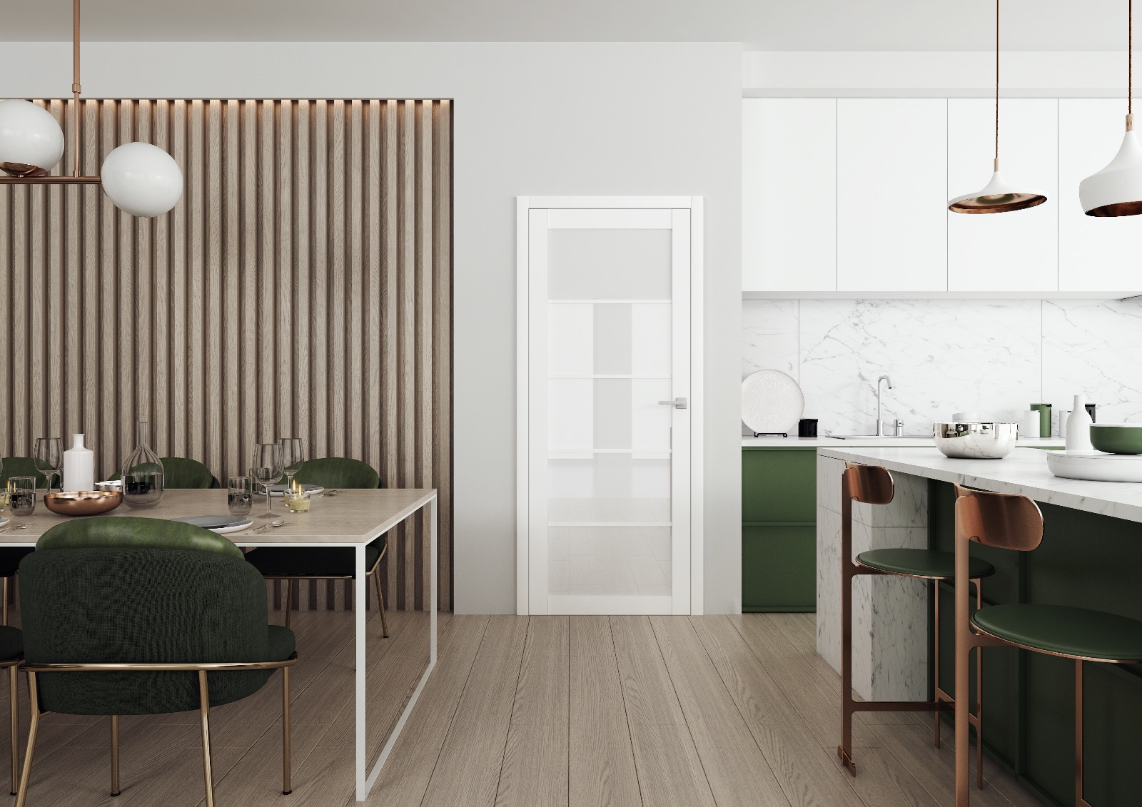 Usi cu sticla securizata, de calitate superioara, finisaj tocuri cu folie suplimentara din polipropilena rezistenta la zgarieturi si abraziune, design deosebit si balamale ascunse.